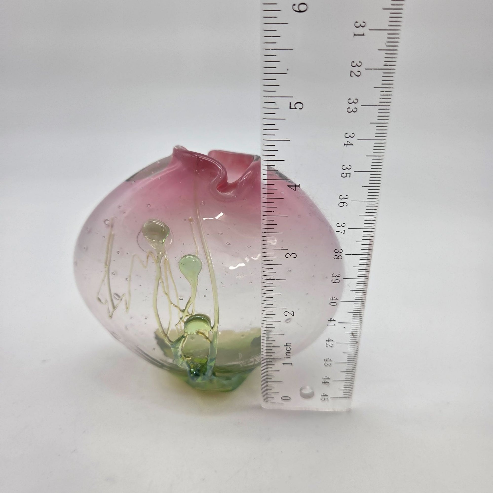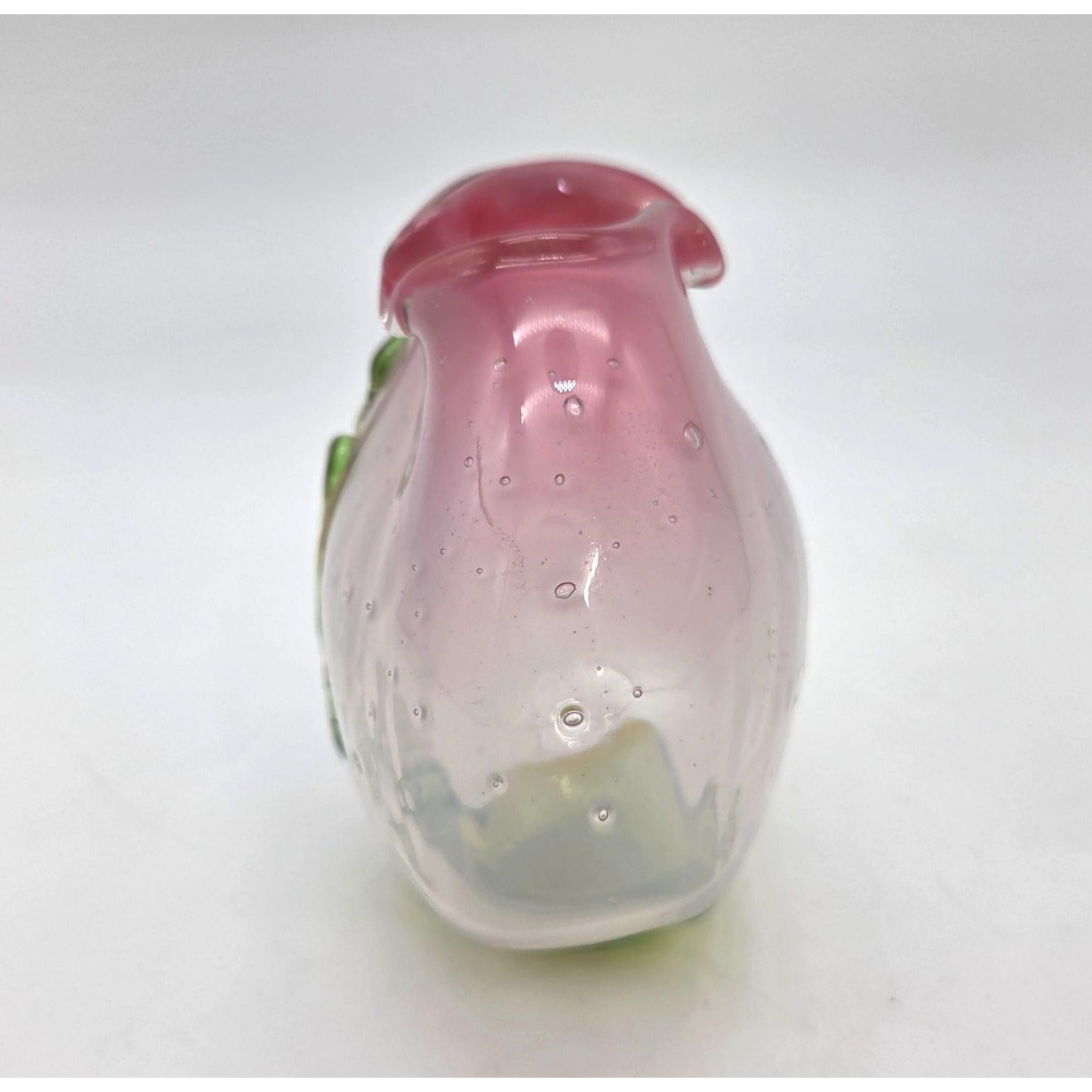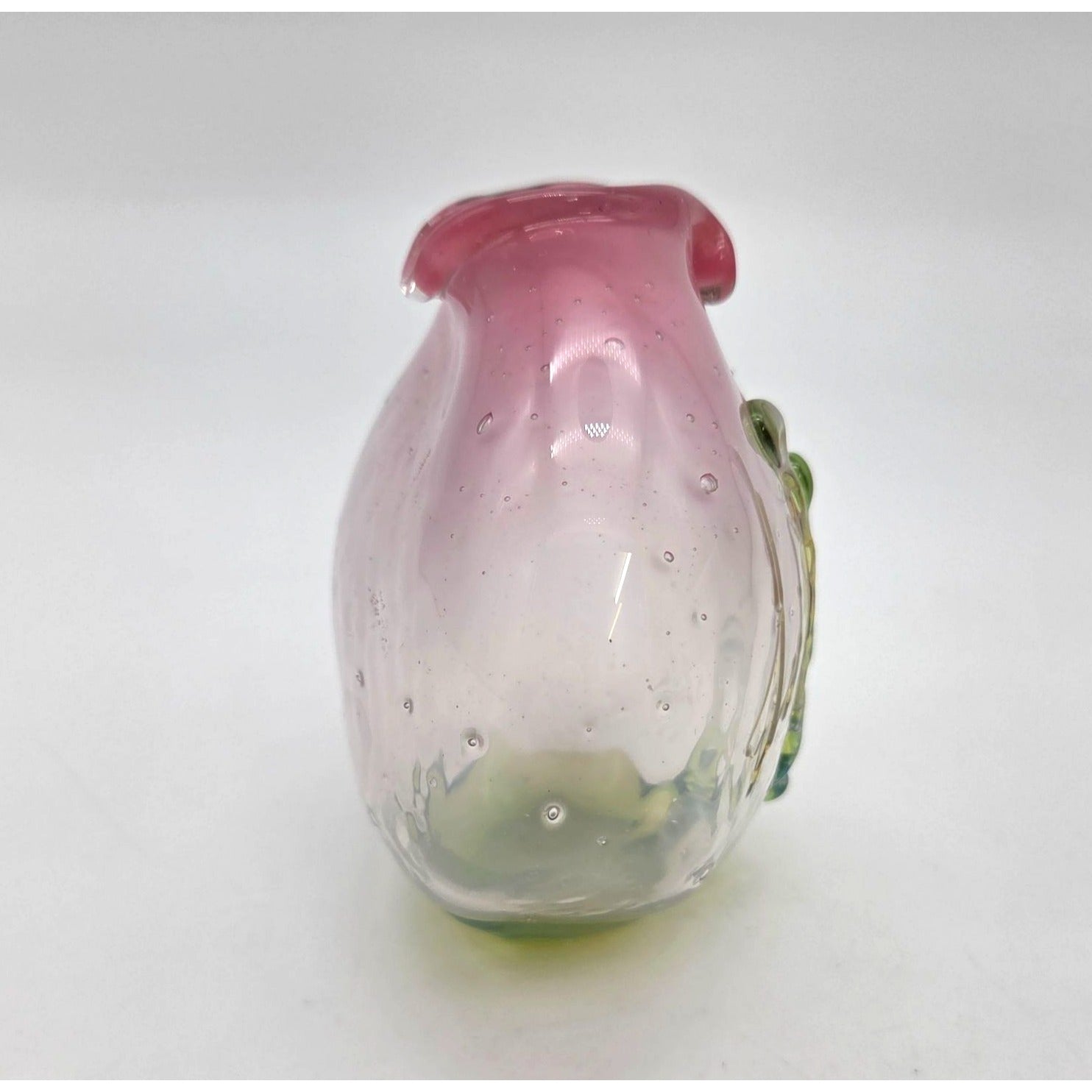 This vintage Loren Chapman handblown glass vase features a delicate pink and green gradient, accented by organic bubbles and a ruffled rim.