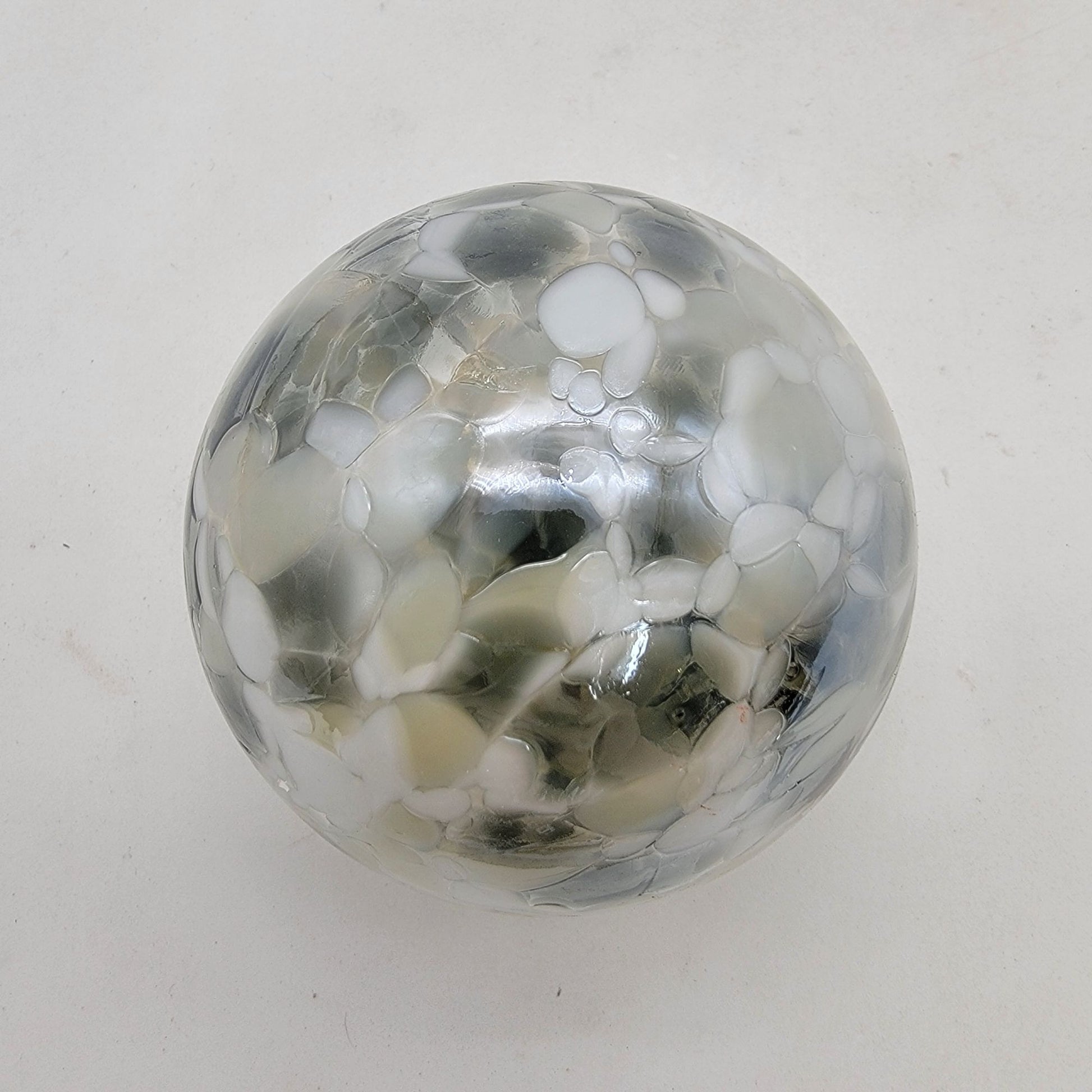 This handcrafted art glass ornament features a sophisticated grey and silver speckled design. Its elegant craftsmanship makes it suitable for curated decor.