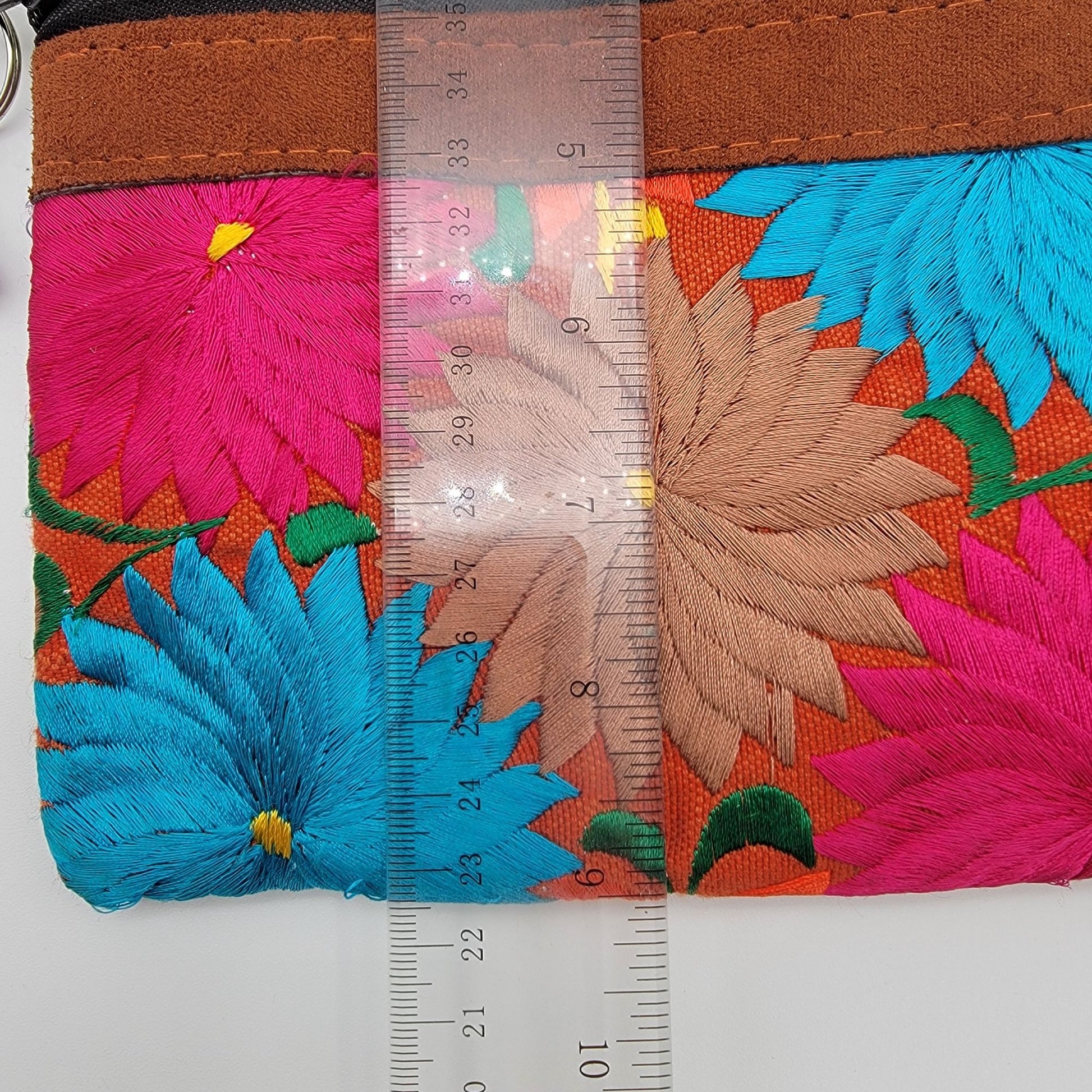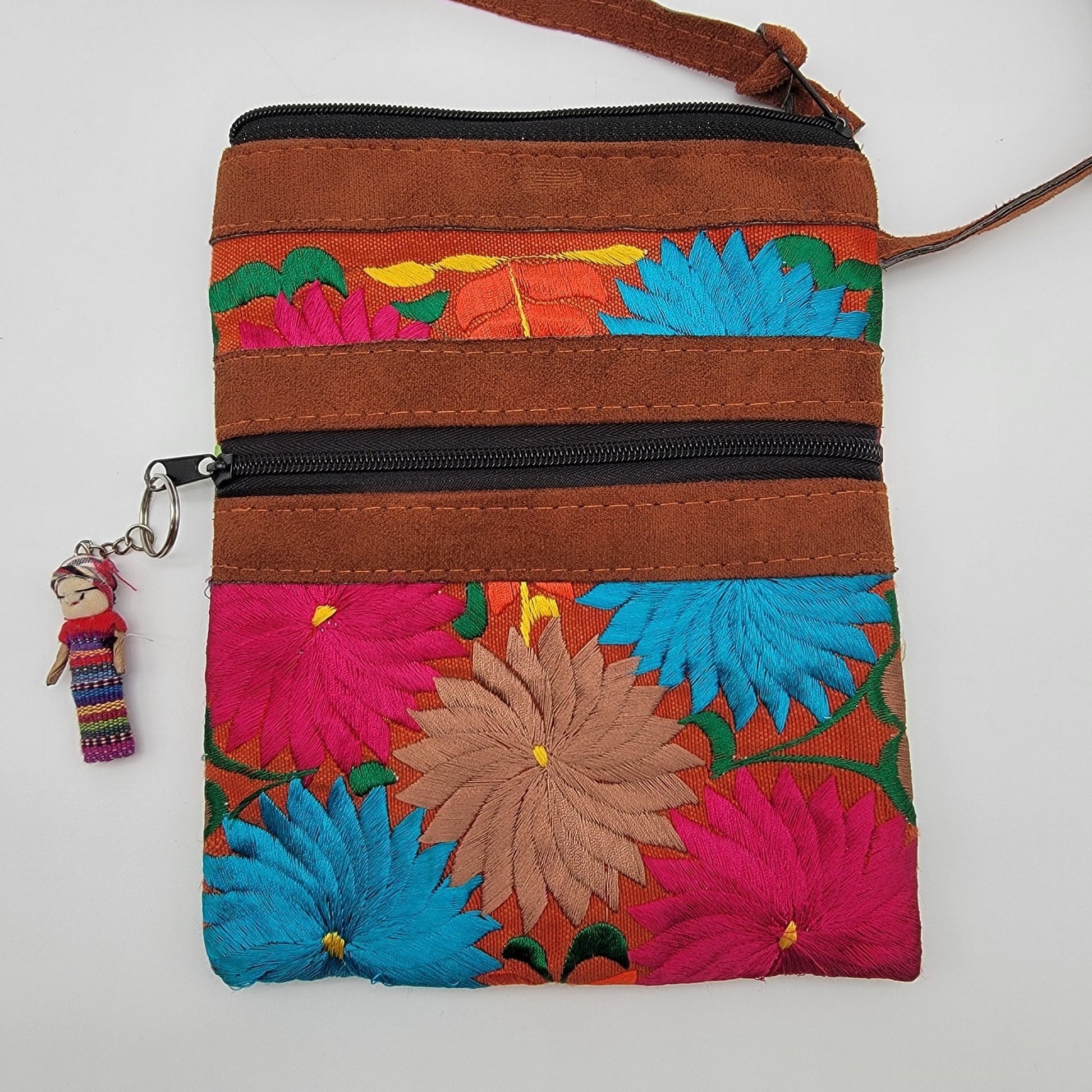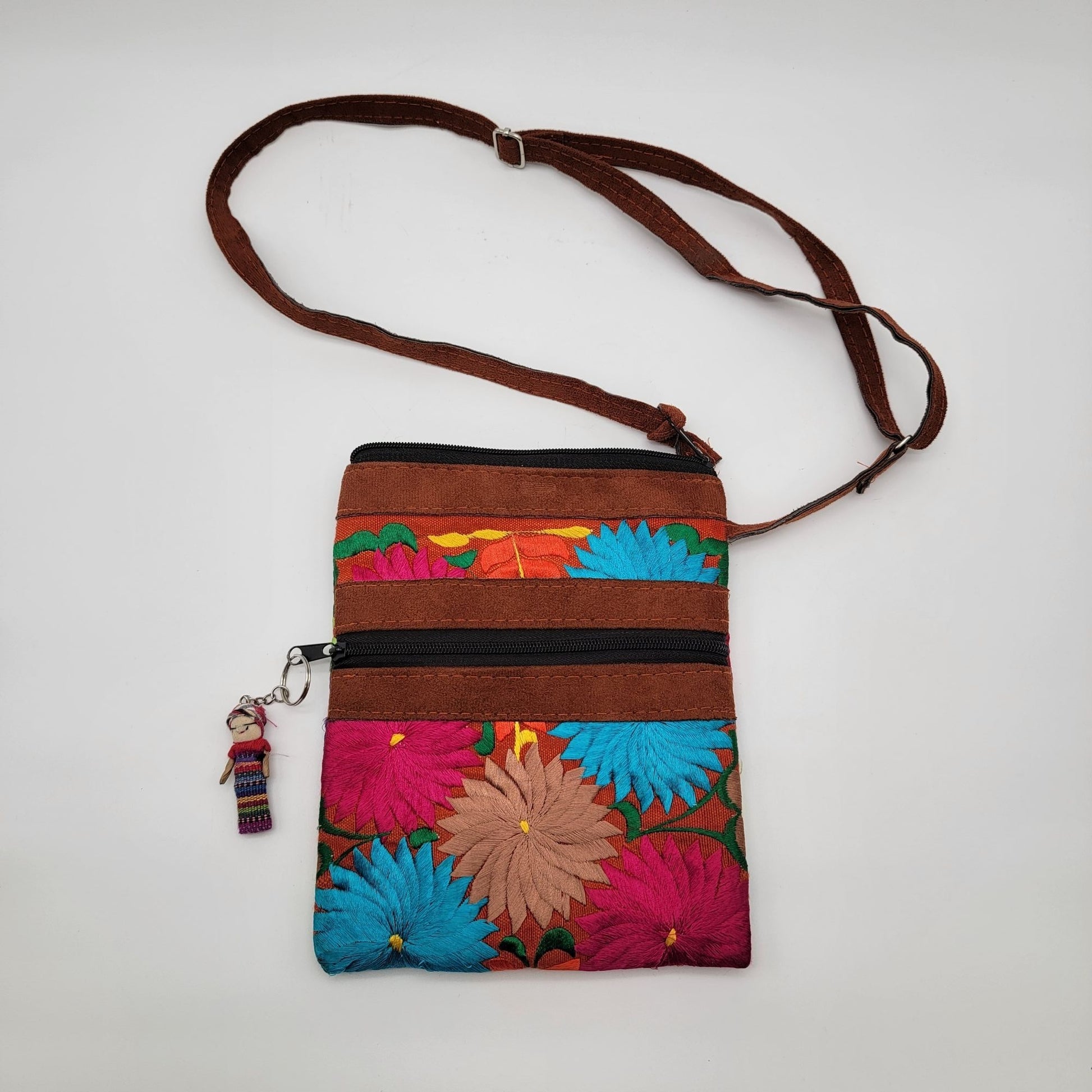 Handcrafted Guatemalan Embroidered Floral & Leather Crossbody Bag Worry Doll Zipper Pull