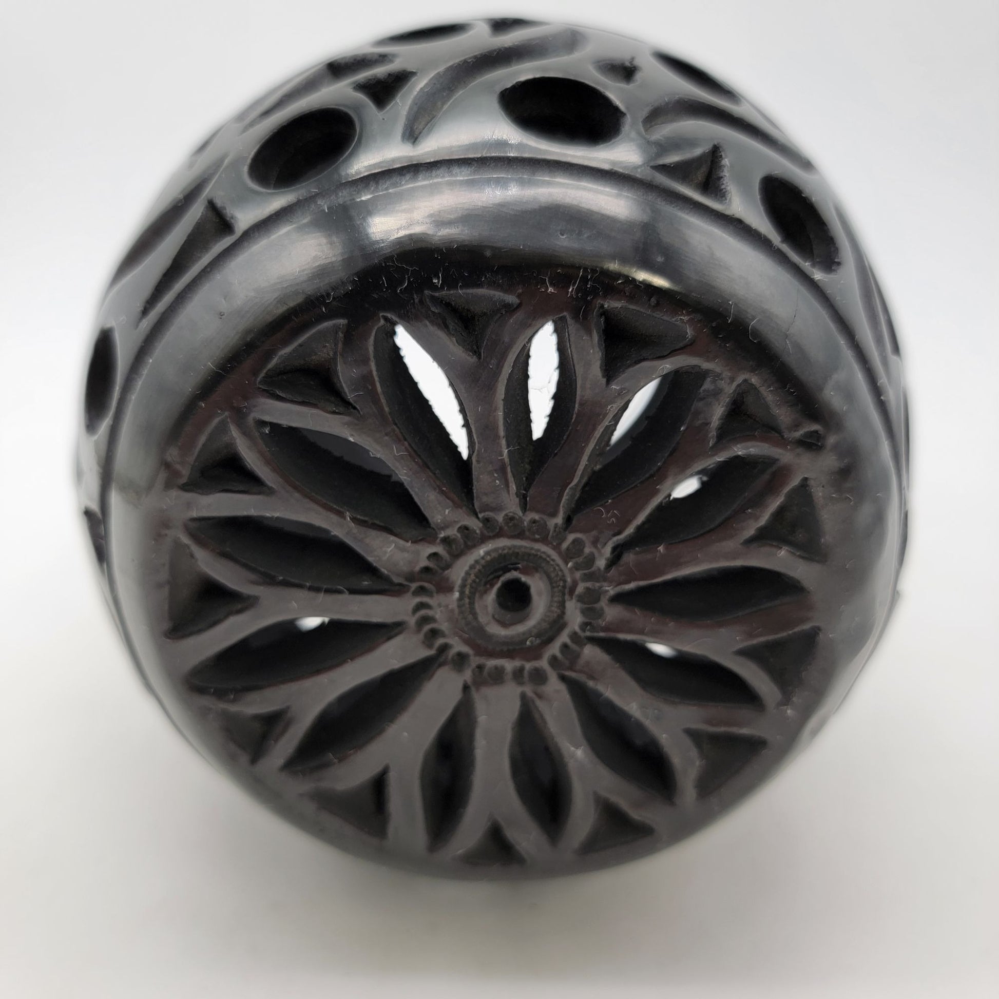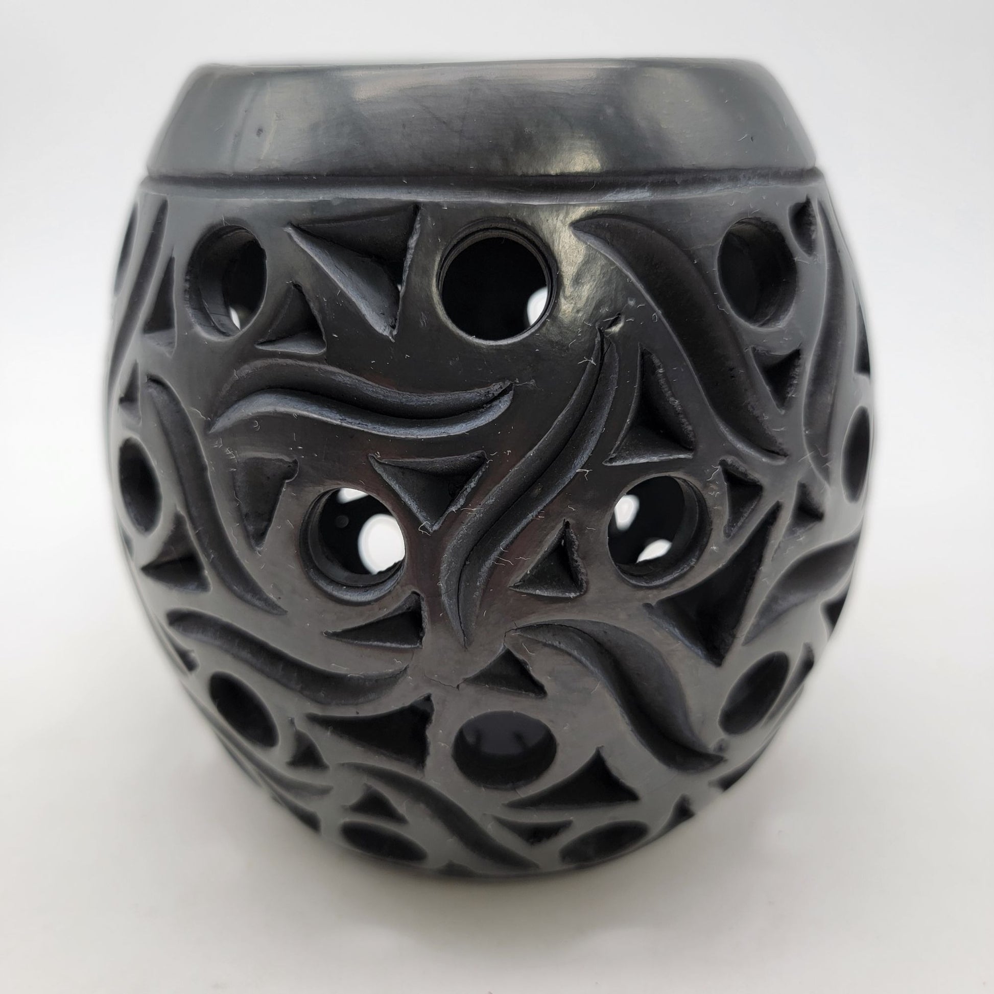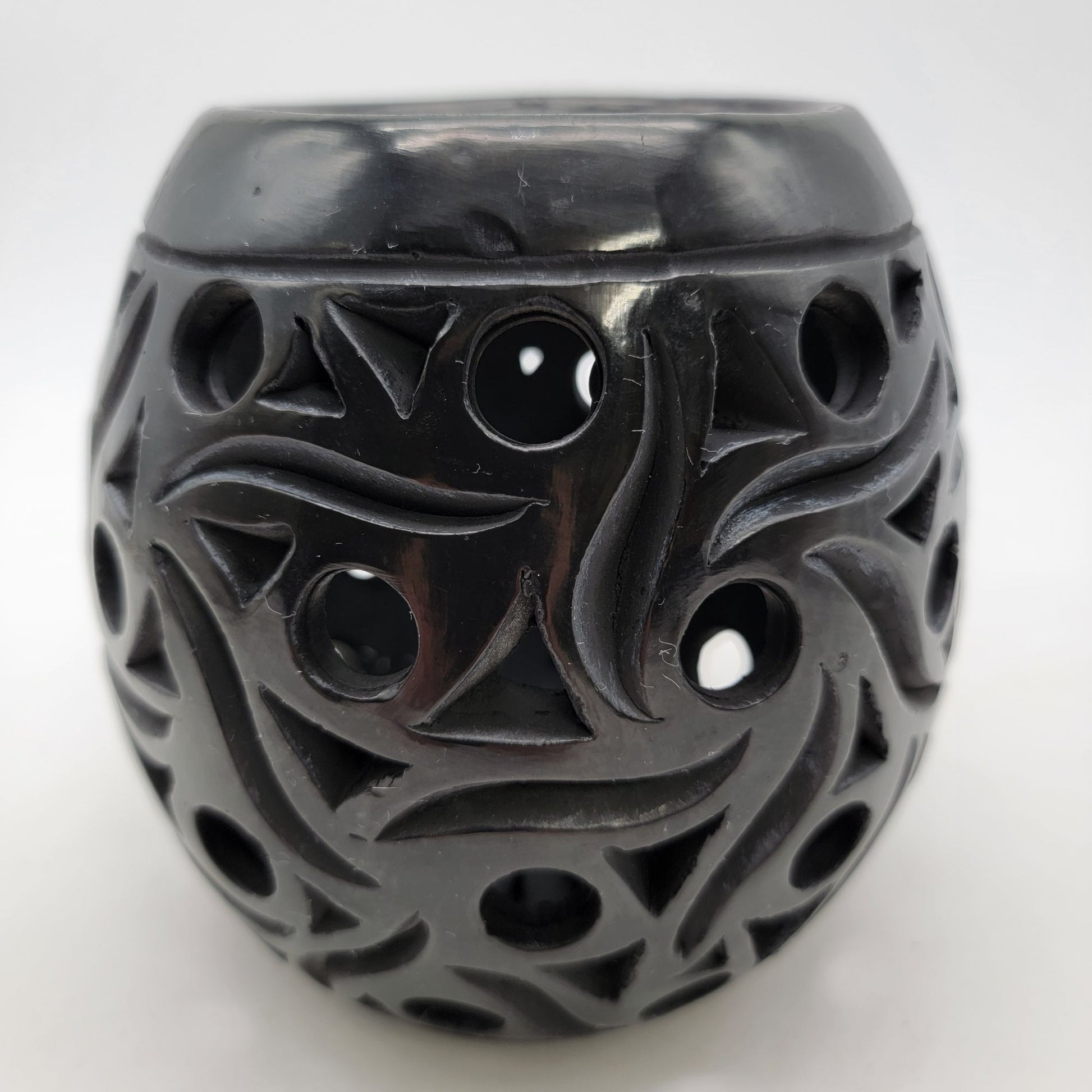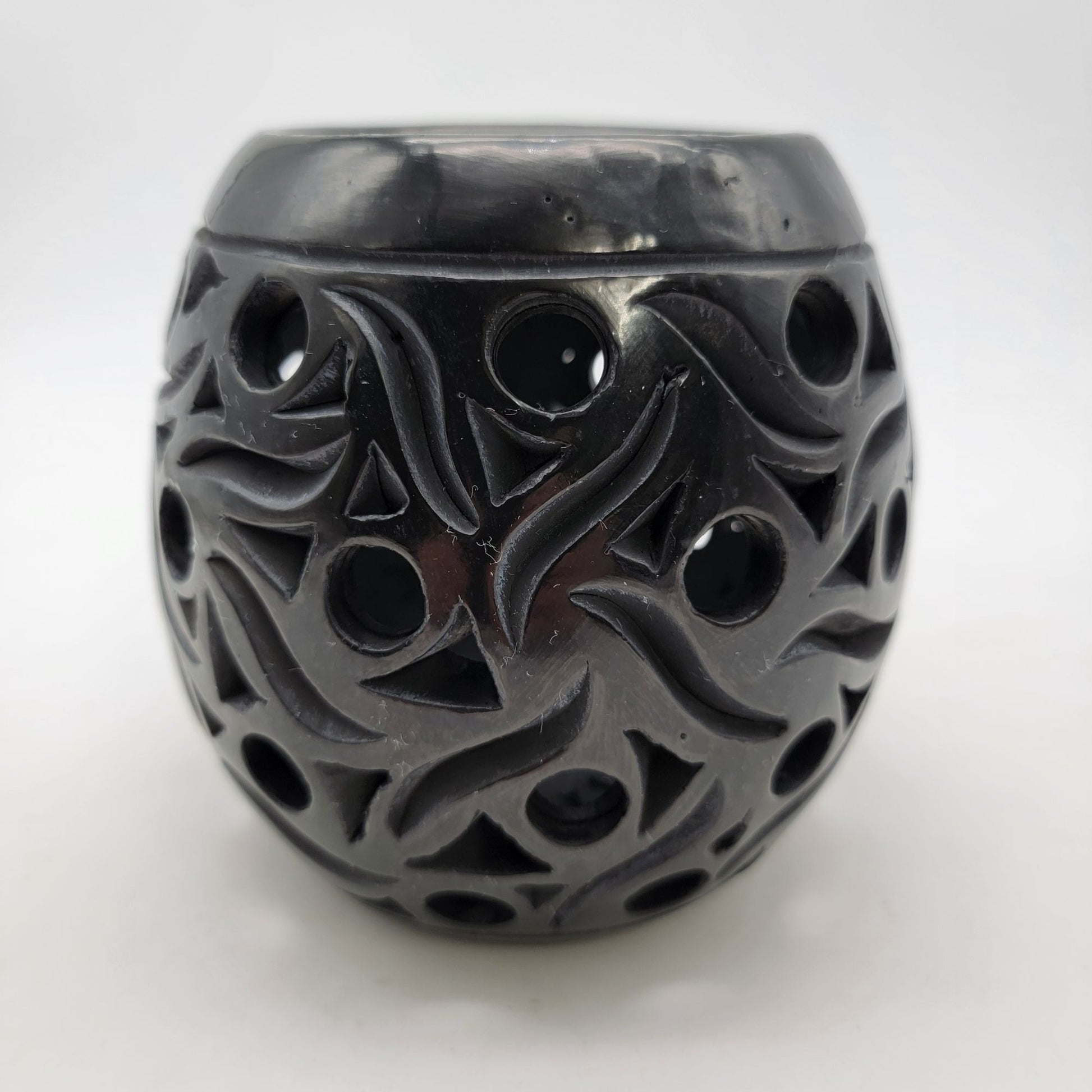 An exquisite piece of traditional Mexican pottery showcasing the renowned black clay artistry of Oaxaca. Delicately hand-carved with an elegant floral motif, this lumiere reveals the skilled craftsmanship of local artisans who transform raw clay into luminous works of art.