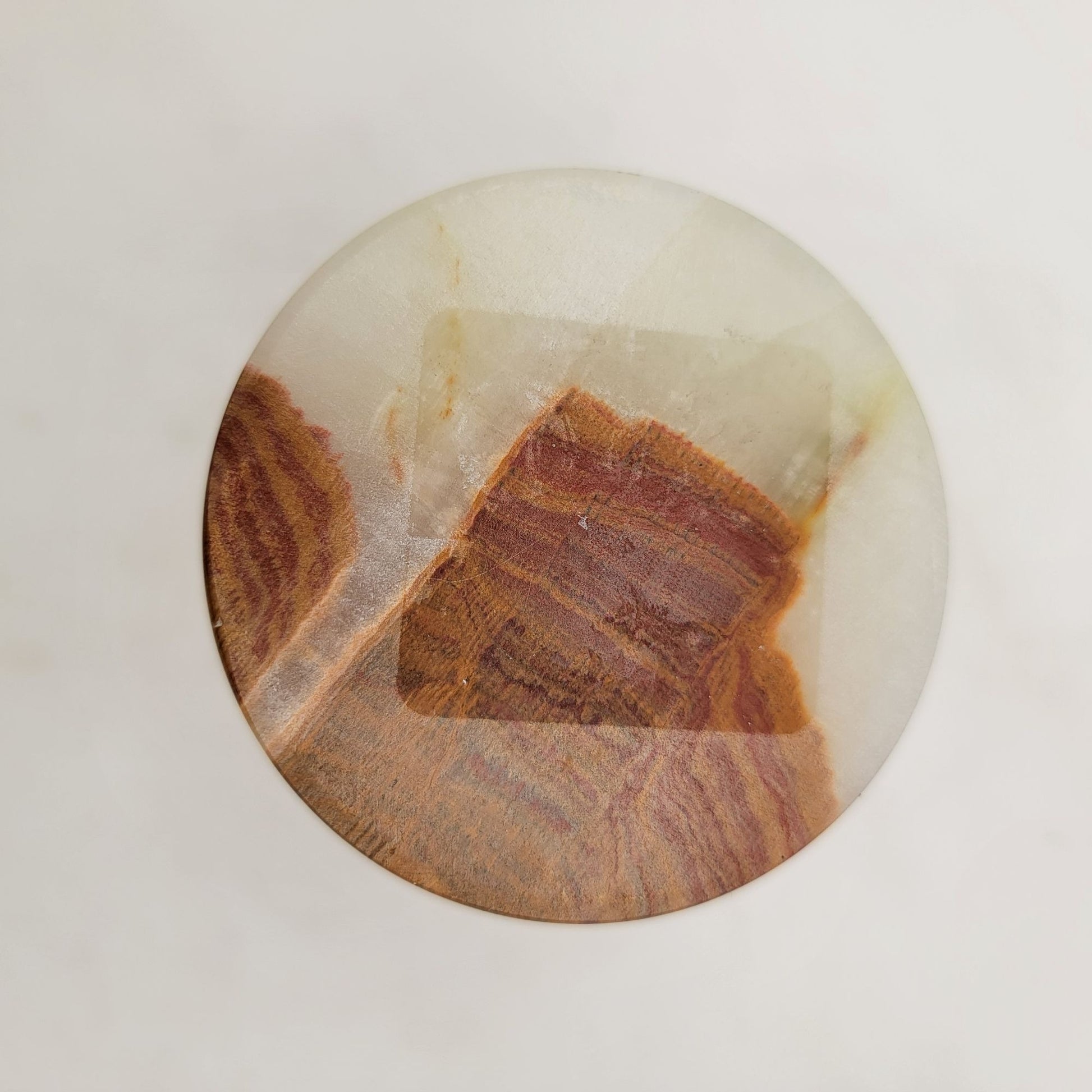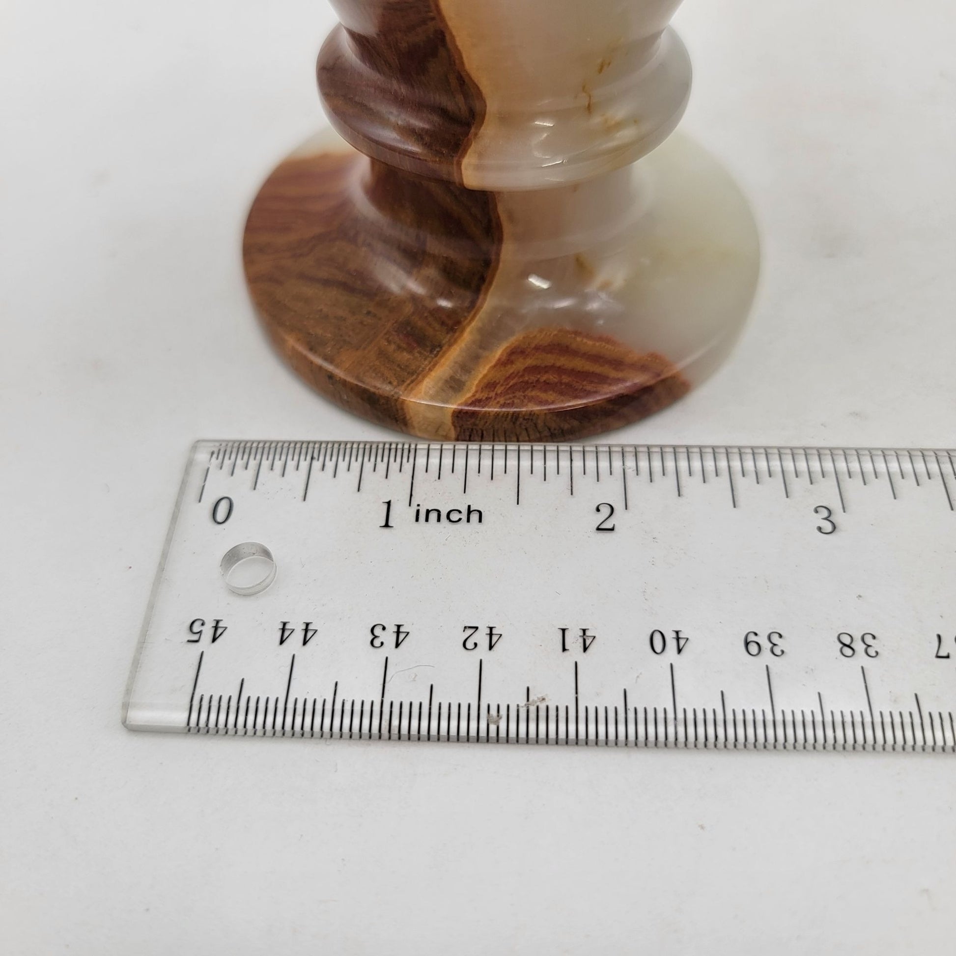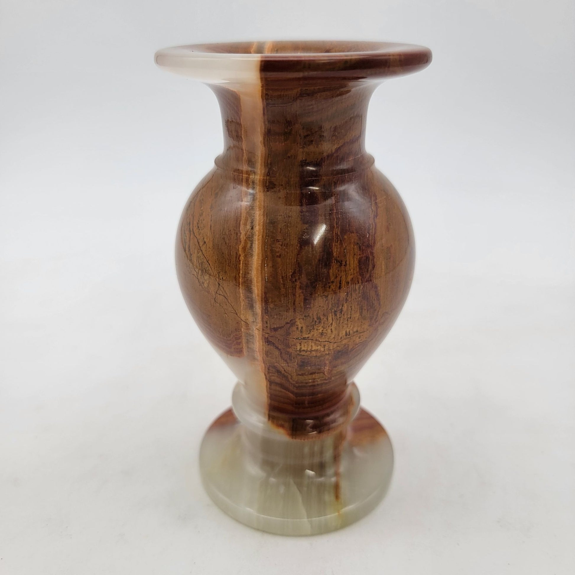 This handcrafted onyx vase offers an elegant way to display small bouquets or as a standalone piece to enhance any interior decor. Its natural stone composition adds a touch of sophistication, while the unique patterns of the onyx contribute a sense of exclusivity and artful beauty to your space.