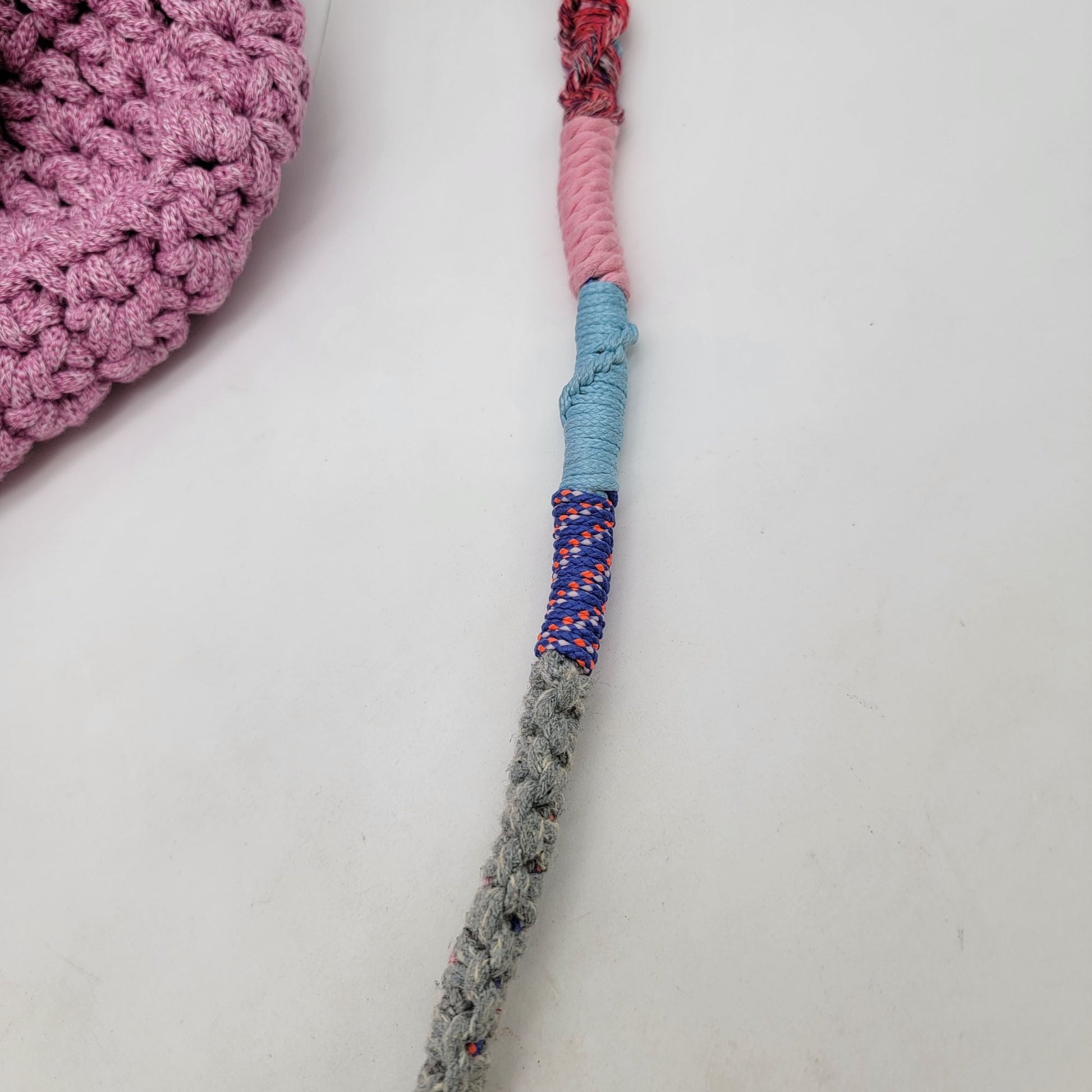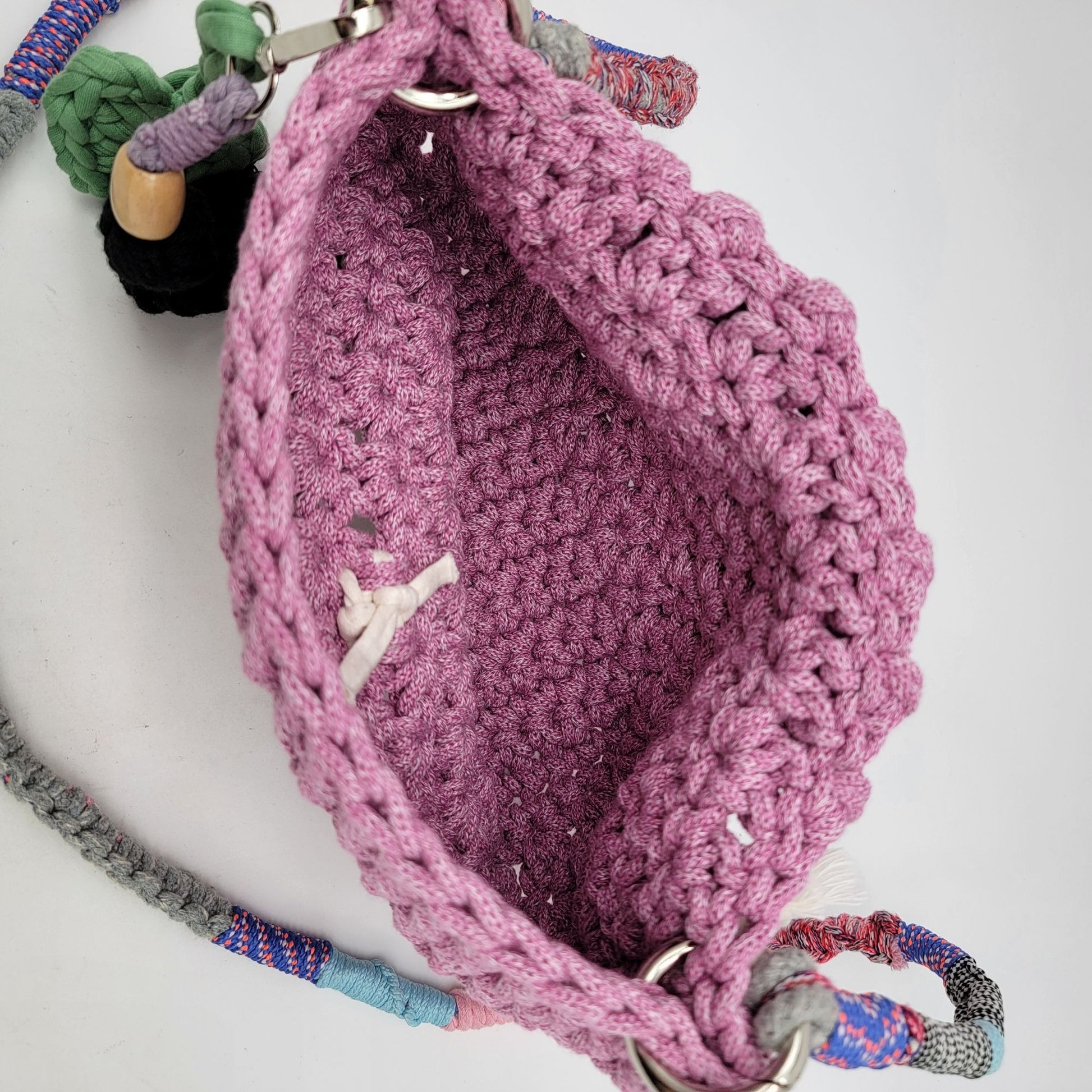 Handcrafted Shooci Crocheted Pink Shoulder Bag With Yarn Wrapped Strap & Tassel Accent