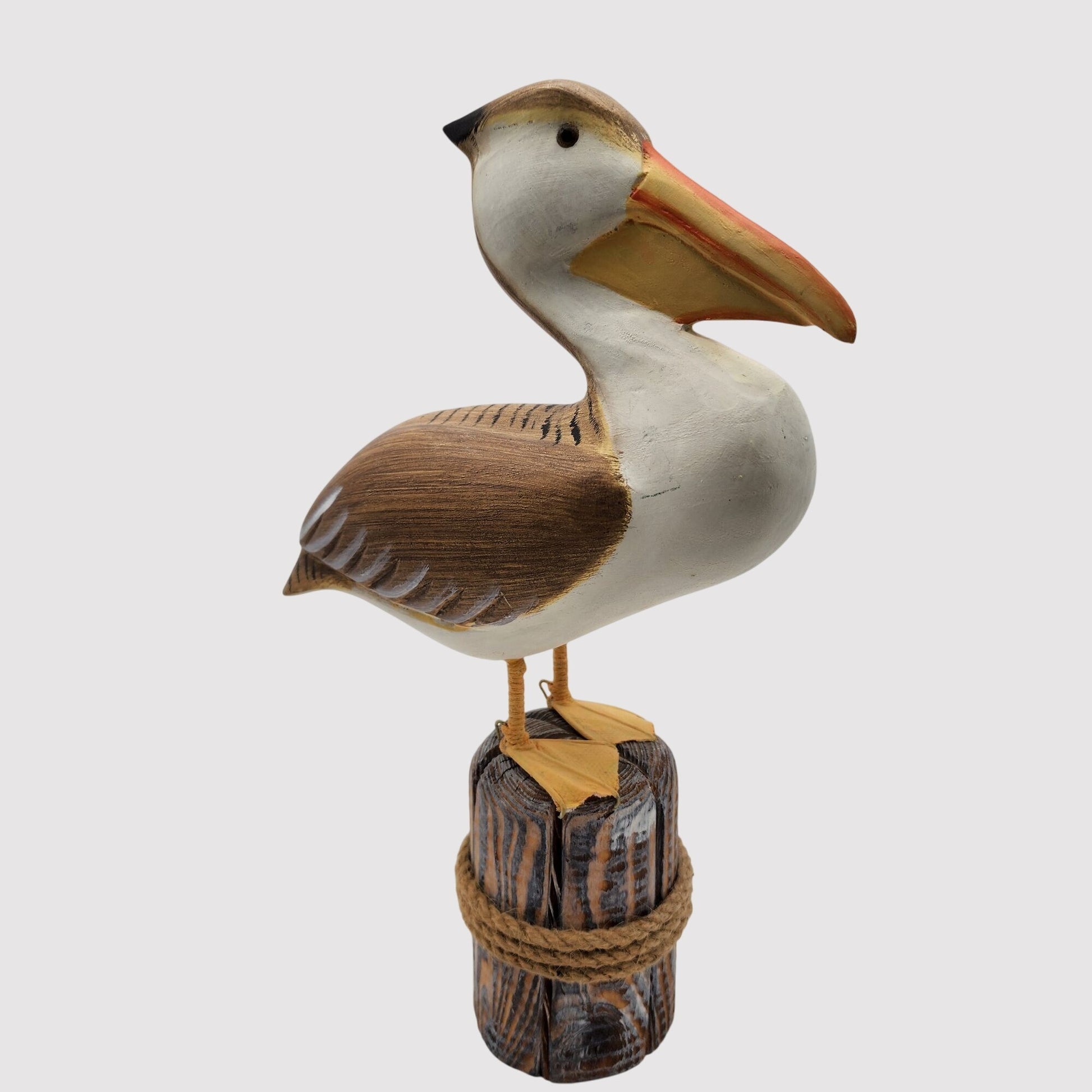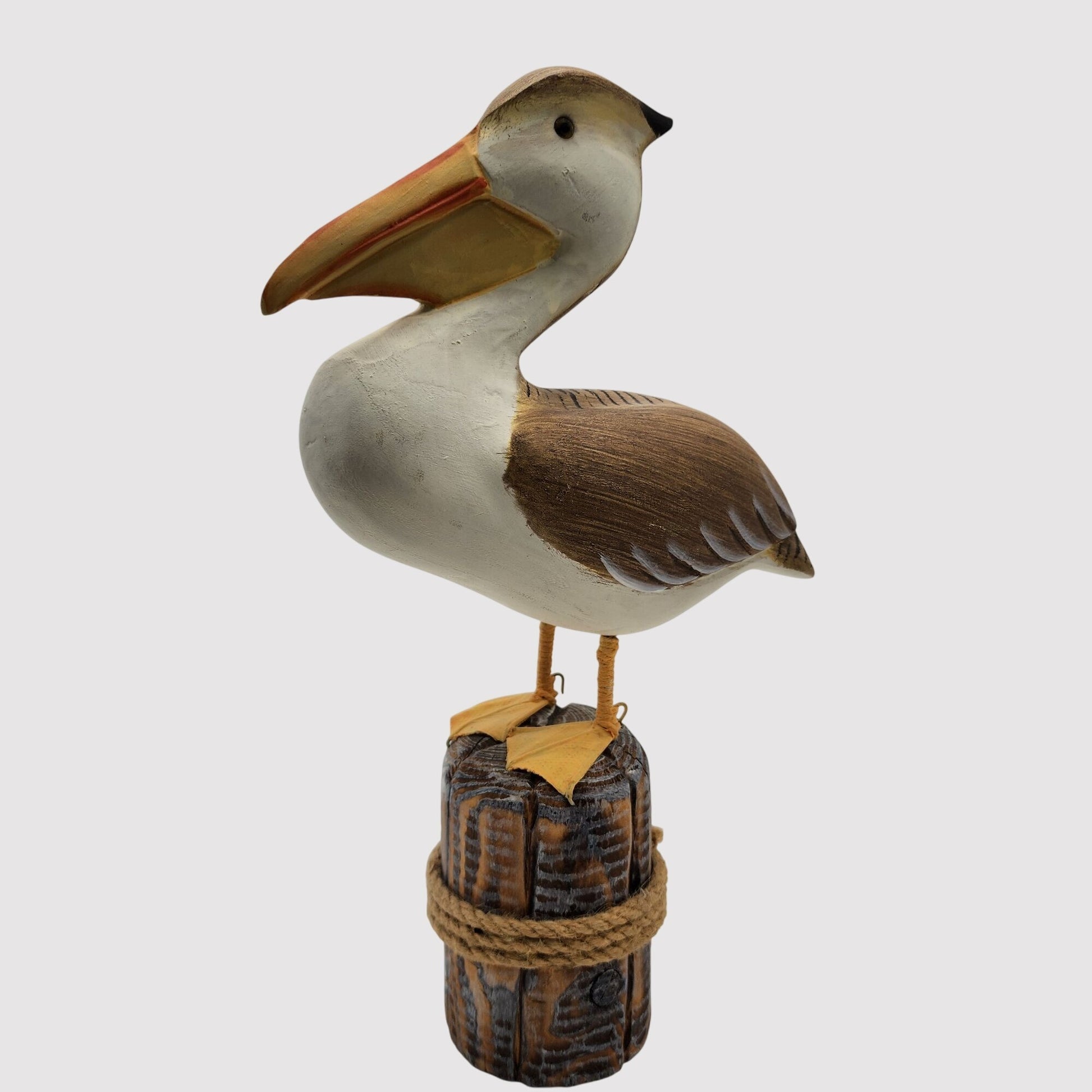This charming wooden pelican statue exudes a rustic nautical appeal, showcasing intricate hand-painted details and a rope-wrapped base. A delightful vintage-inspired decorative piece for coastal enthusiasts or collectors.