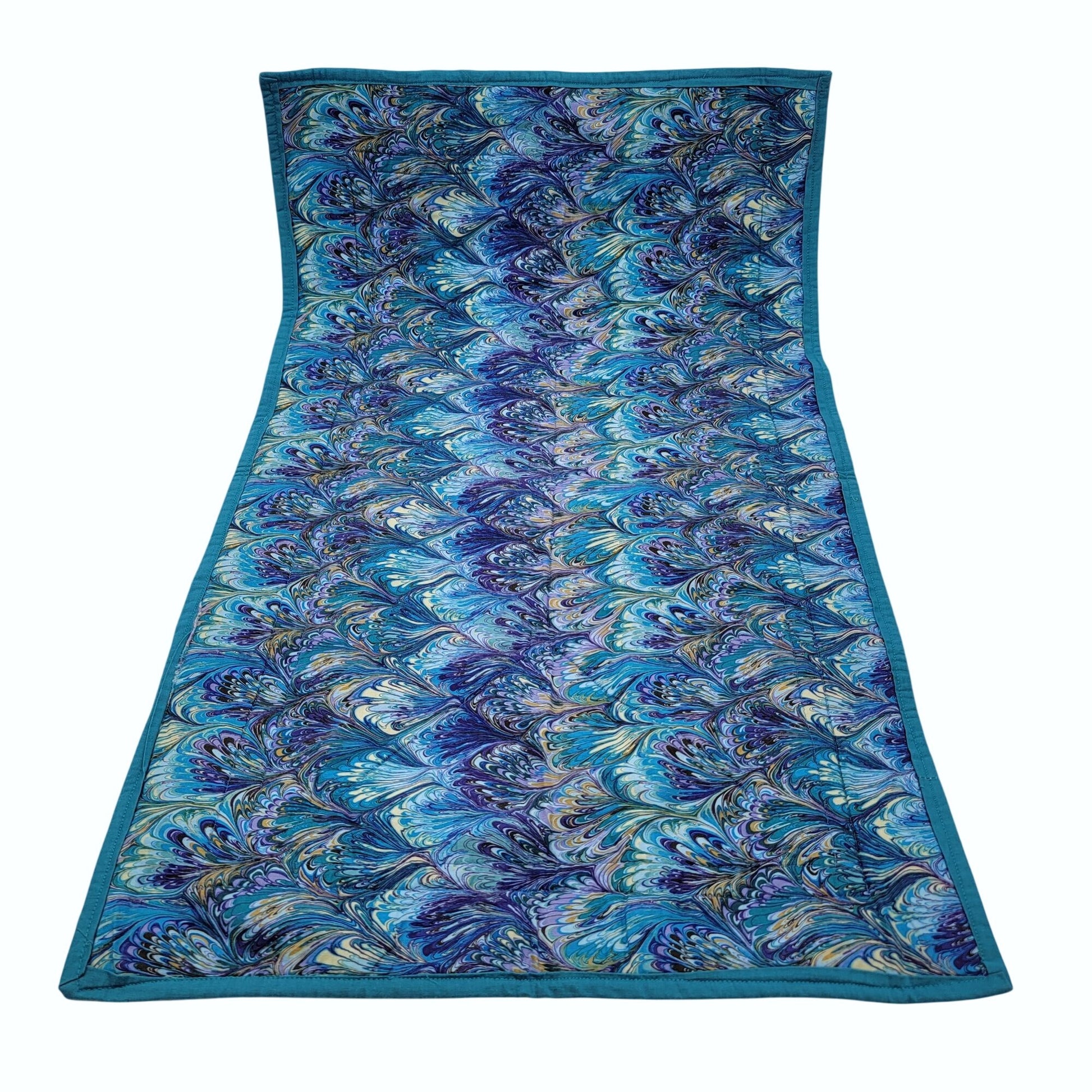 This handmade quilted wall art or table runner serves as a vibrant decorative piece, featuring a reversible design. The front showcases an hourglass pattern with batik fabric, and the back is adorned with a striking marbled pattern. Its craftsmanship and bold colors add character to any space.