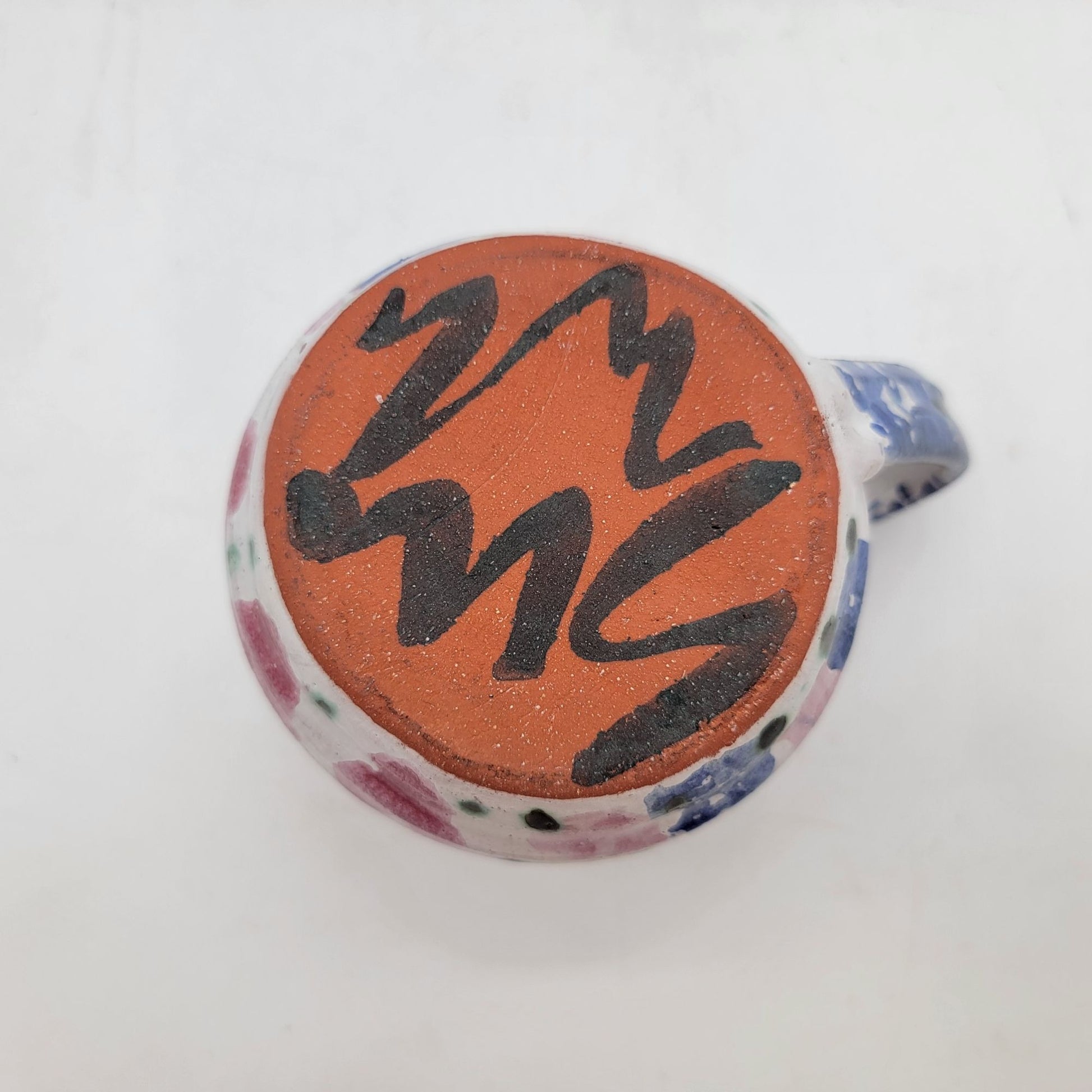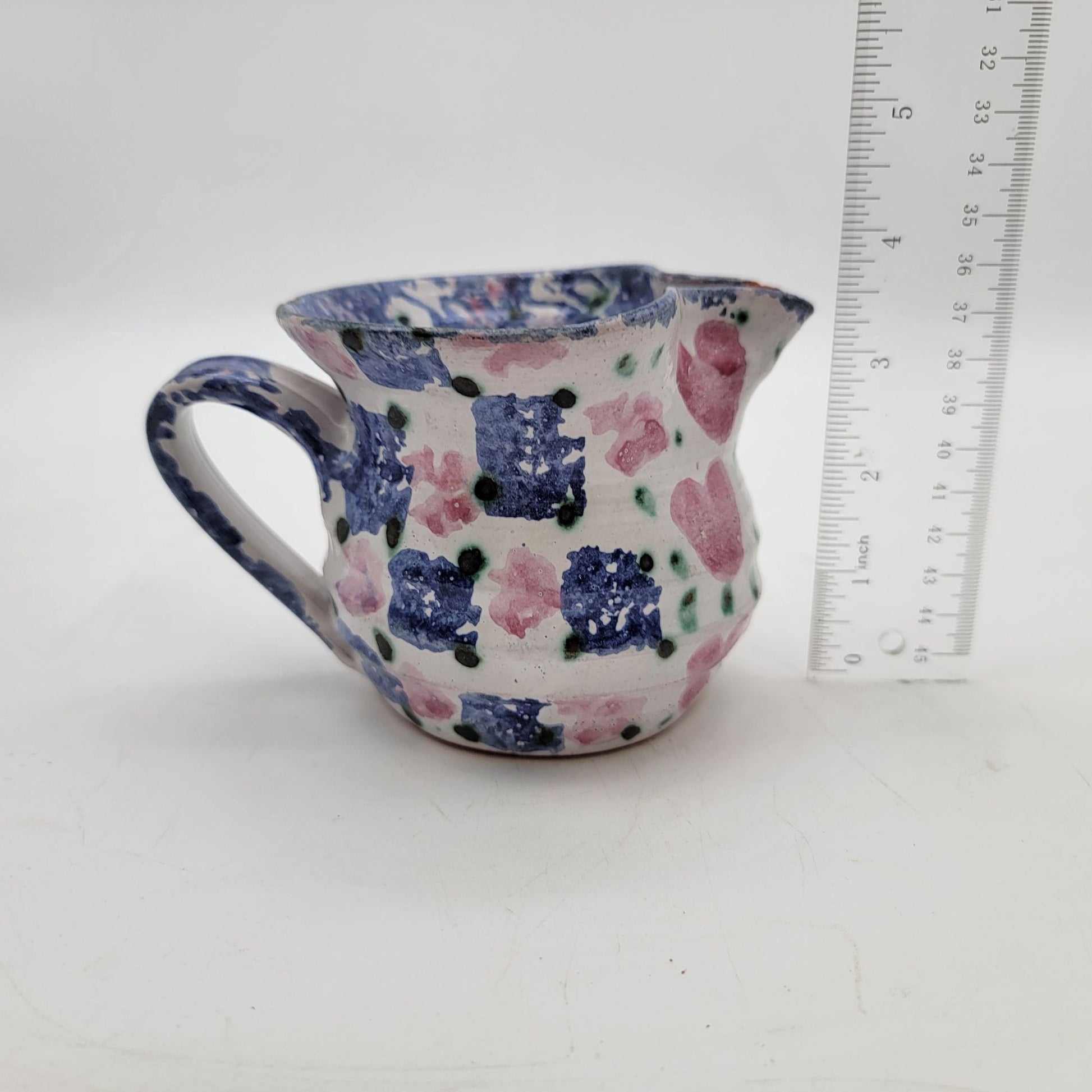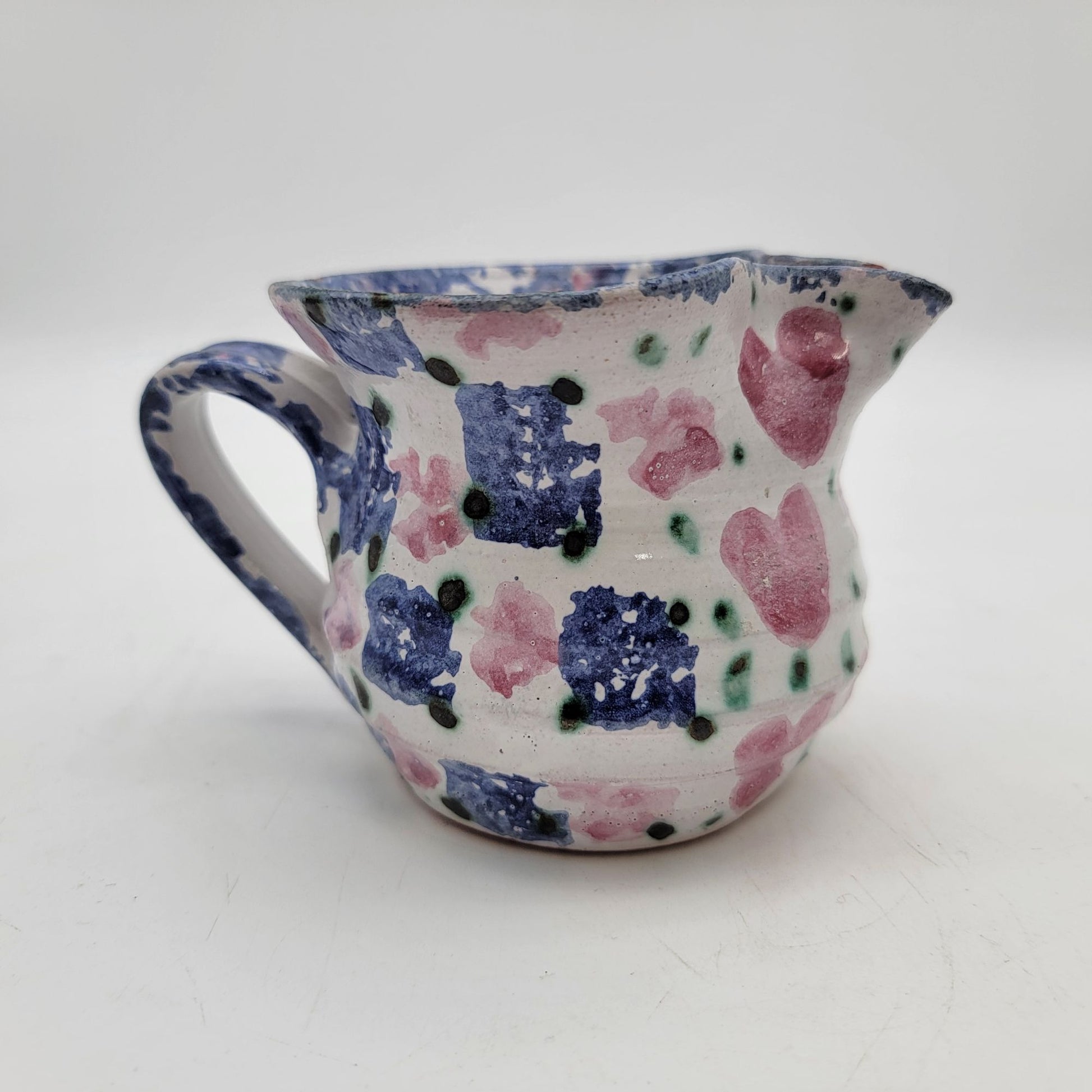 This vintage Susan Leader creamer pitcher exemplifies classic redware craftsmanship with its spongeware hearts pattern. The unique hand-painted design adds charm to any collection.