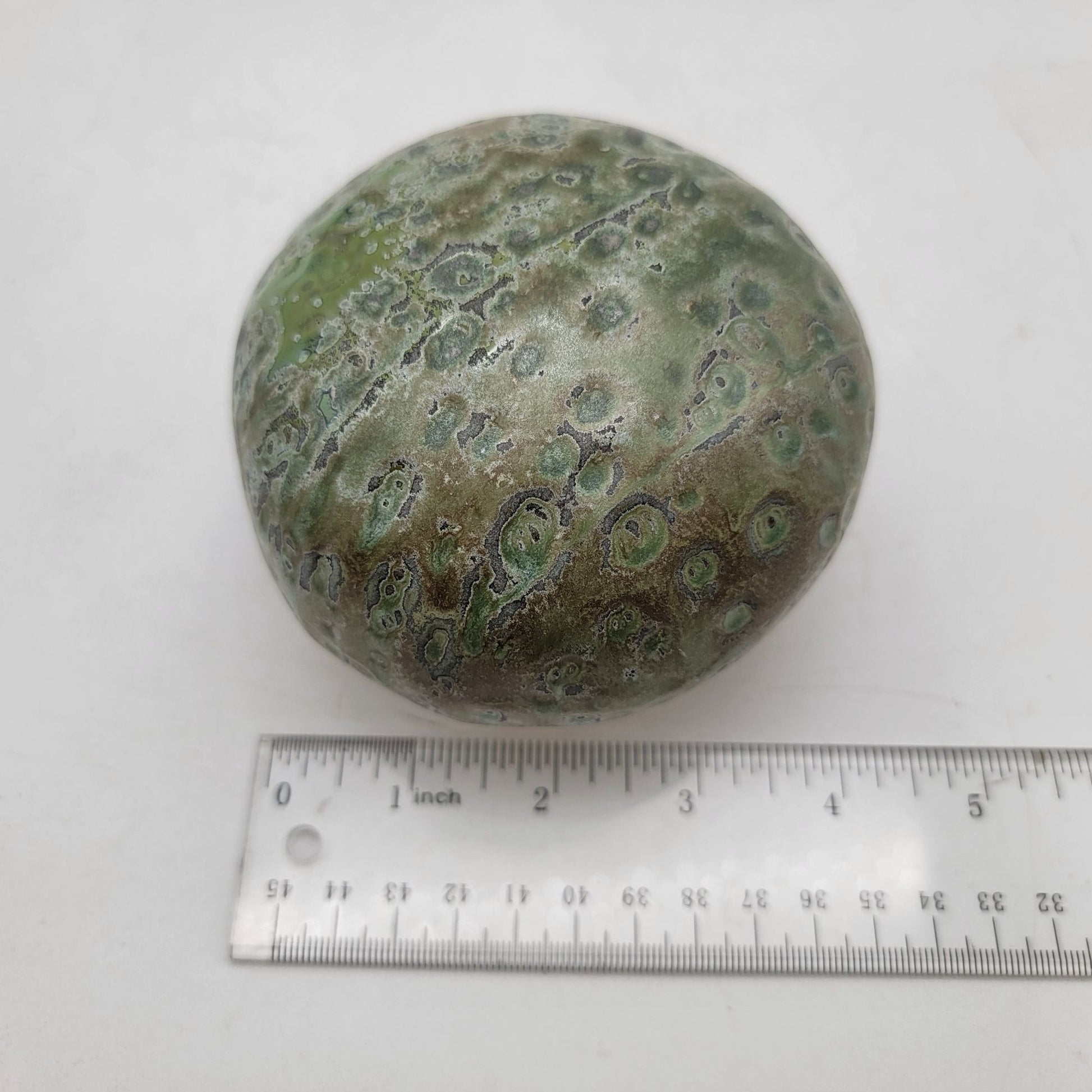 This vintage-inspired pottery paperweight by Happy Pear Pottery features an earthy green glaze with unique textured patterns. A timeless decorative piece for any collection.