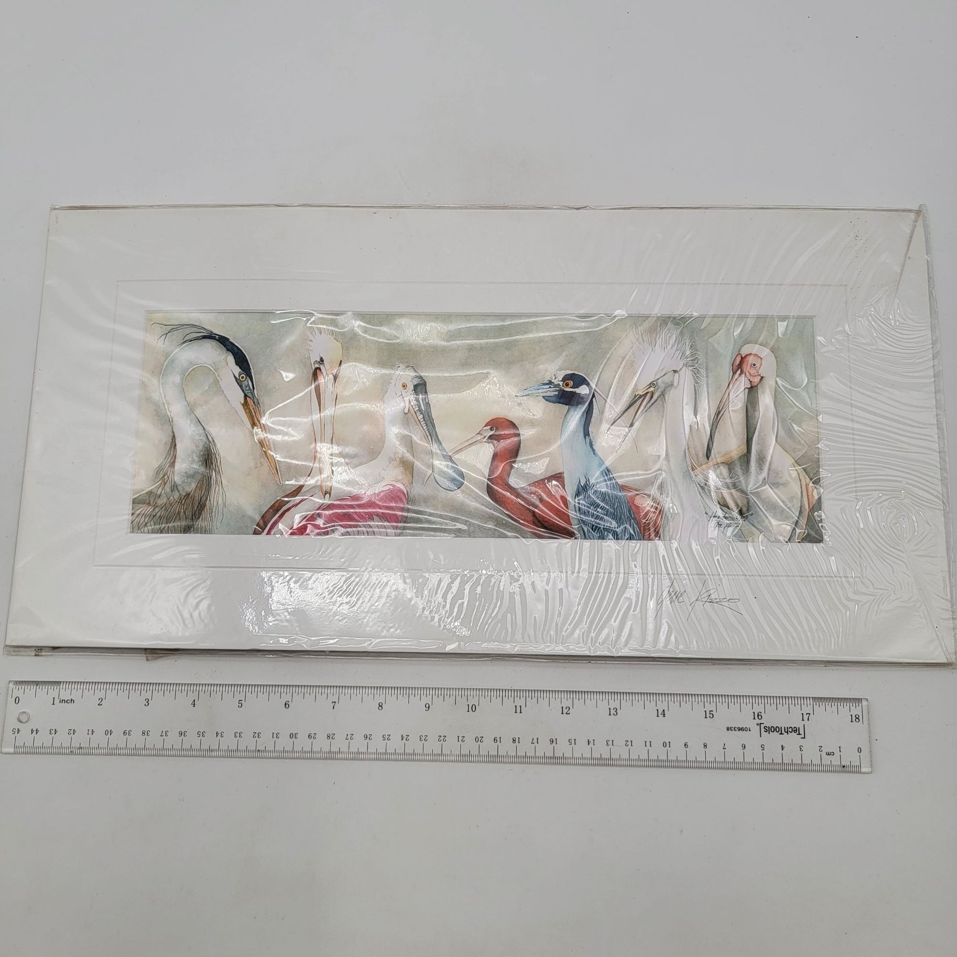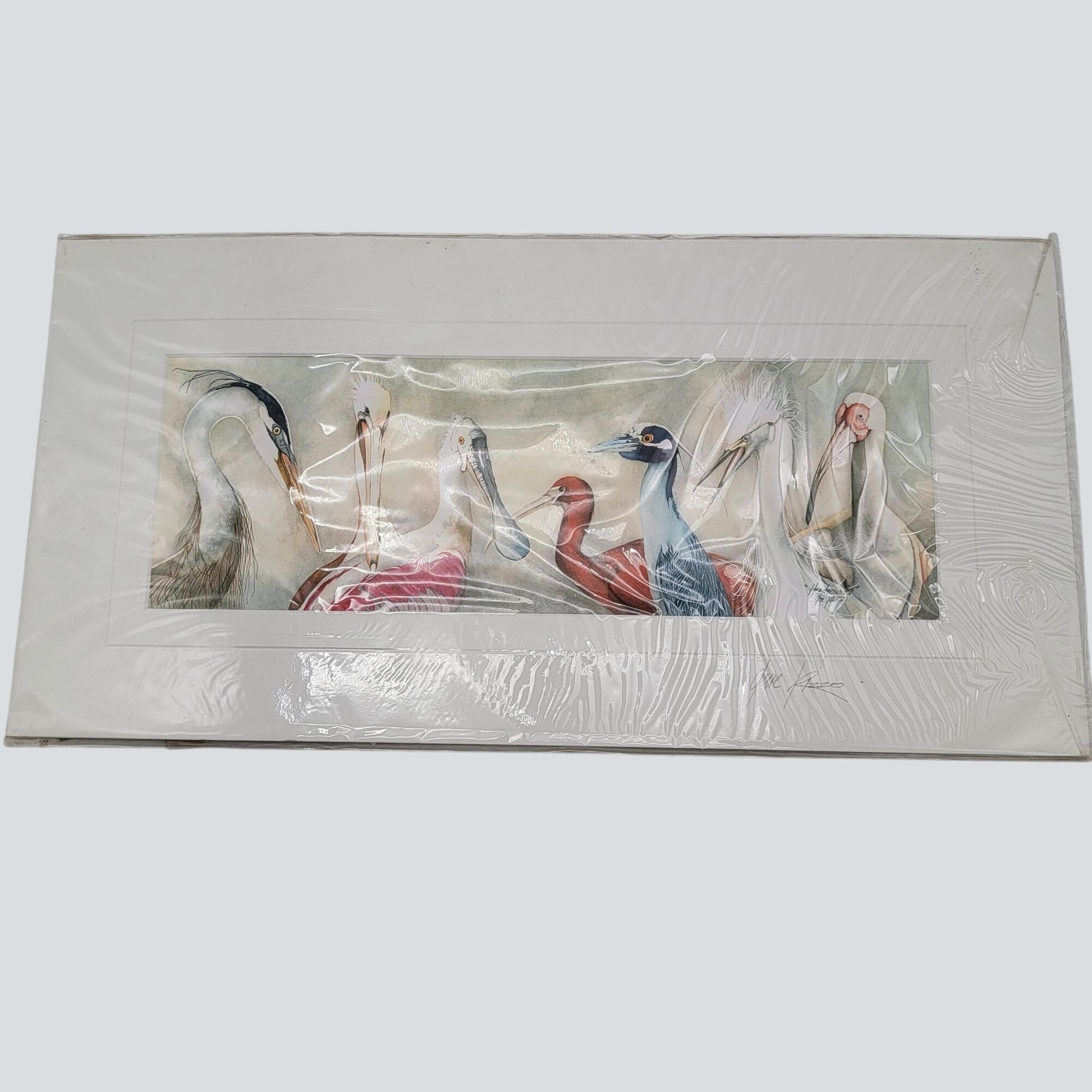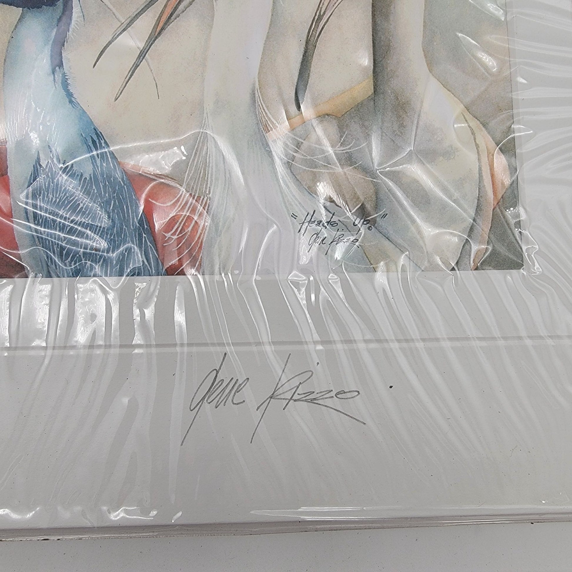 This exquisite watercolor art by Gene Rizzo, titled "Heads Up," showcases a delicate portrayal of various birds. Encased in protective wrapping and matted, the piece reflects an intricate artistry reminiscent of timeless techniques. Its soft hues and elegant composition make it a treasured collectible, merging nature’s beauty with artistic finesse.