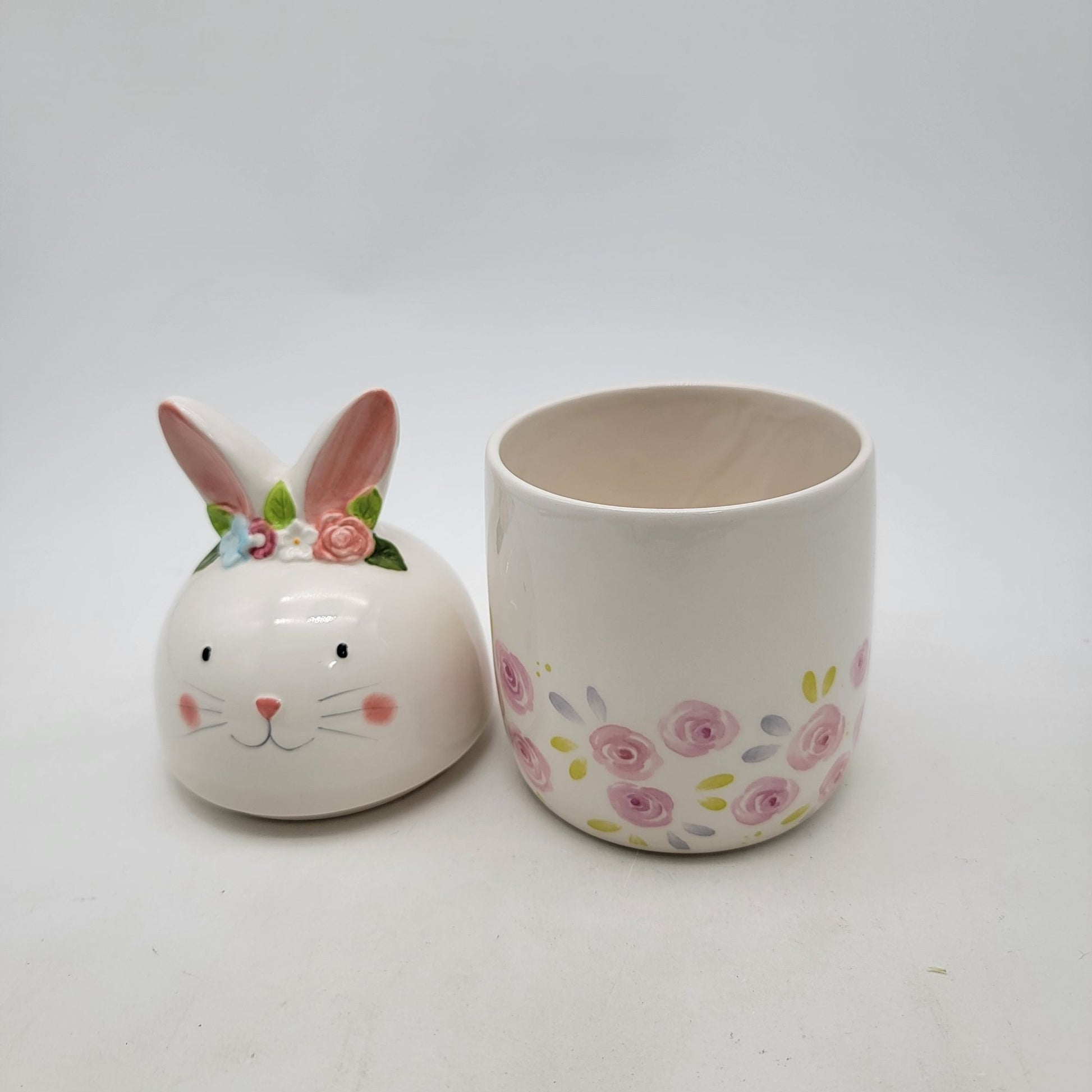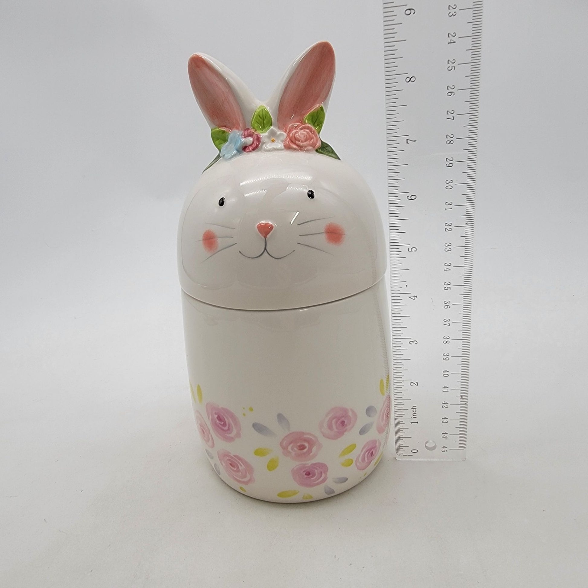 Hoppers Lane Bunny Rabbit Canister With Lid White & Pink Roses