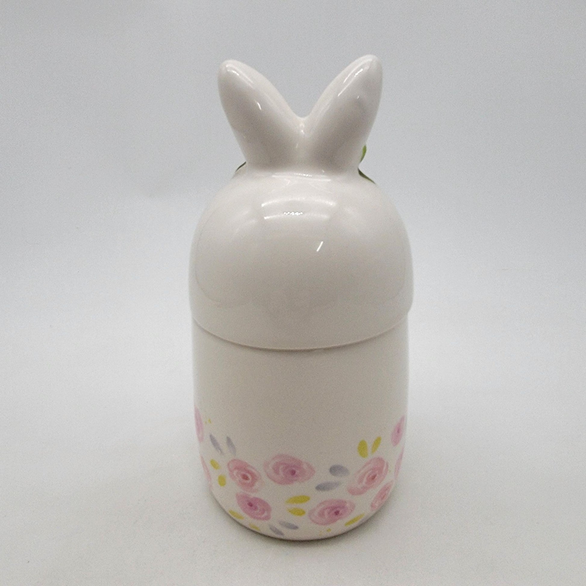 This ceramic bunny canister combines functionality and charm. Featuring delicate pink floral designs and a whimsical bunny lid, it enhances seasonal decor while providing storage for small items.