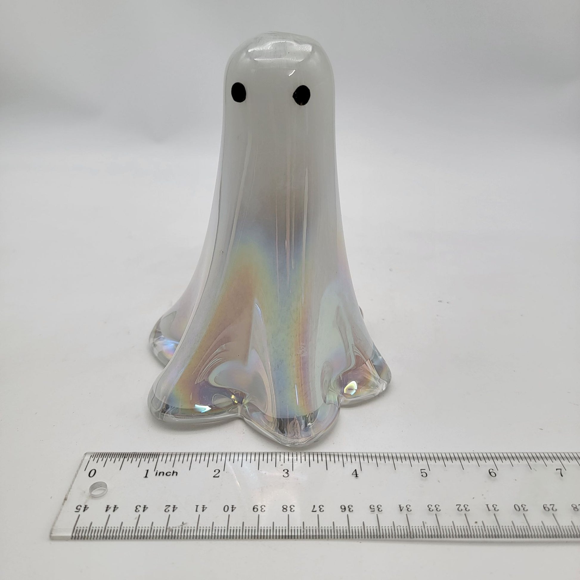 This iridescent glass ghost figurine stands approximately 5 1/2 inches tall, providing an elegant touch to any space. Its smooth finish and subtle rainbow hues add a timeless charm. Place it on a shelf or desk to enhance your decor with a unique and artistic piece.