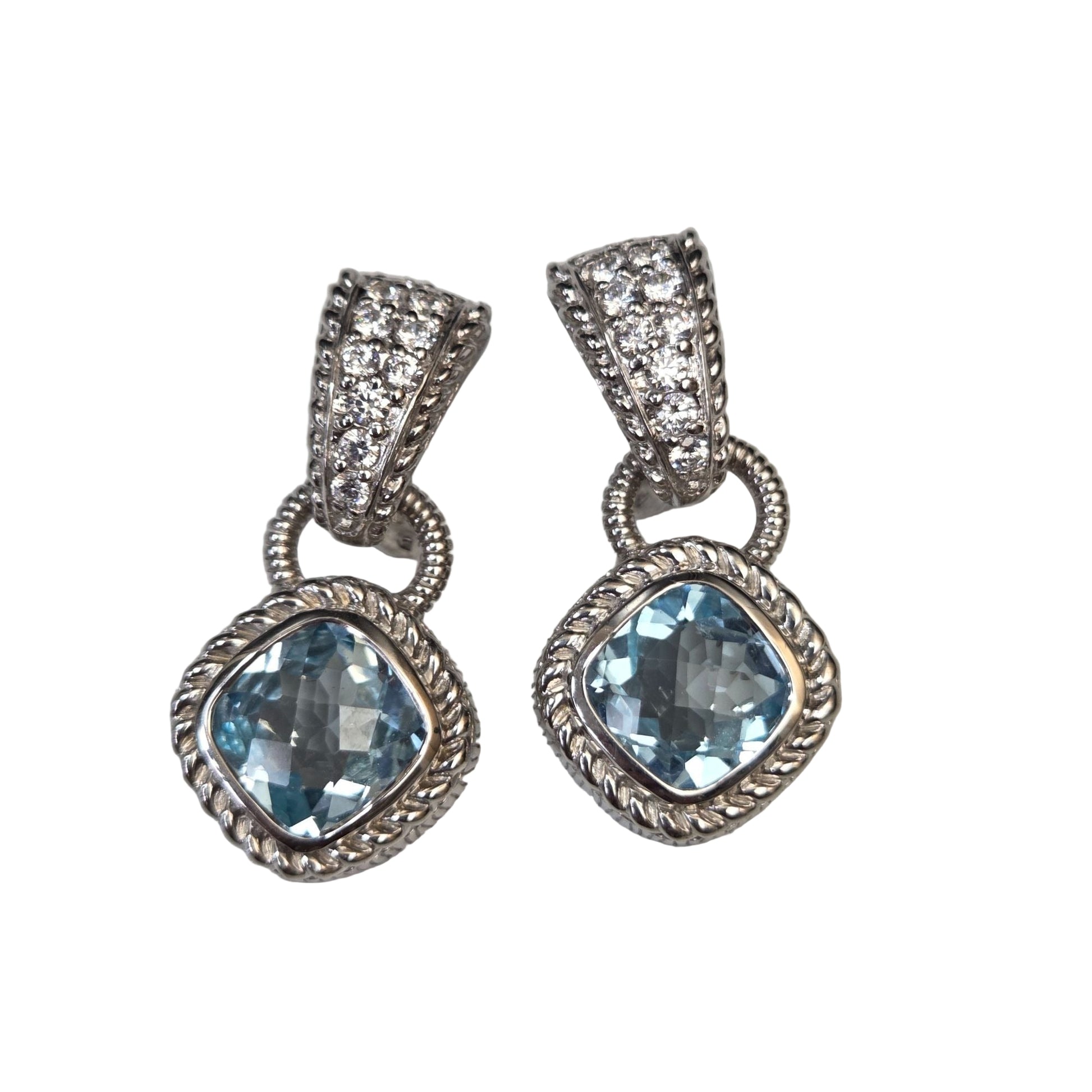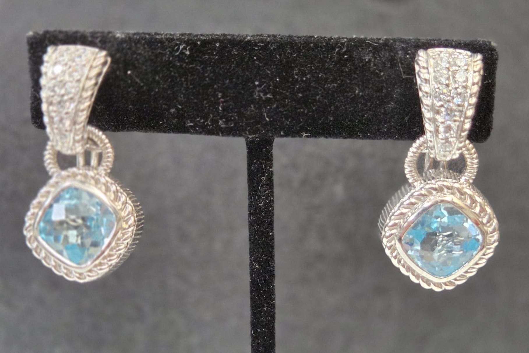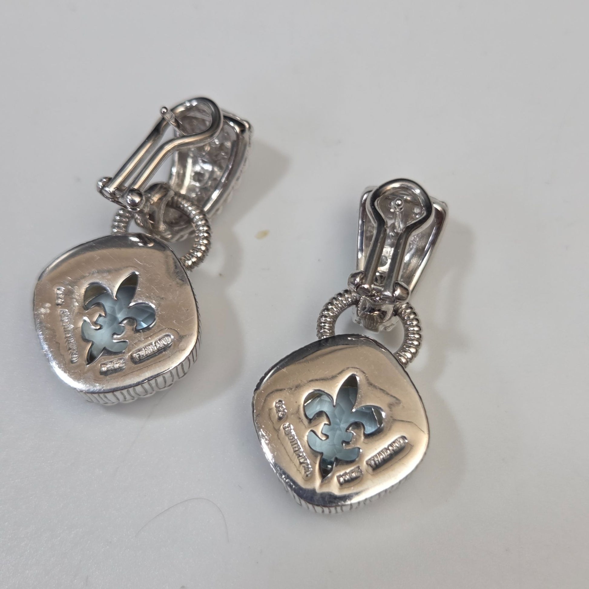 Judith Ripka Earrings Dangle Drop Blue Topaz Charm CZ 925 Sterling Silver Omega
