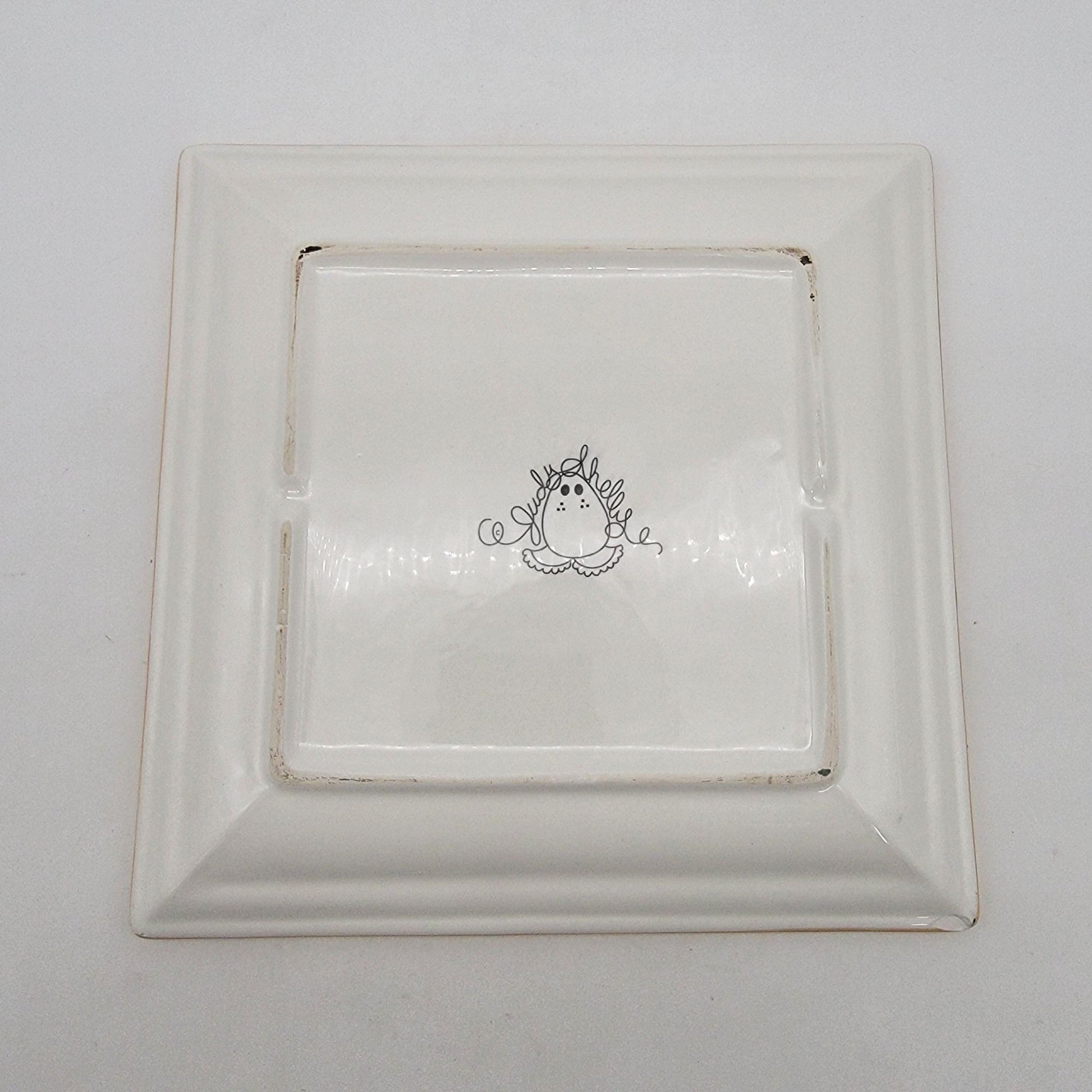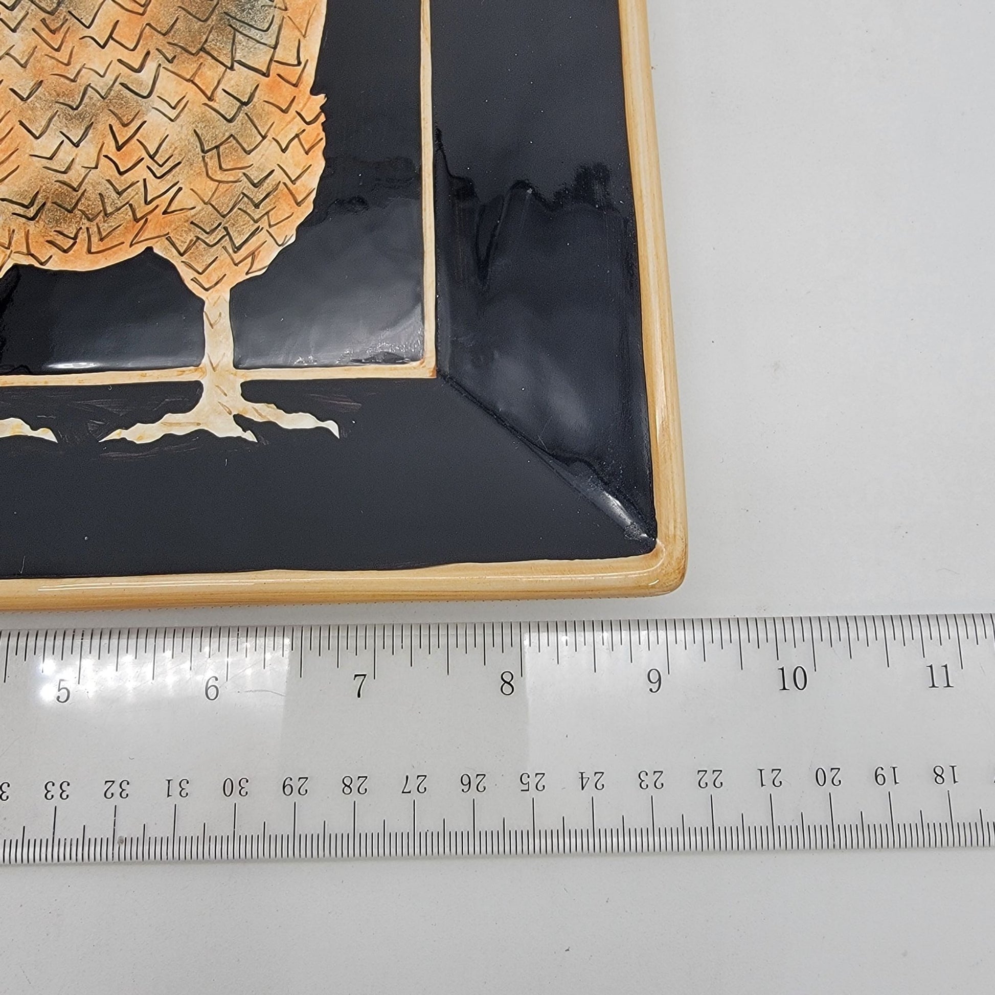 This Judy Shelly ceramic square plate features a vibrant chicken design. Ideal as a decorative piece or serving plate, it adds charm to farmhouse decor.