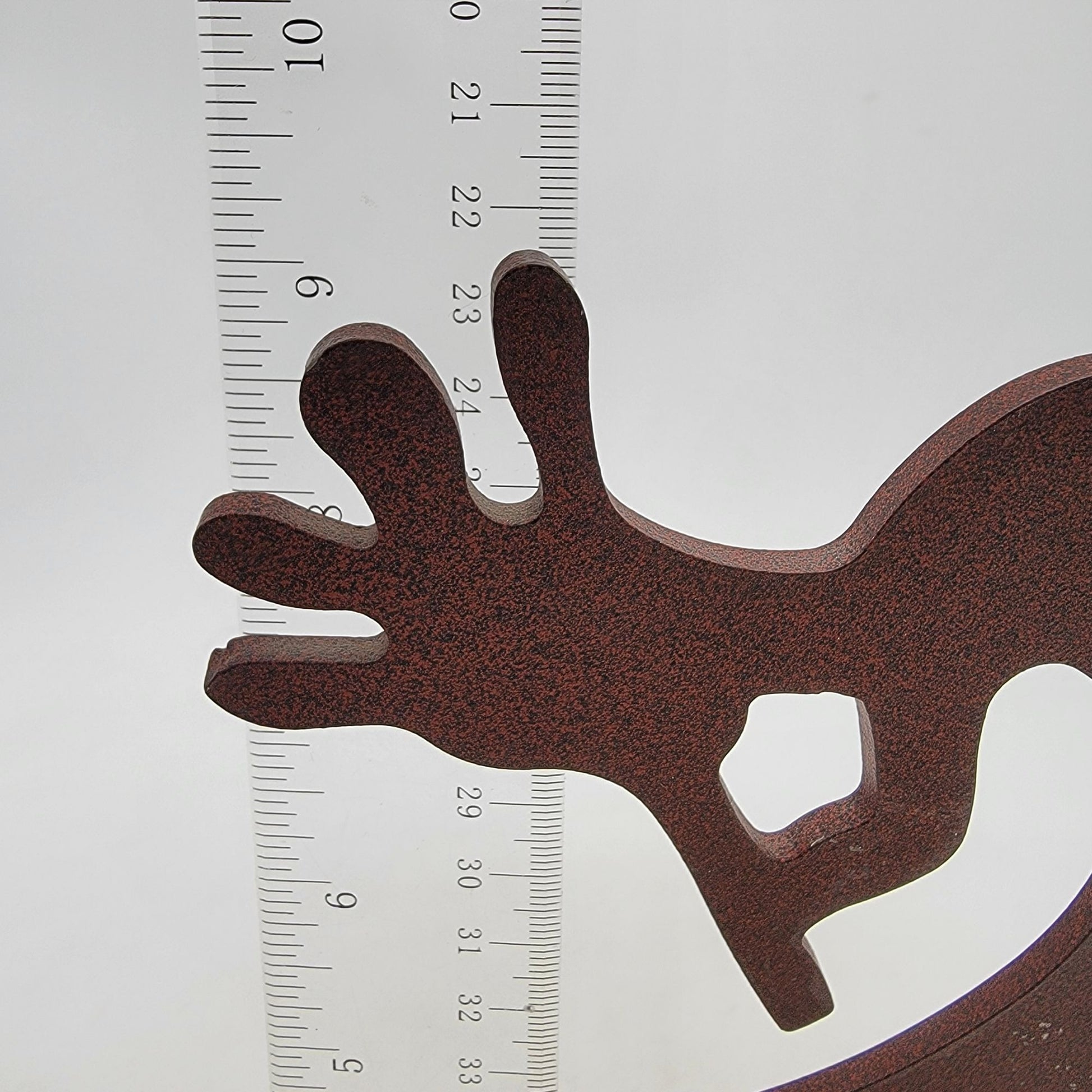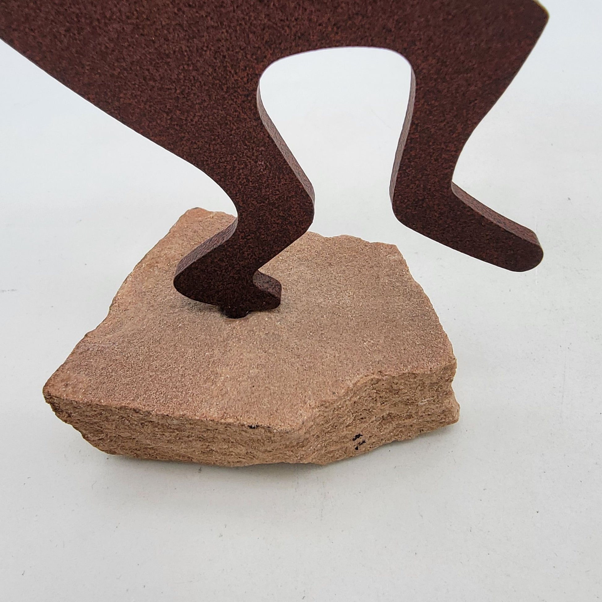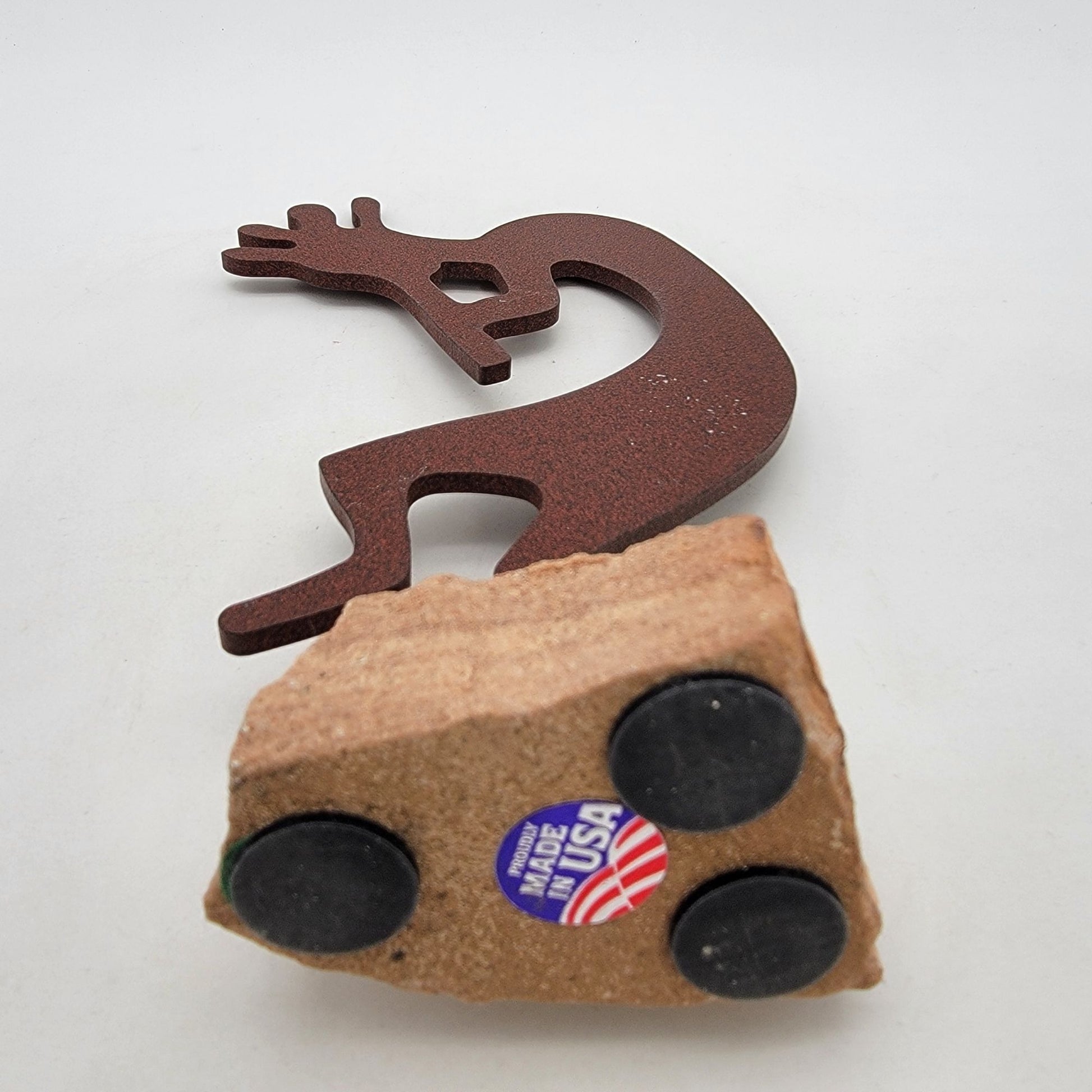 This handcrafted Kokopelli metal art sculpture features a sturdy sandstone base, offering a unique addition to home or office decor.