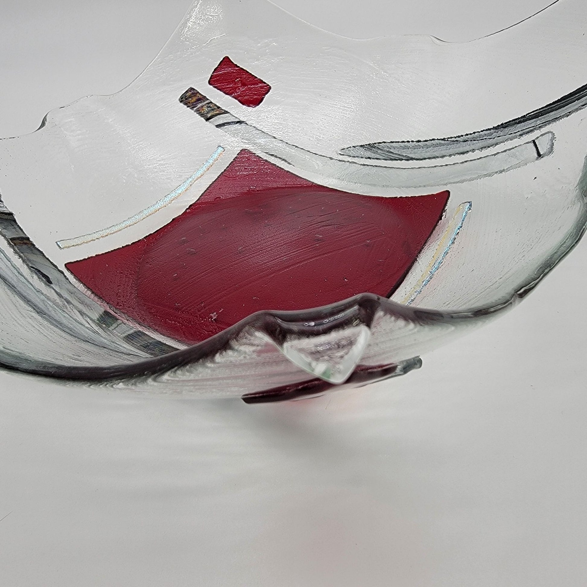 Large Fused Glass Bowl With Abstract Red & Clear Design