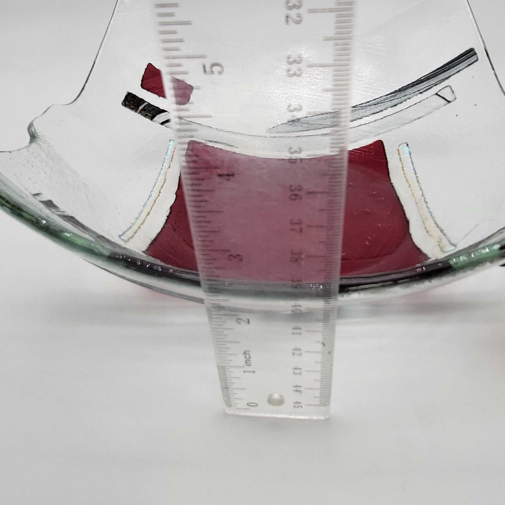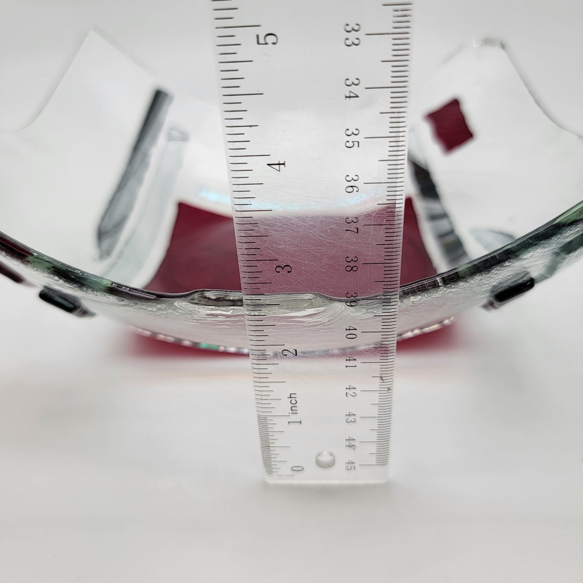 Crafted through a meticulous glass-fusing process, this unique bowl features abstract patterns of red and clear glass. Its gently curved edges and modern artistry make it a centerpiece worthy of admiration. Perfect for adding elegance to any space, this handmade piece is both functional and visually captivating.