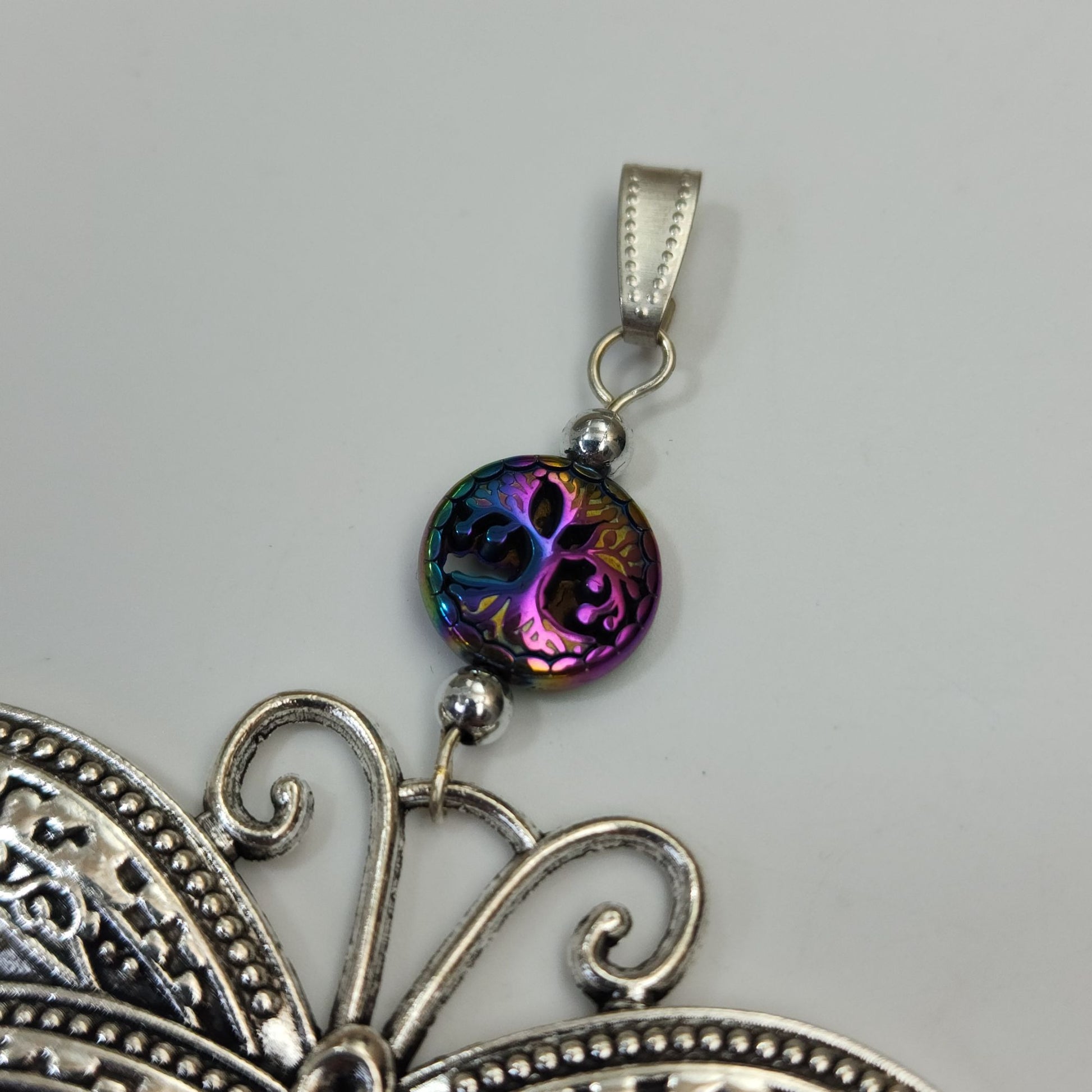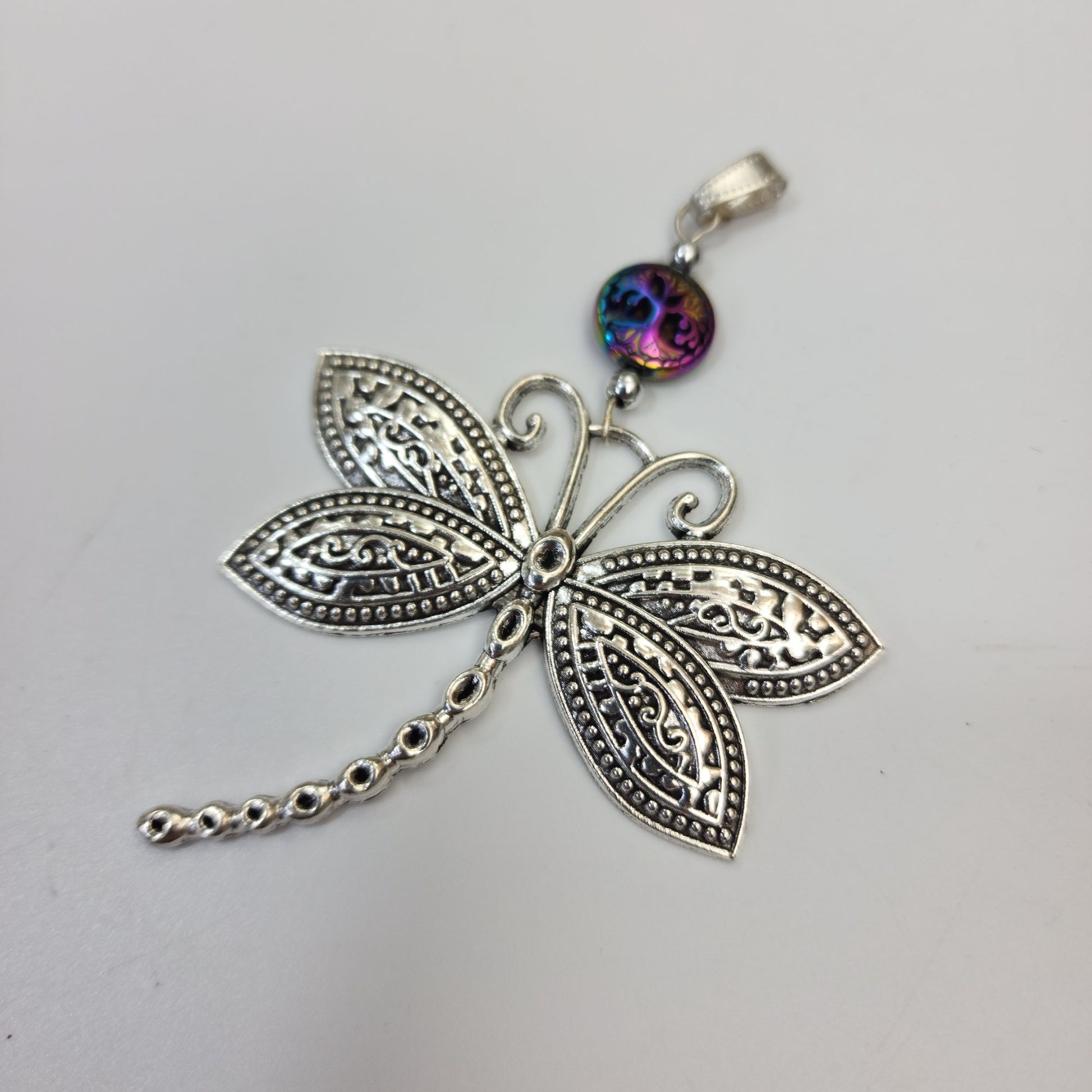 A mystical dragonfly pendant with ornate silver tone detailing, paired with an iridescent tree of life bead. A timeless piece for those who love artful designs. Its craftsmanship speaks of nature's beauty, making it a standout jewelry item. Perfect for adding a touch of whimsy and elegance.