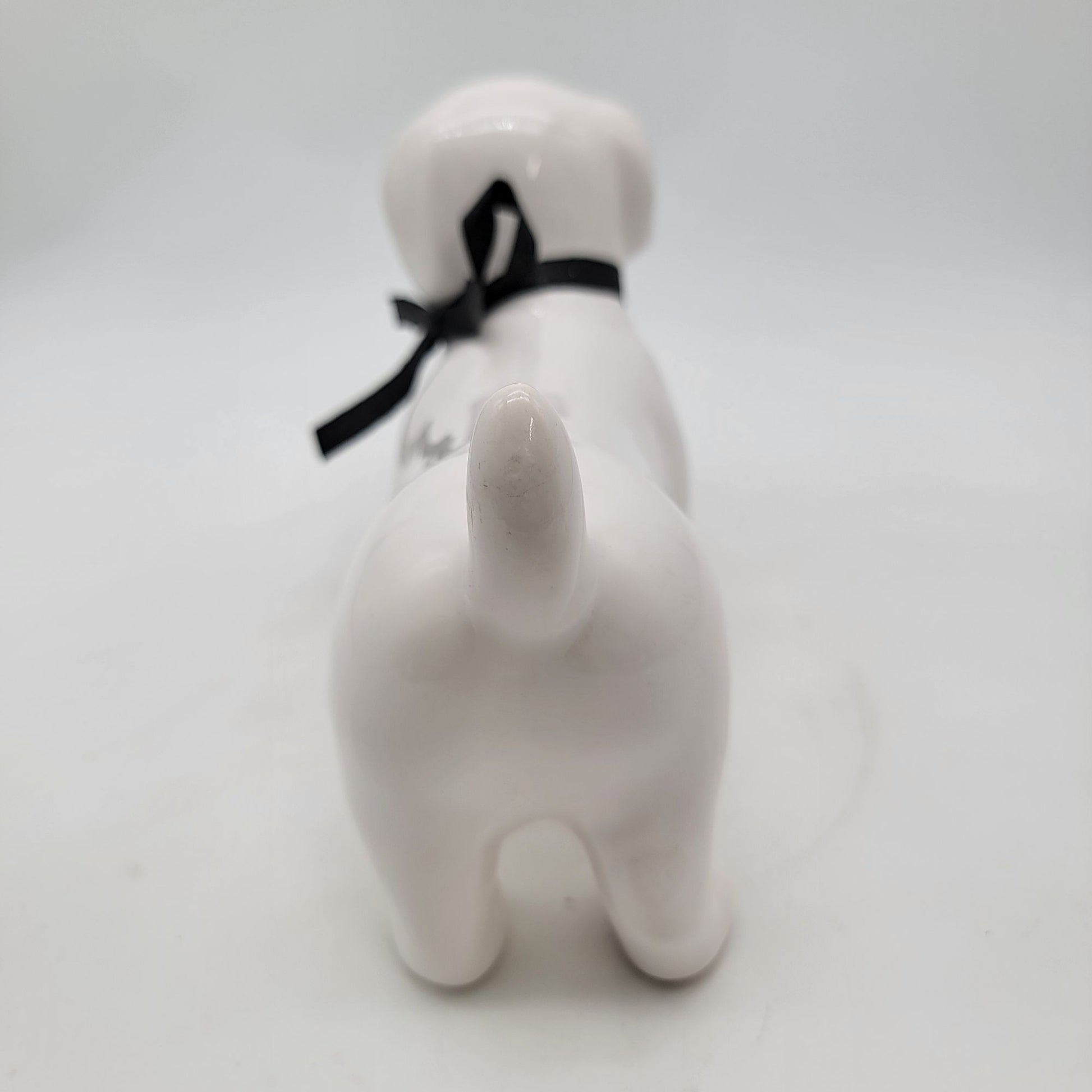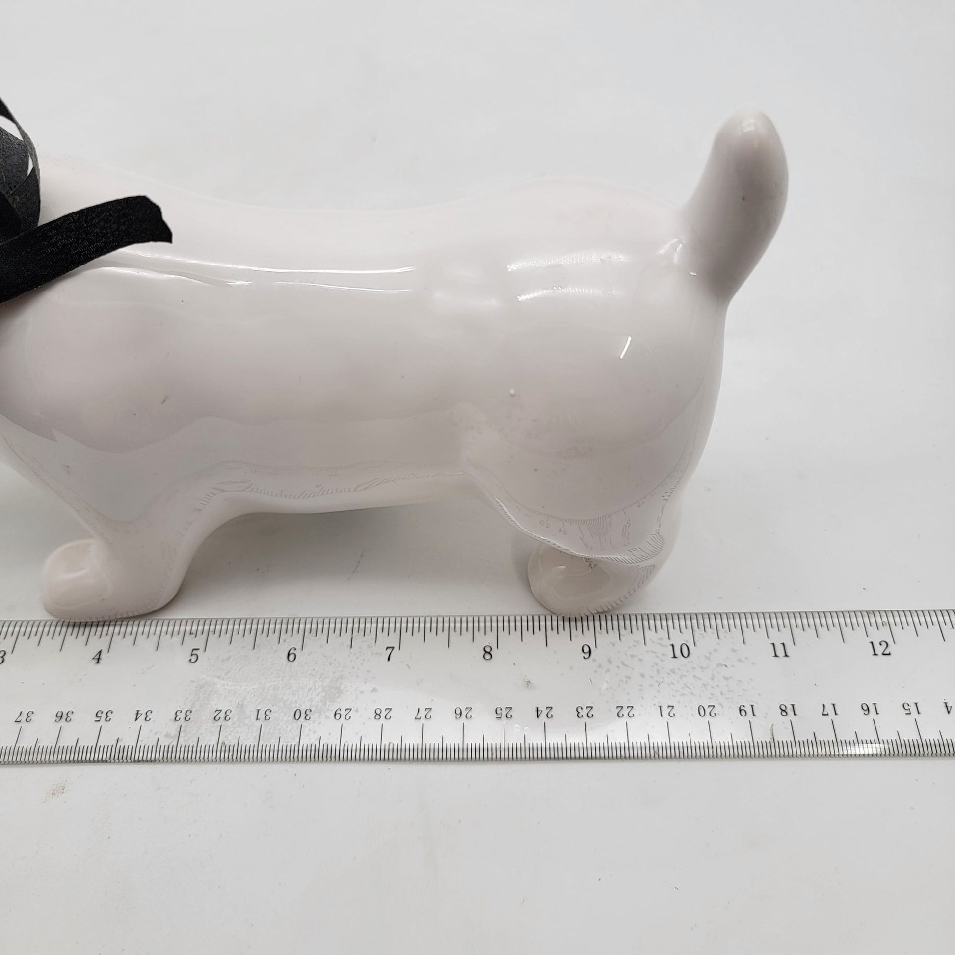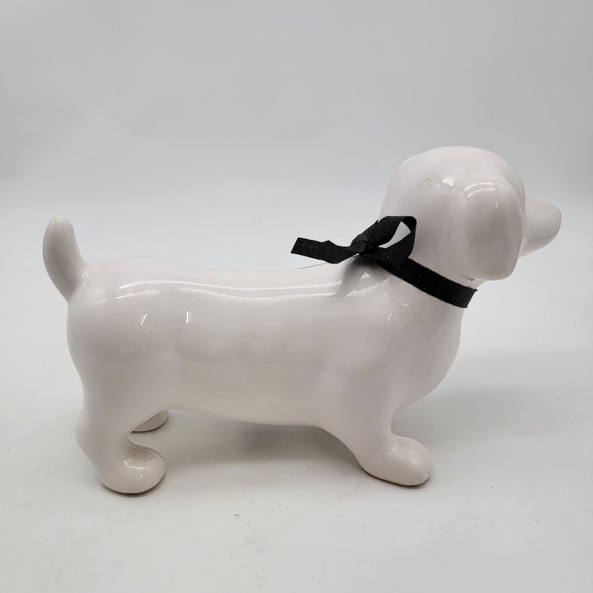 This elegant ceramic dachshund figurine makes a tasteful addition to any home or office decor. Its simplistic design and smooth finish offer a timeless appeal, while the black ribbon adds a touch of sophistication. Ideal for dog lovers and collectors who appreciate minimalist art pieces.