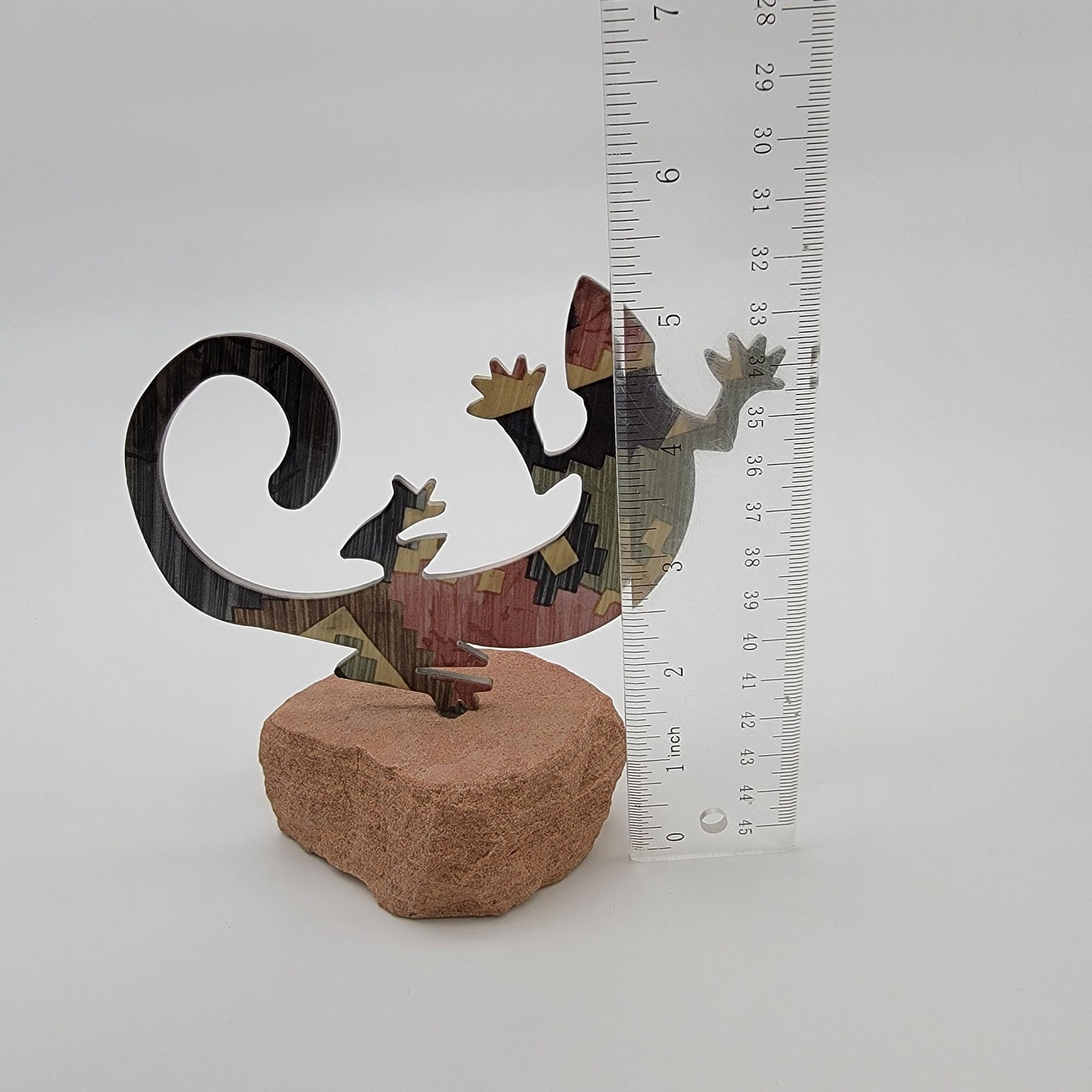 This intricate LazArt sculpture features a gecko lizard design inspired by Native American petroglyphs. Crafted from metal with a natural stone base, it's a unique decorative piece.