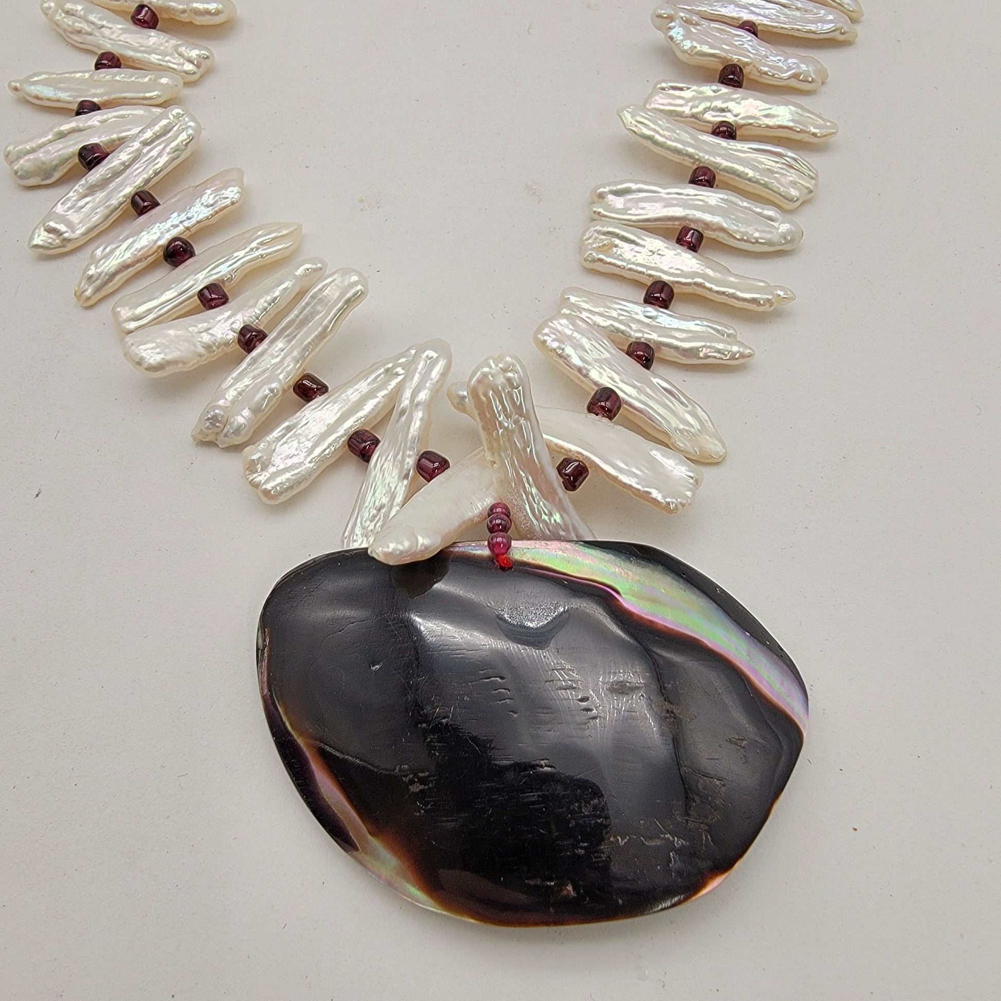 Within this necklace lies the ocean's tale, where a Mabe blister pearl rests in its natural shell, encircled by Biwa baroque pearls and garnet accents. A harmonious blend of rustic elegance and marine beauty, it speaks of tides and timeless sophistication.