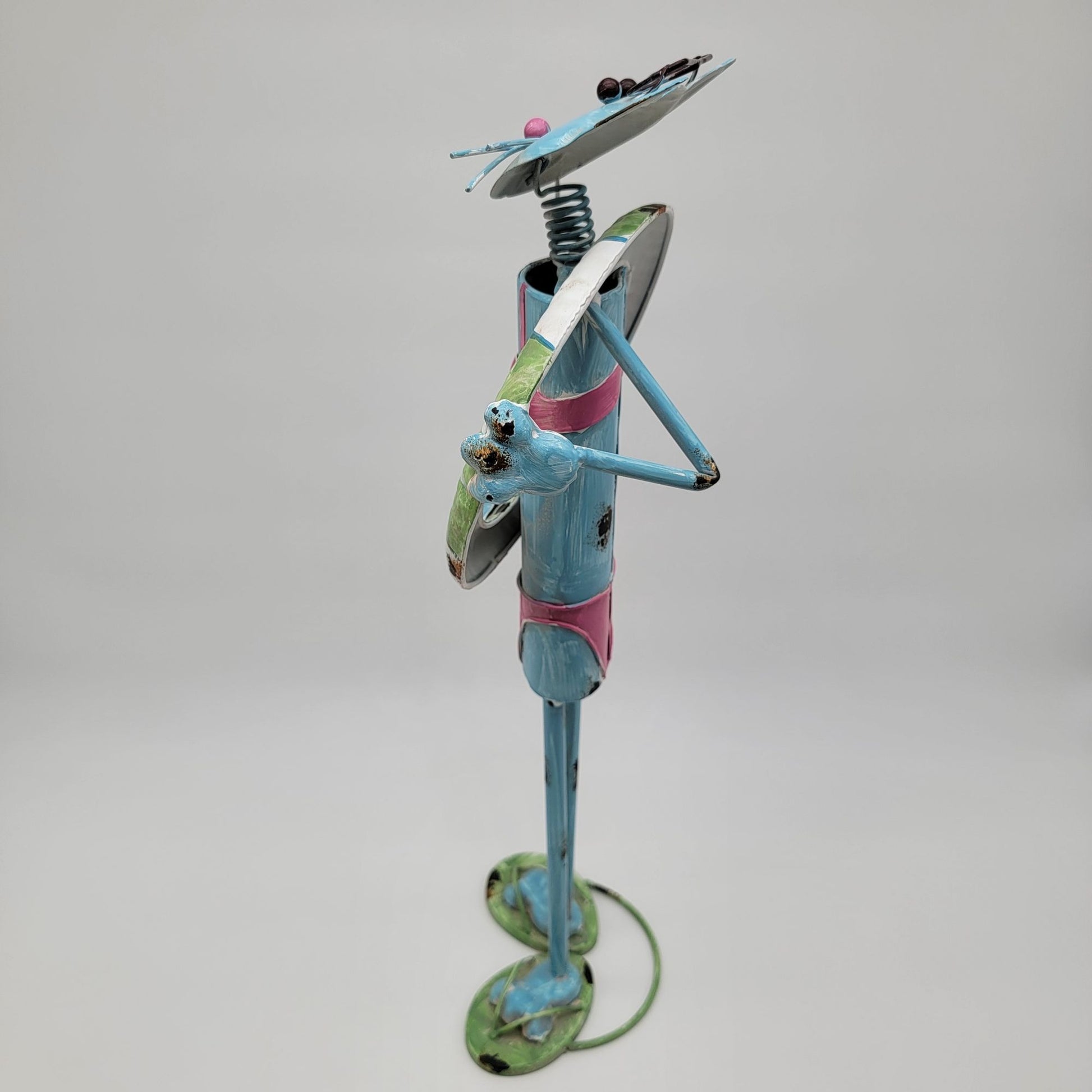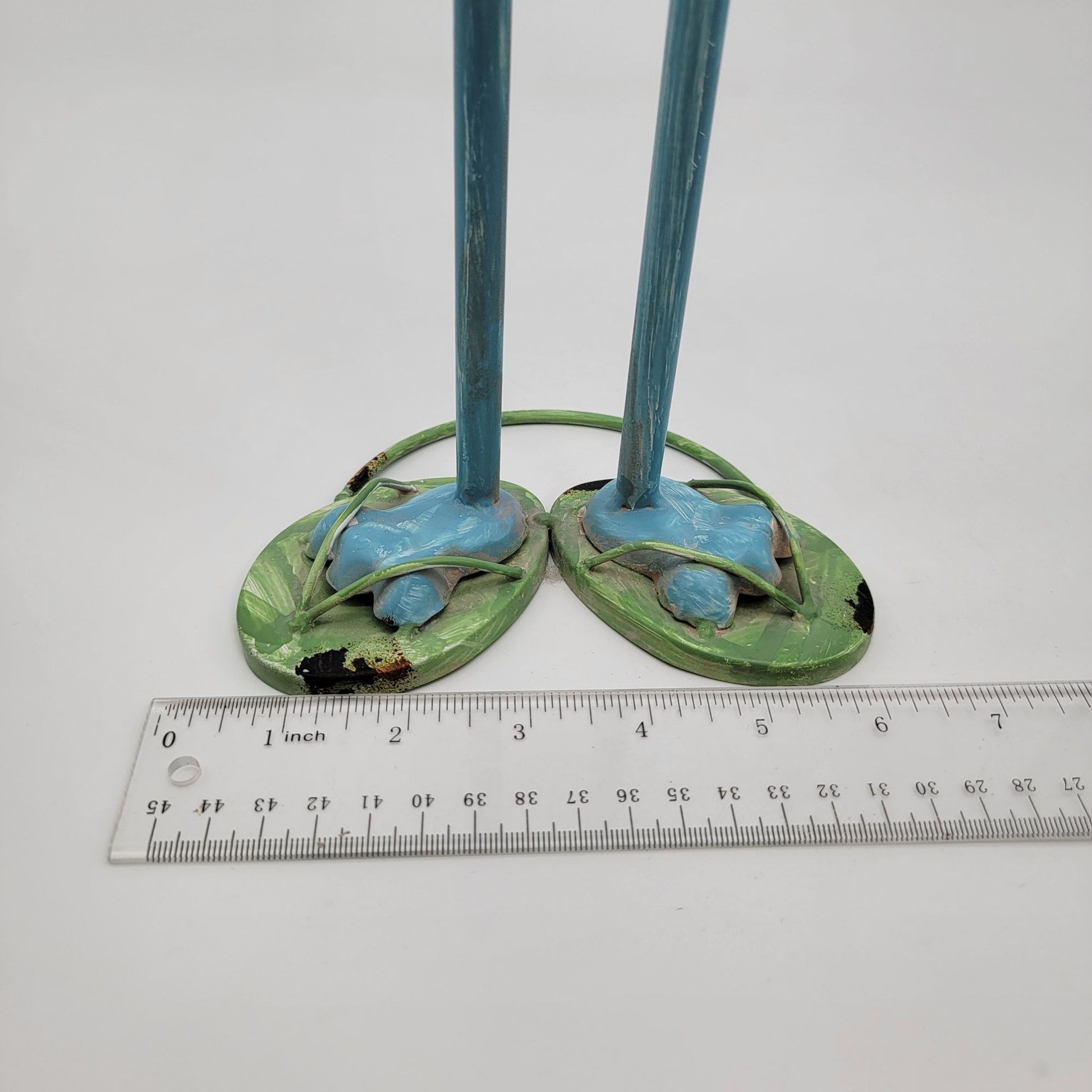 This playful cat sculpture exudes seaside charm with its hand-painted details and quirky design. Crafted from recycled metal, it features a lighthearted beach theme that brings joy to any outdoor space. Standing 19” tall, this whimsical piece is perfect for adding character to gardens or patios.