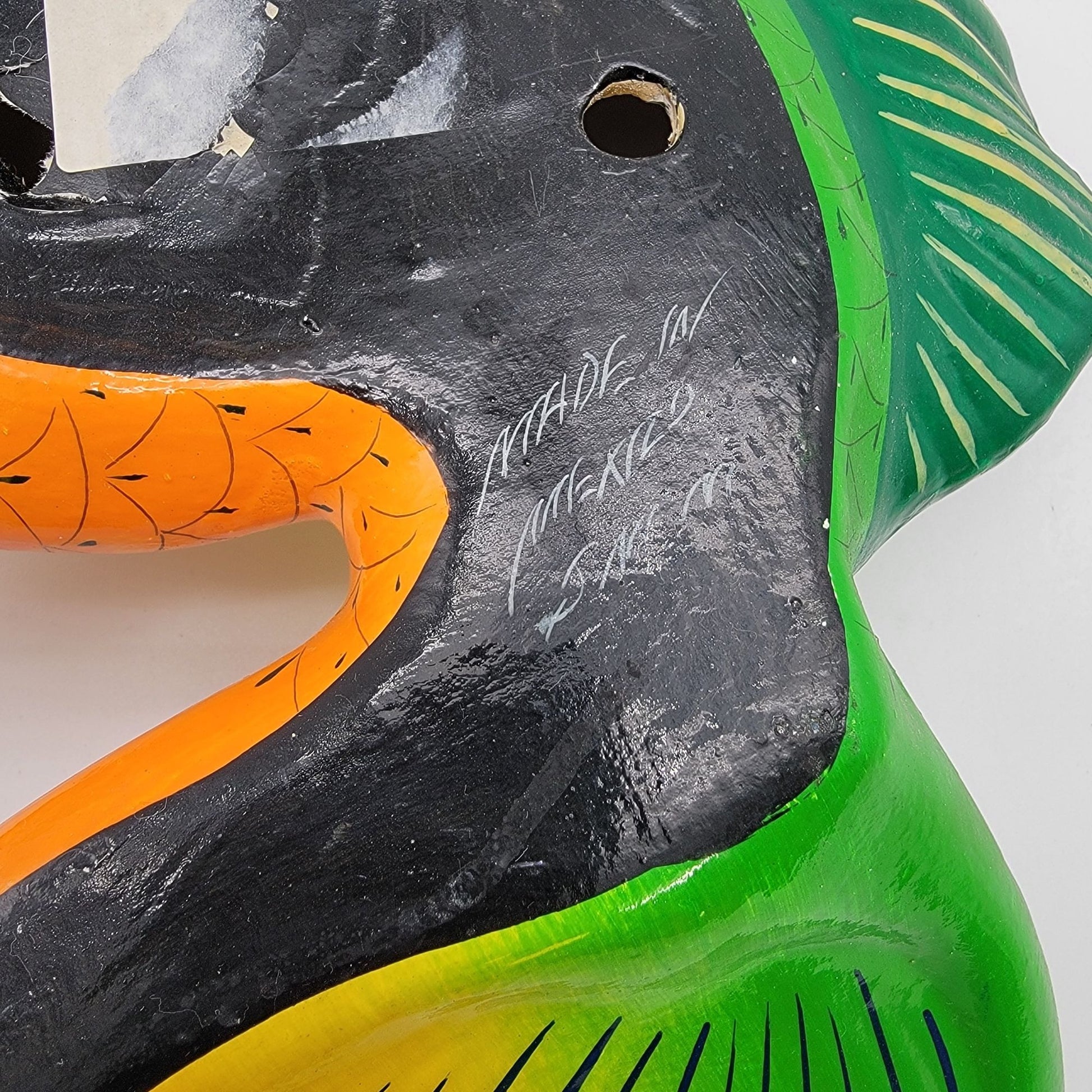This colorful fish wall hanging tells a story of Mexican artistry with its hand-painted details, vibrant hues of green and orange, and the artist's signature. A lively addition to a home or office, this 12-inch ceramic creation is both a celebration of culture and a statement piece for unique decor.