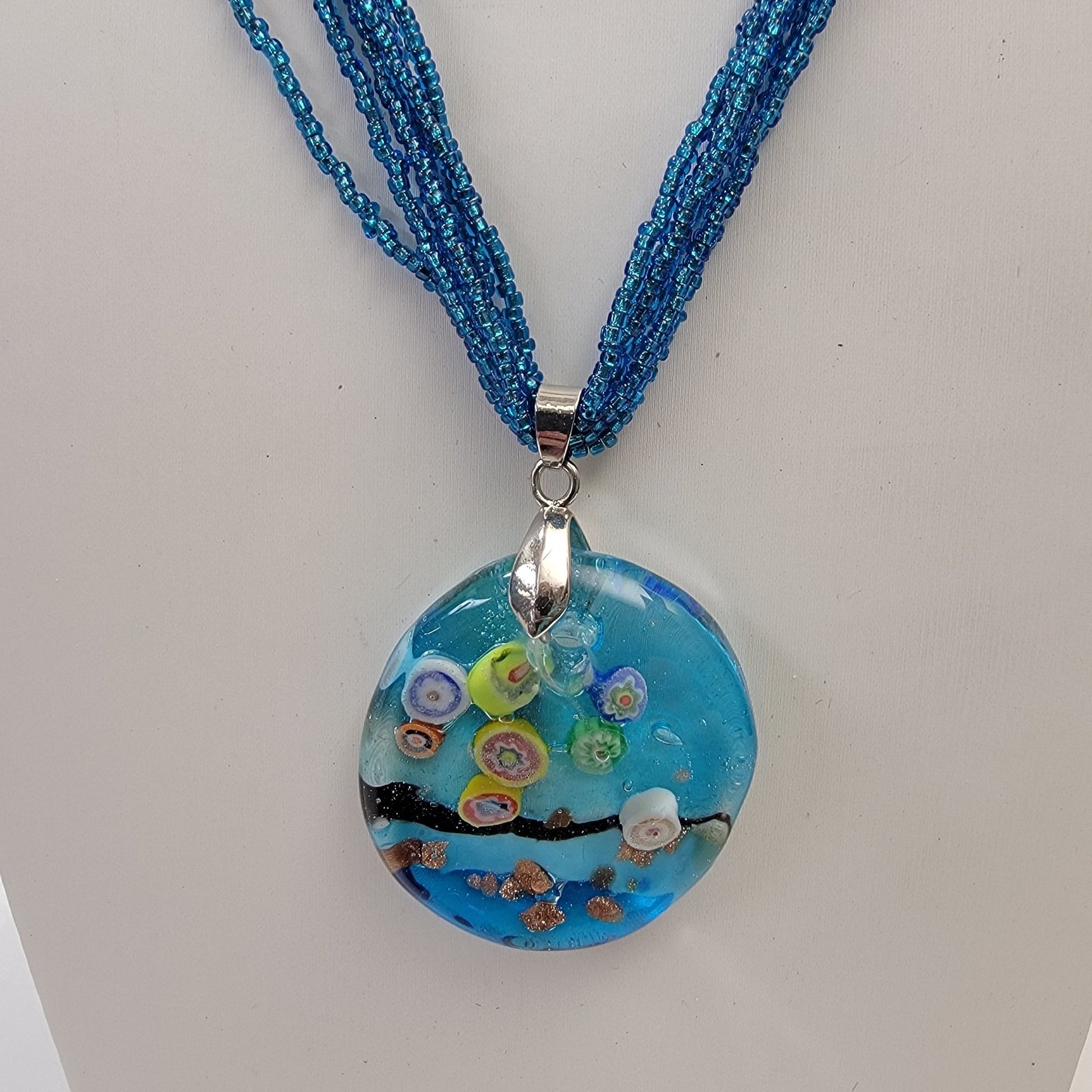 Murano Glass Pendant On 6-Strand Blue Seed Beads Necklace 18KGP