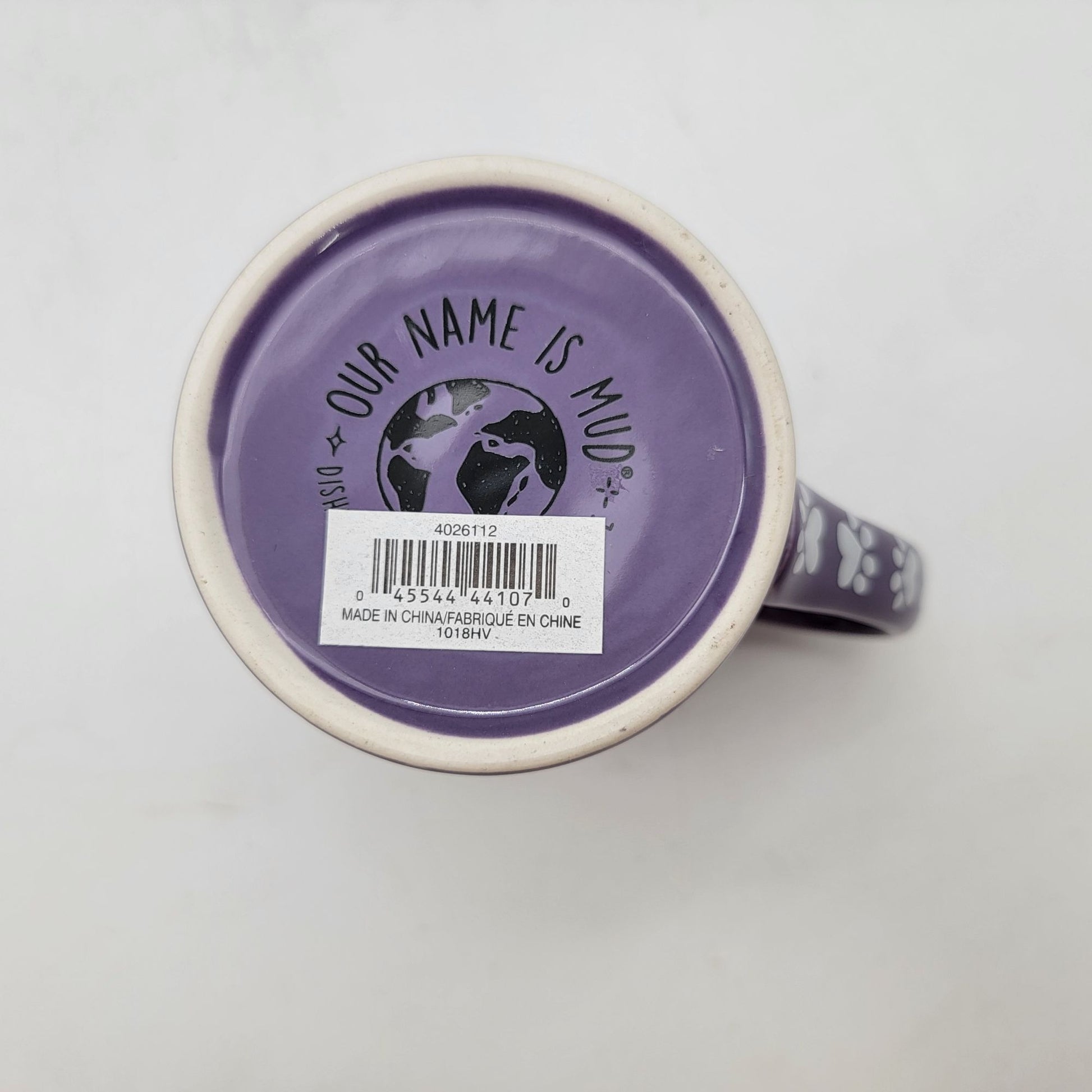 This charming ceramic mug boasts an endearing vintage-inspired design. Its rich purple hue, adorned with whimsical paw prints and hearts, celebrates pet parenthood.