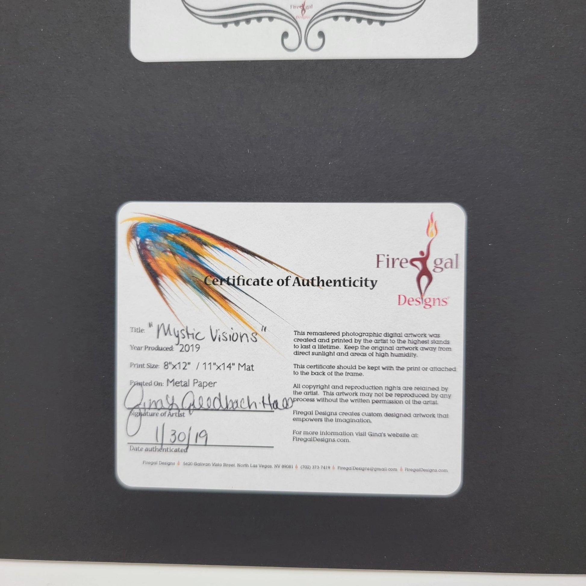 A signed and matted photographic metal paper print titled "Mystic Visions" by Gina Geldbach-Hall. Includes Certificate of Authenticity from Firegal Designs.