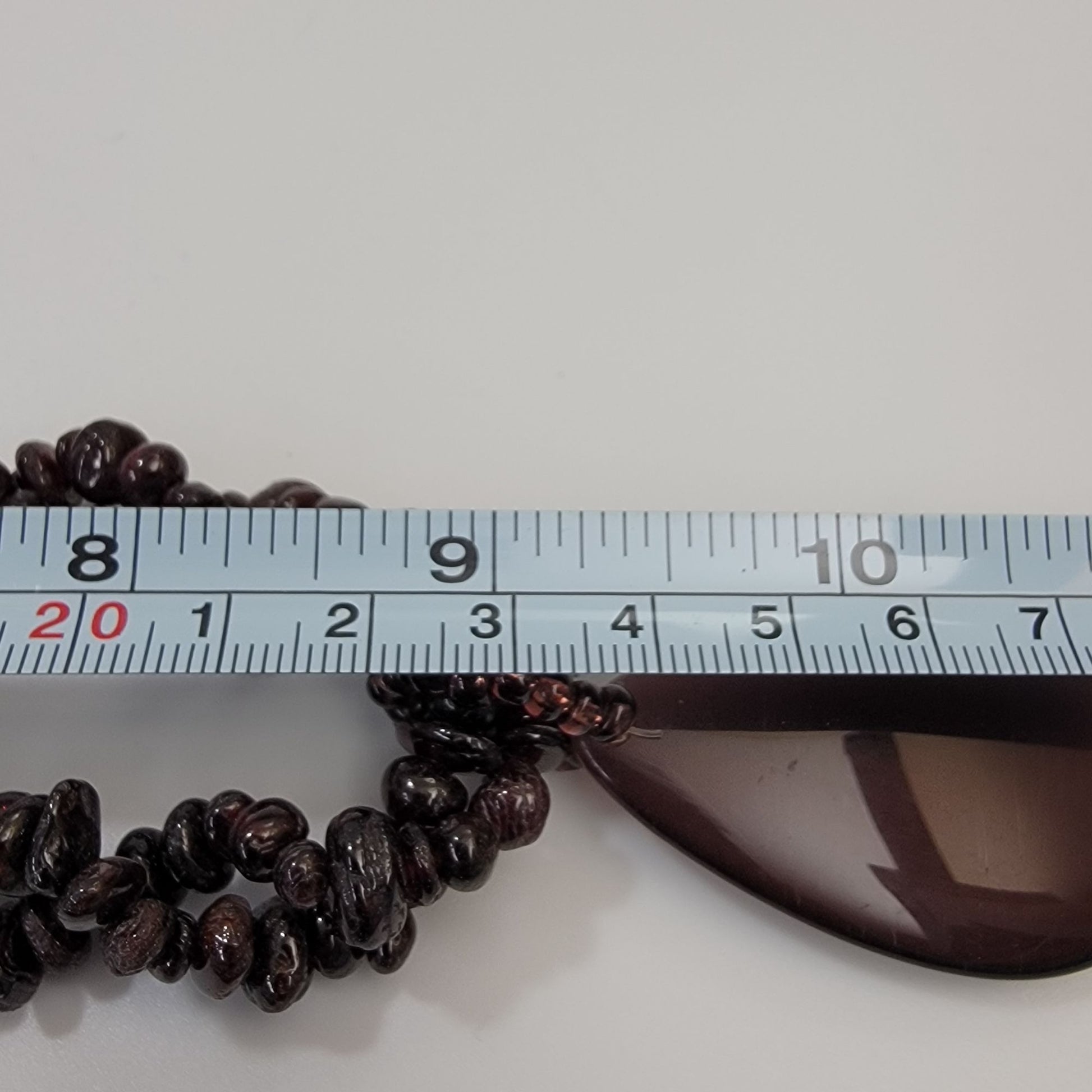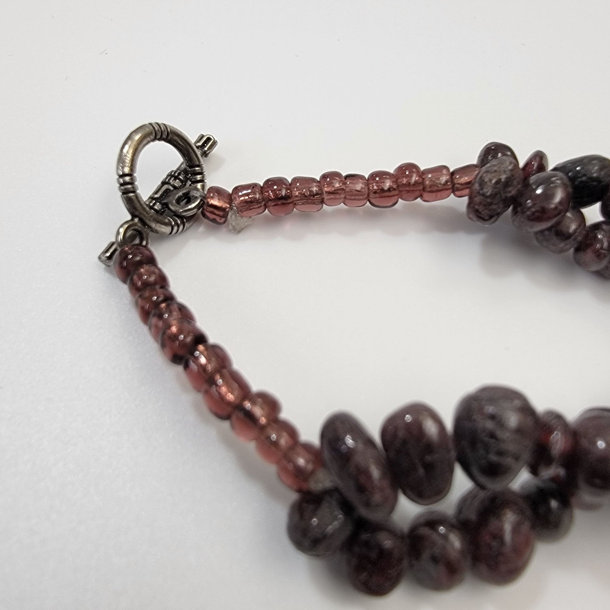 This garnet necklace tells a tale of earth's treasures, with its deep red hues and shimmering glass teardrop pendant. Each bead, a crafted marvel, embodies timeless elegance, while the sturdy toggle clasp ensures both style and security. A wearable artwork, it harmonizes natural beauty and artisan dedication.