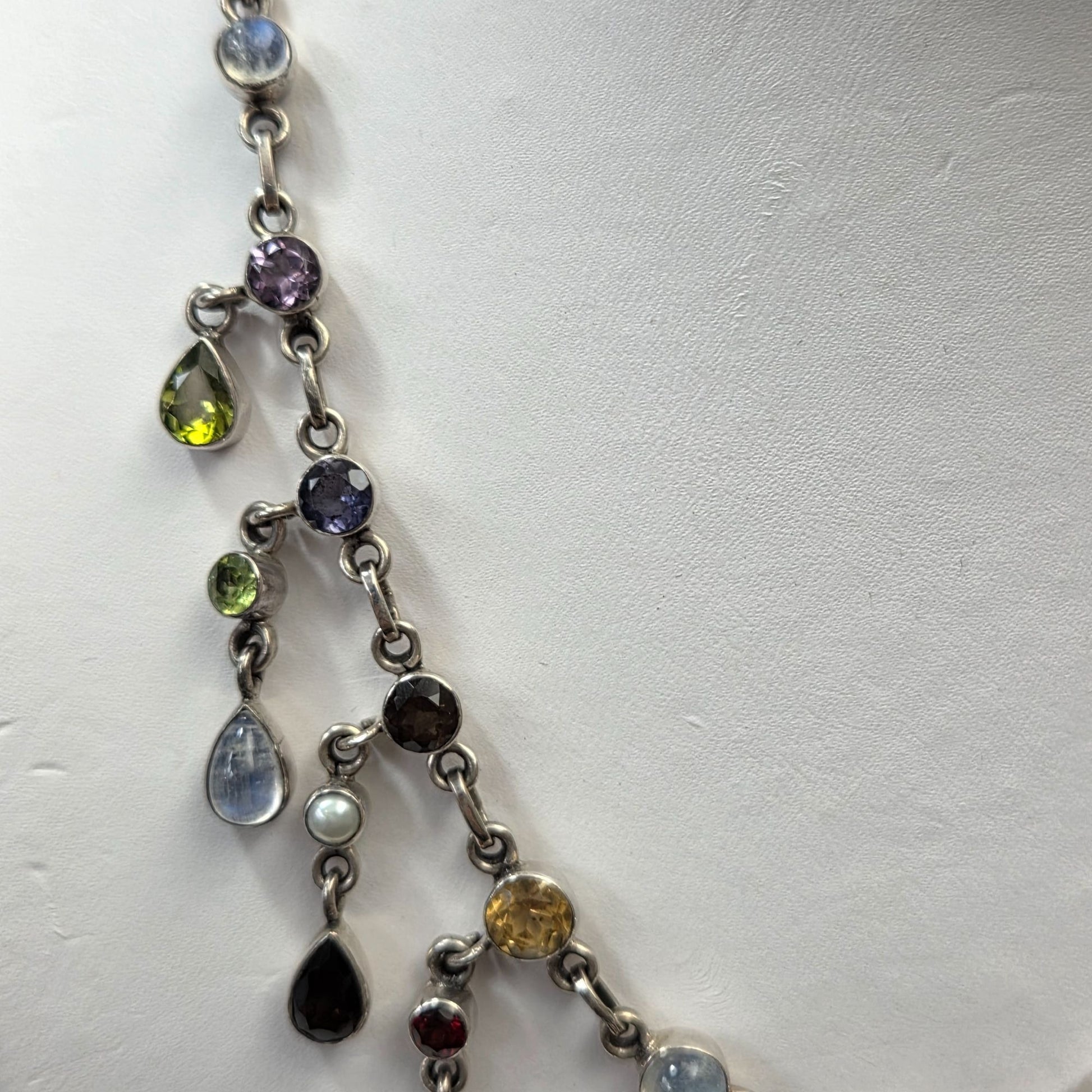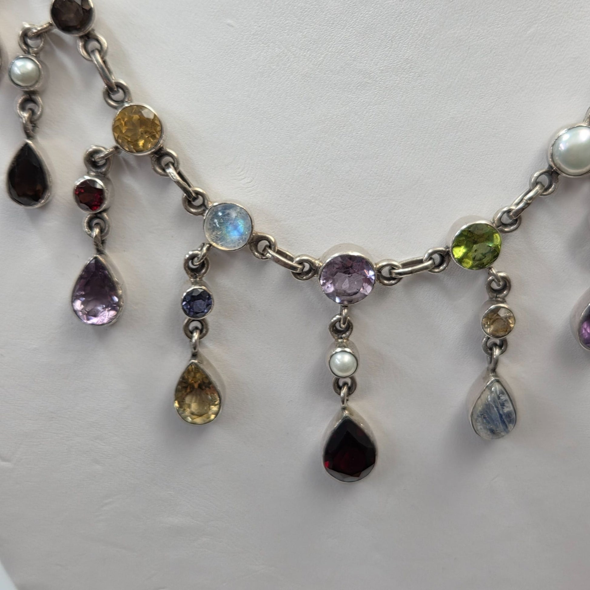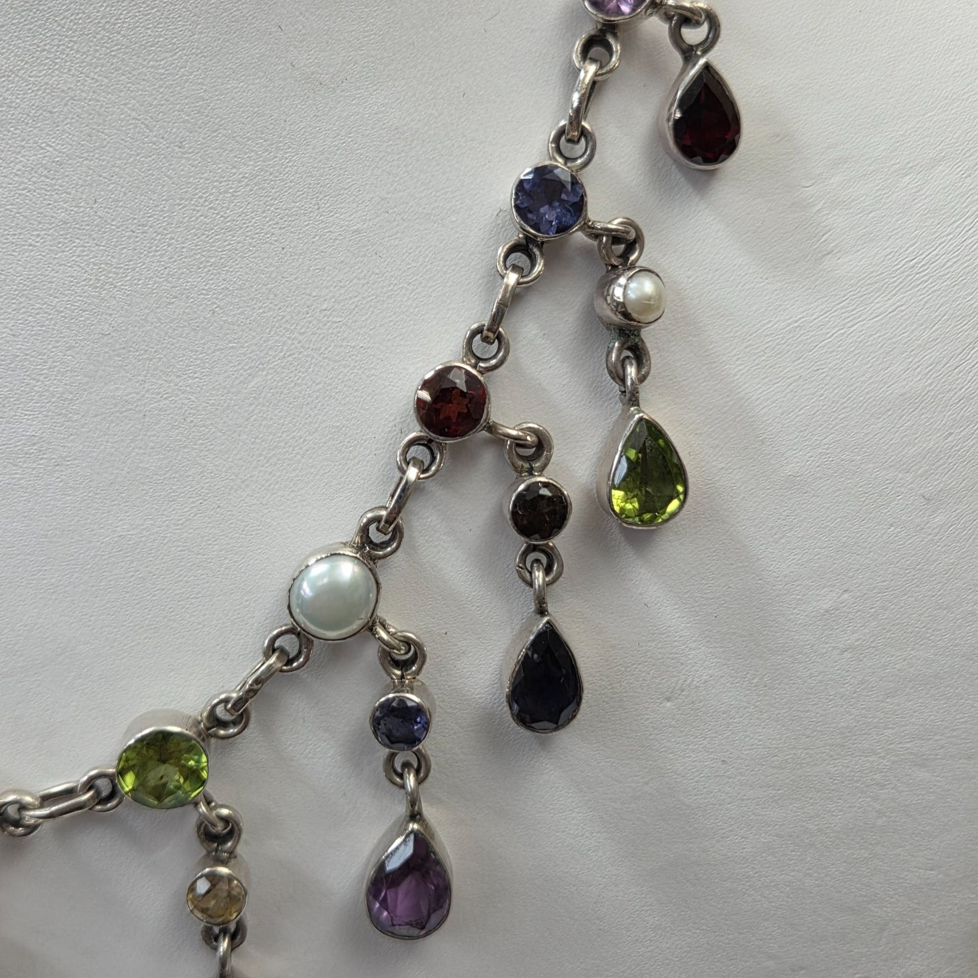 A captivating masterpiece by Nicky Butler, this sterling silver necklace showcases a cascade of teardrop gemstones in vibrant hues, accented with luminous pearls. Its elegant design tells a tale of timeless sophistication, making it a treasure for those who adore artful craftsmanship and vivid, multi-colored elegance.