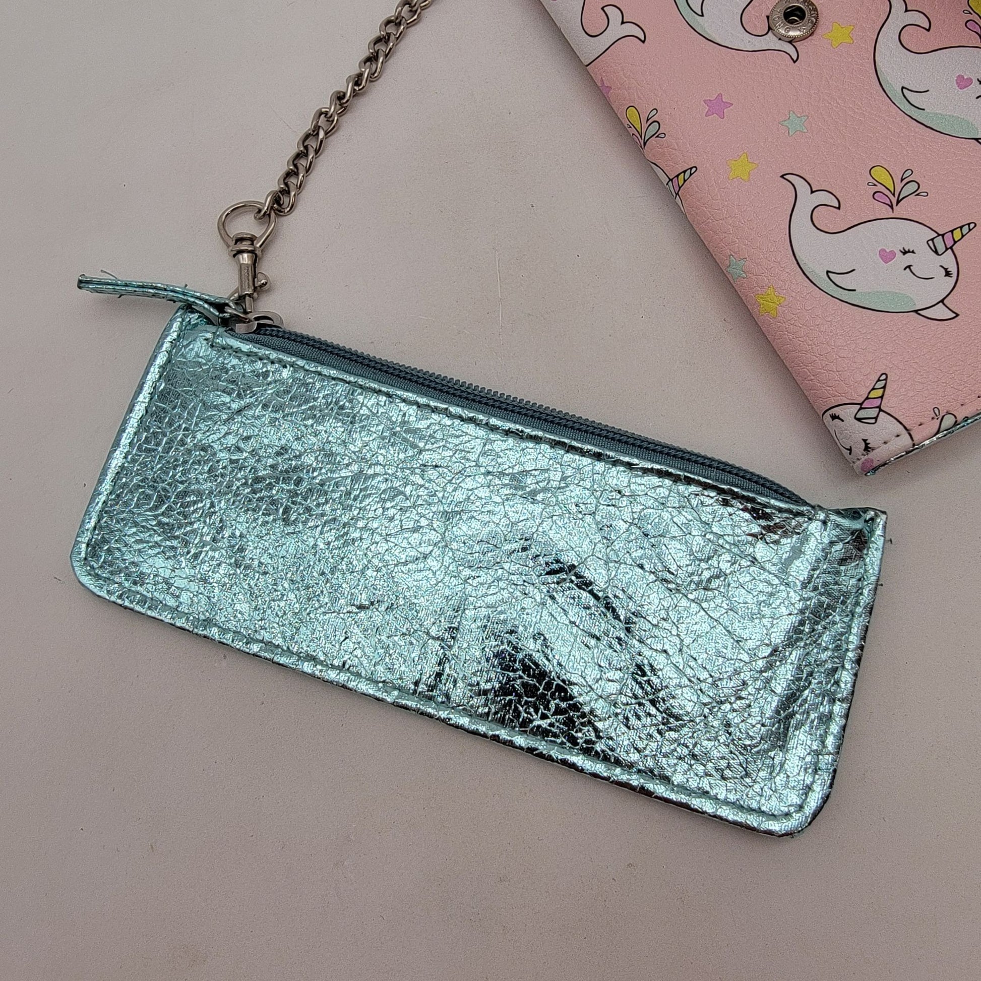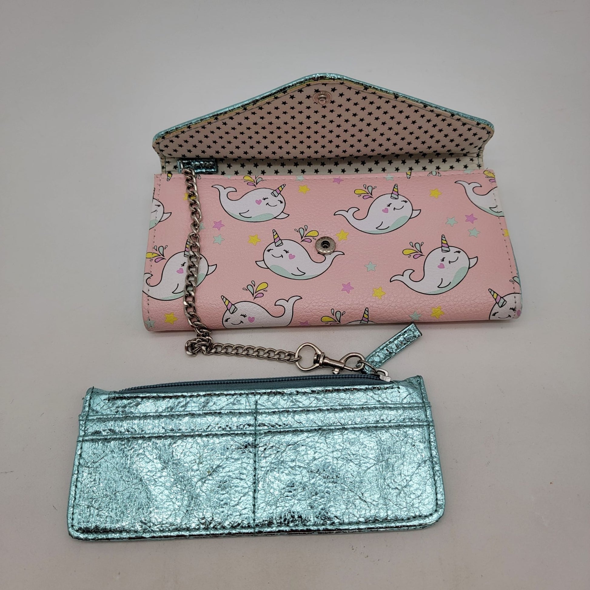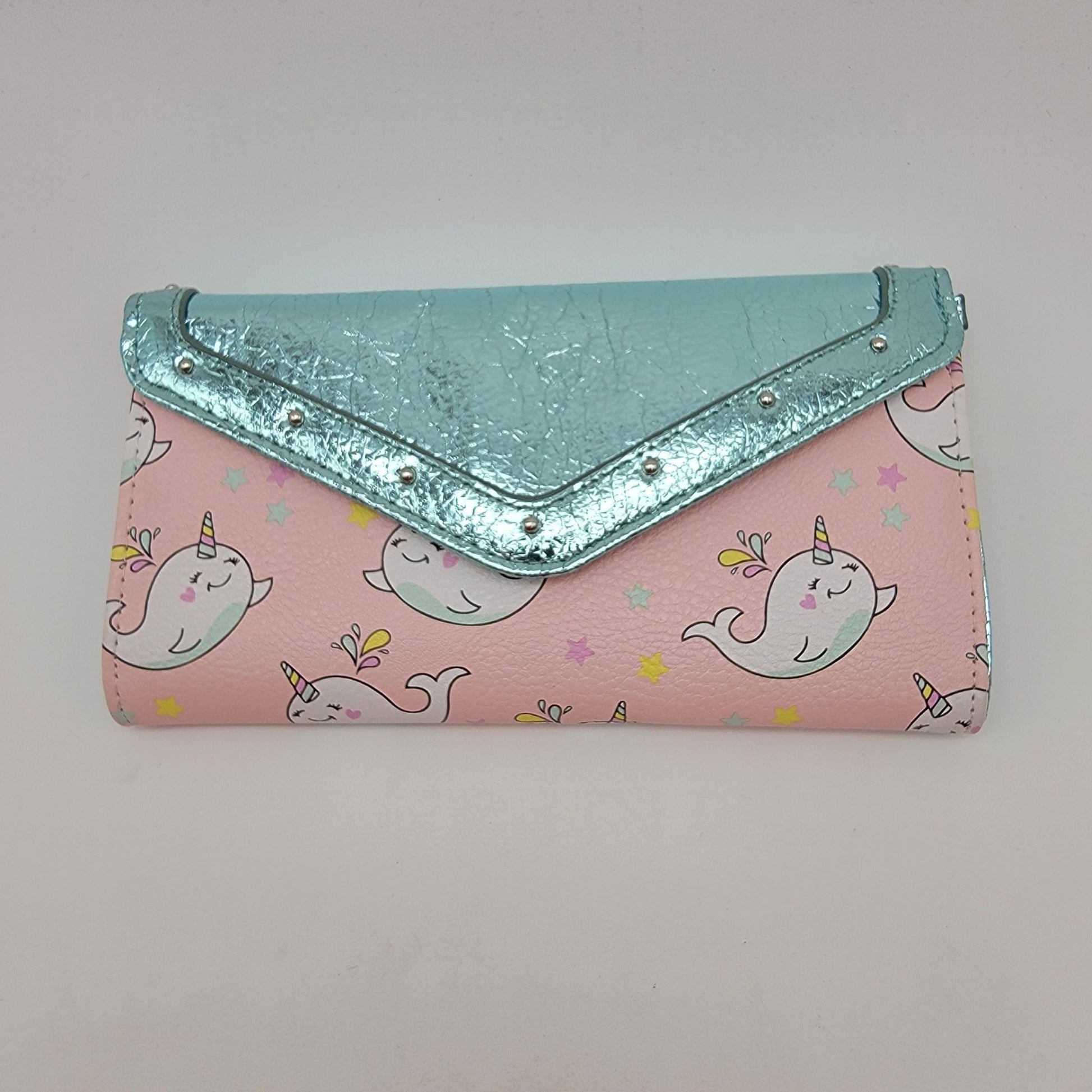 This chic clutch wallet features playful narwhal designs on faux leather, complemented by a metallic blue detachable purse. Functional and stylish for versatile use.
