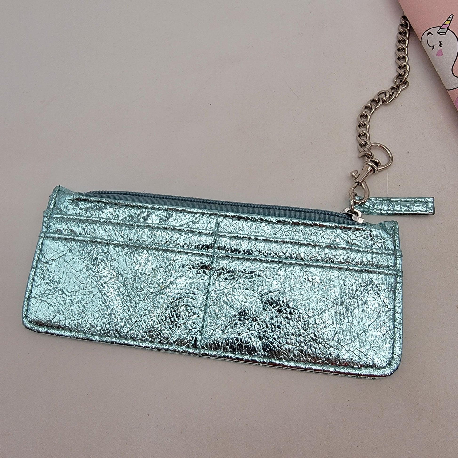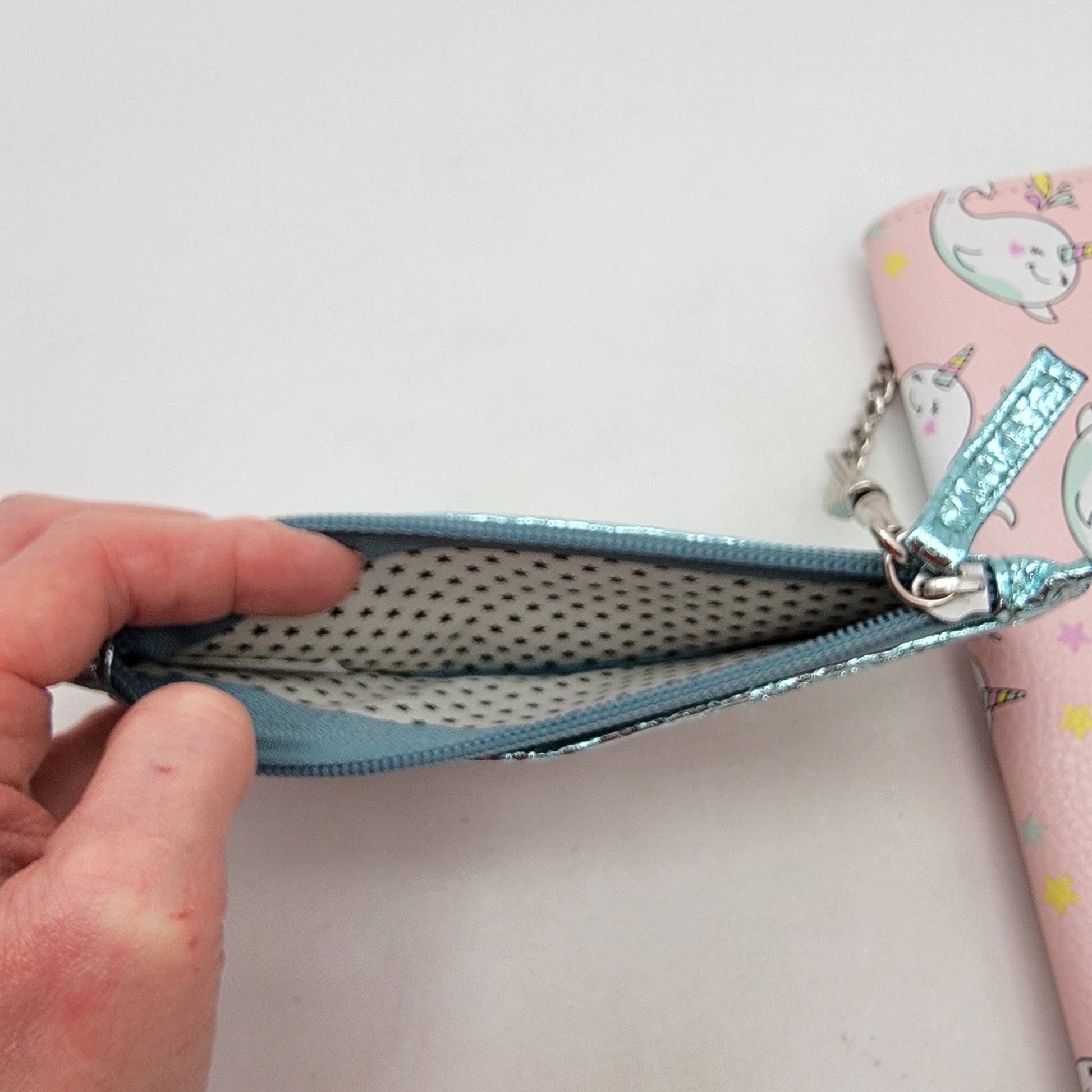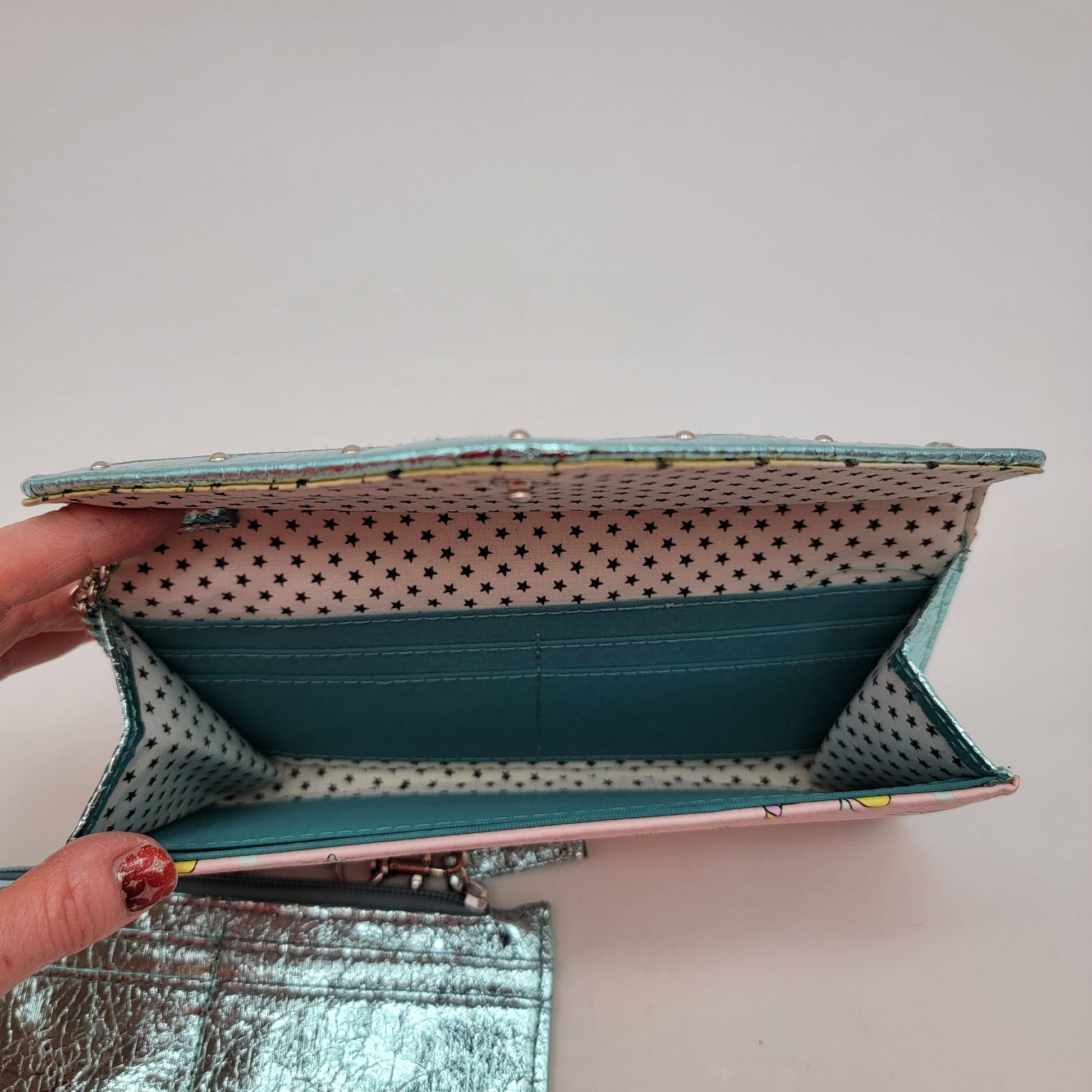 This chic clutch wallet features playful narwhal designs on faux leather, complemented by a metallic blue detachable purse. Functional and stylish for versatile use.