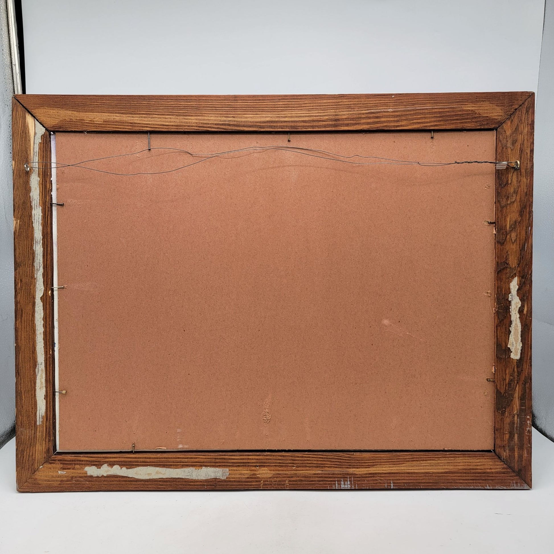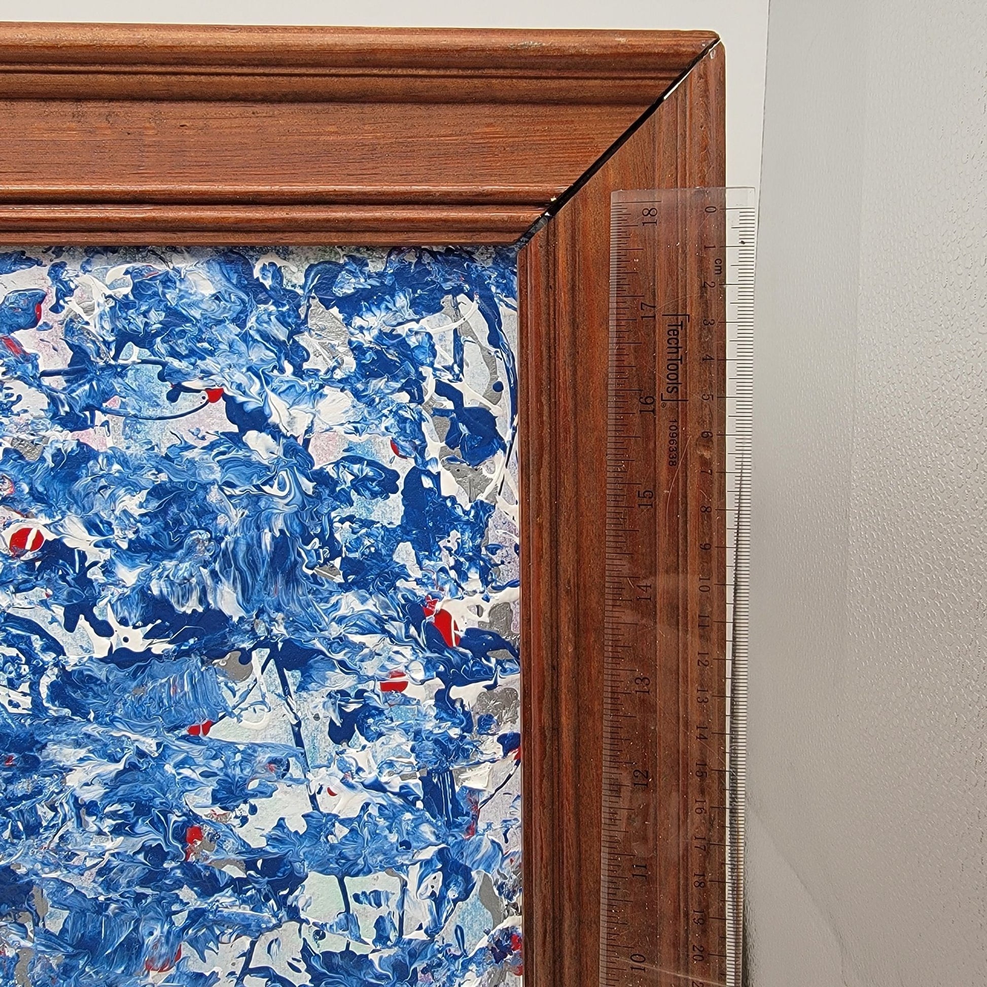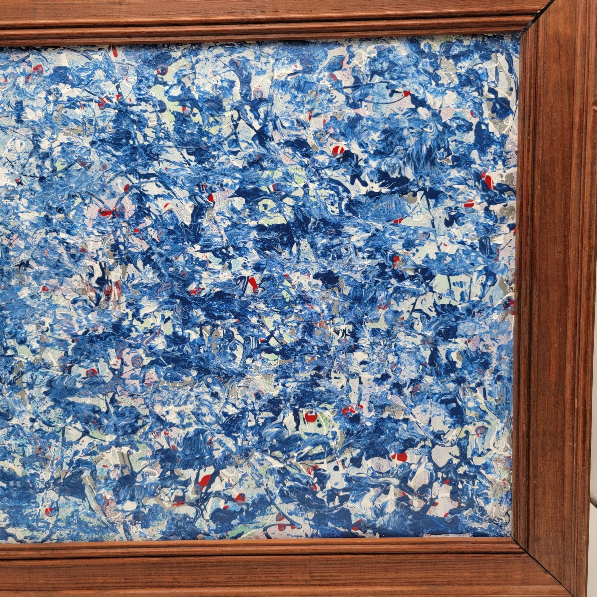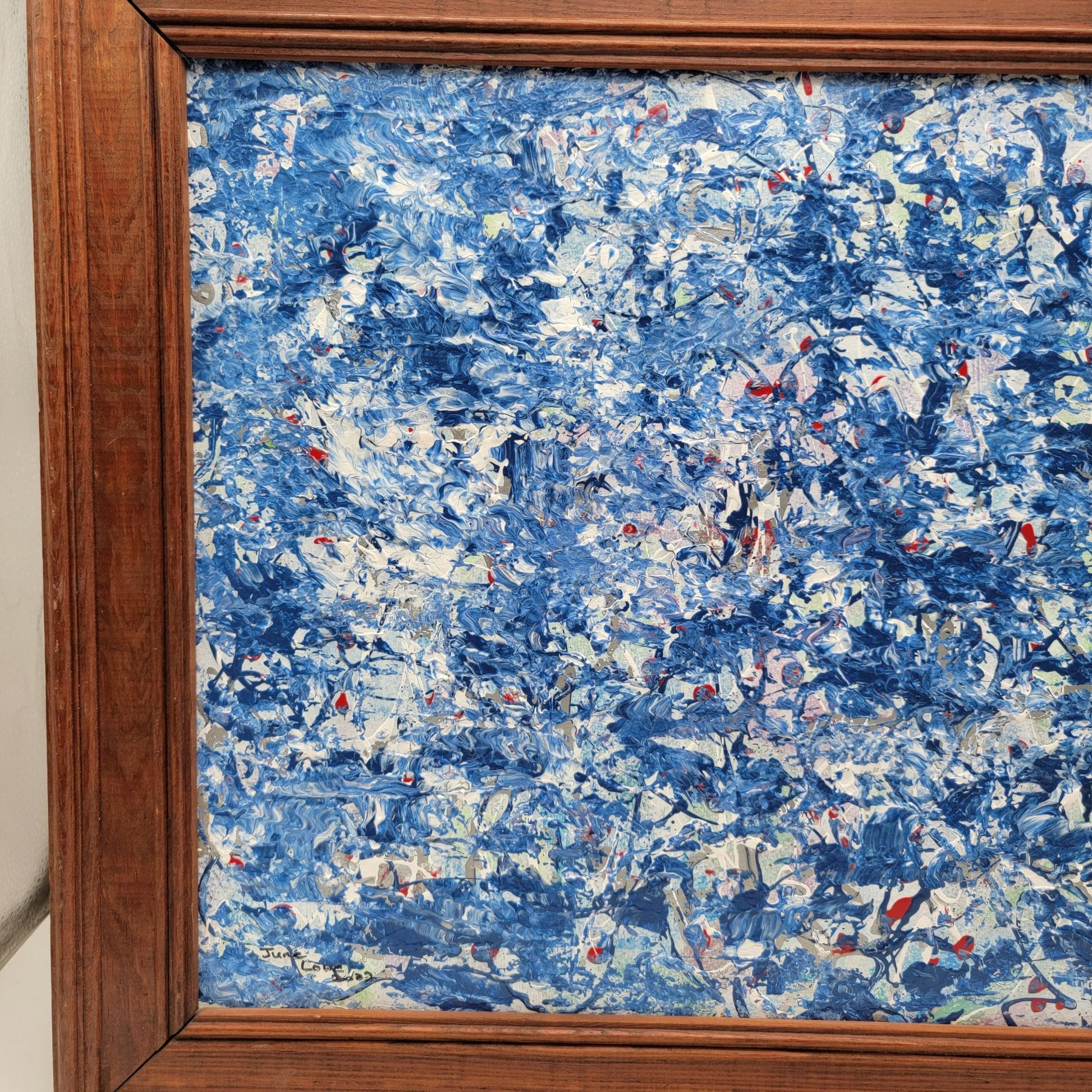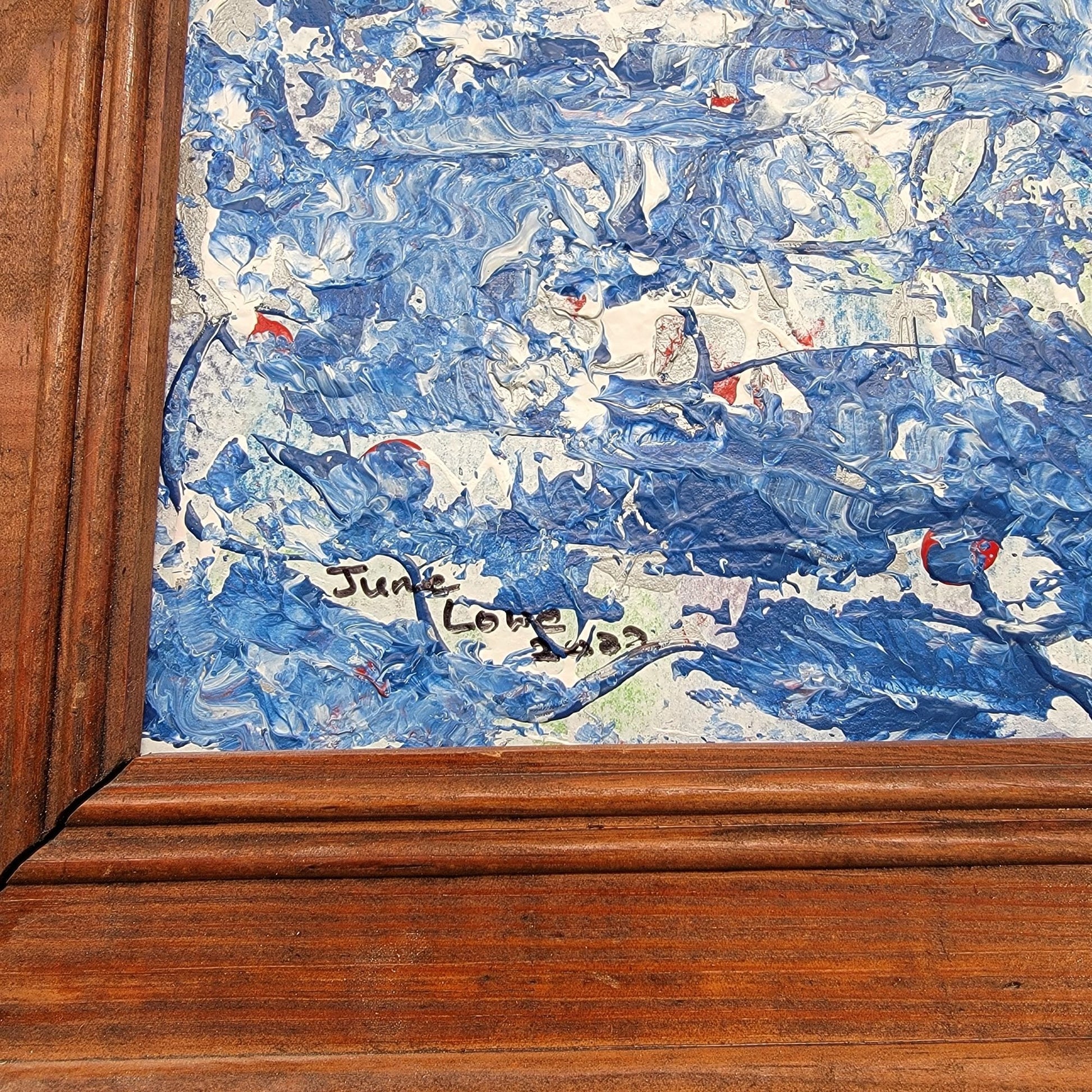 In 2021, artist June Lowe captured a symphony of blues and whites in this textured impasto painting. The rustic wooden frame completes this unique masterpiece.