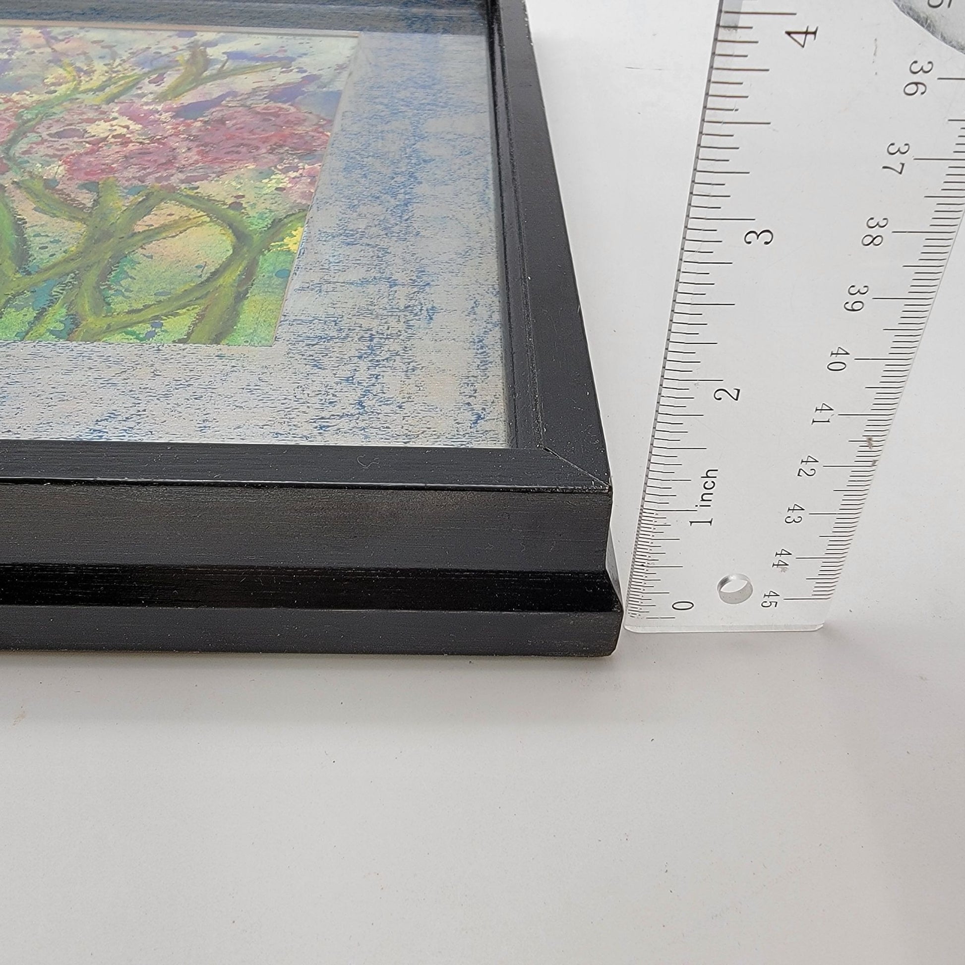This vibrant original artwork by June Lowe captures the essence of nature through splattered hues and bold floral strokes. Encased in a textured blue matte and black frame, its dimensions and intricate details make it a striking centerpiece for any room.