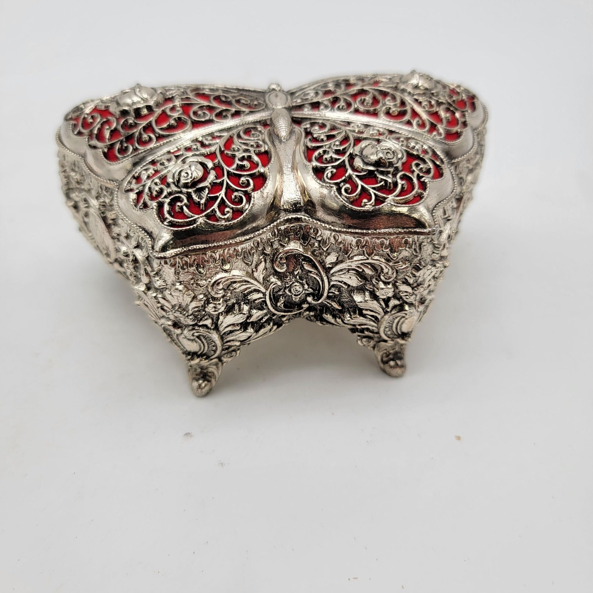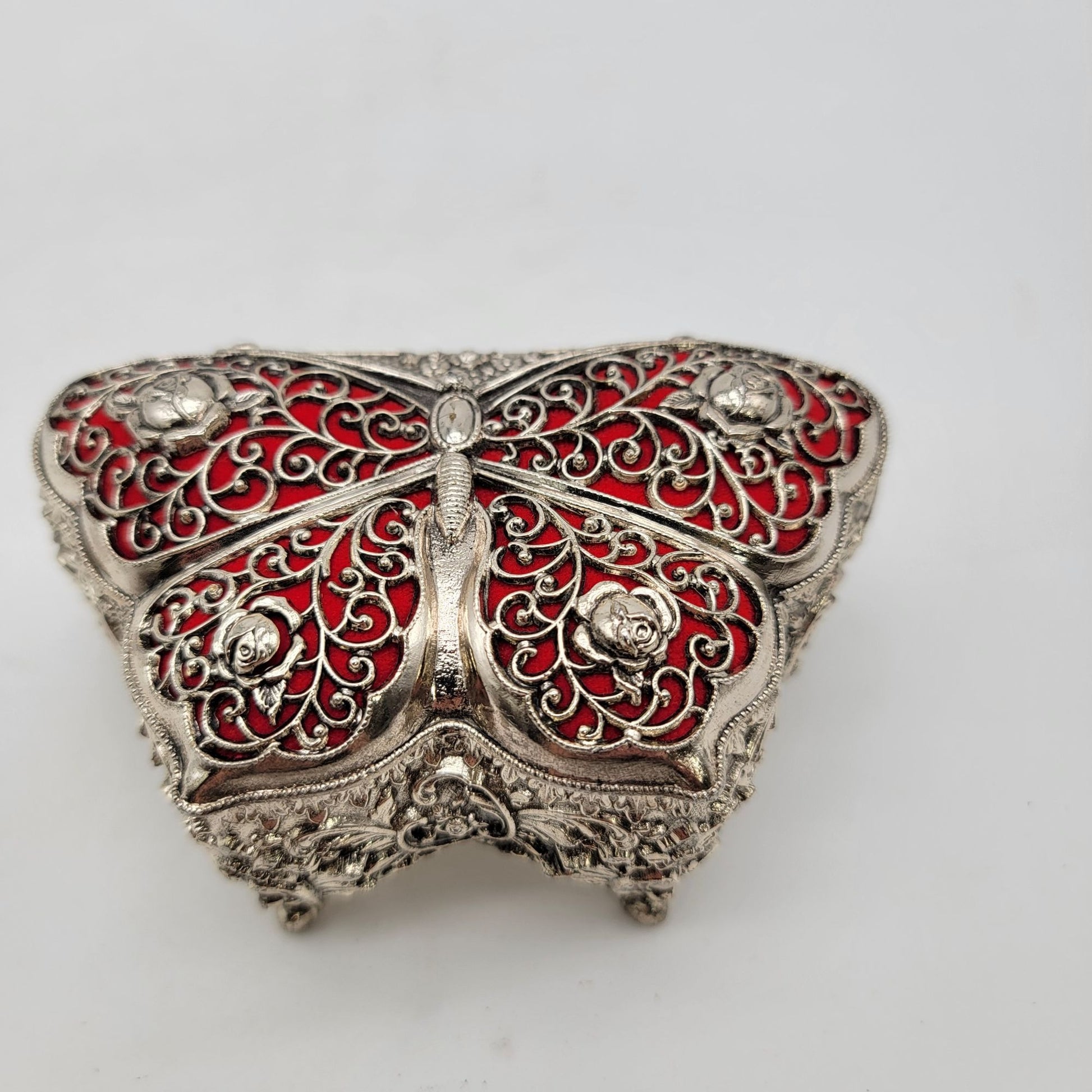This exquisite butterfly-shaped trinket box showcases an elaborate filigree design with a luxurious red enamel finish. Its vintage charm makes it a captivating piece for those who appreciate timeless elegance. The box stands on delicate legs, adding to its regal appearance, while its interior is lined in rich red fabric, offering a touch of sophistication and protection for your cherished keepsakes.