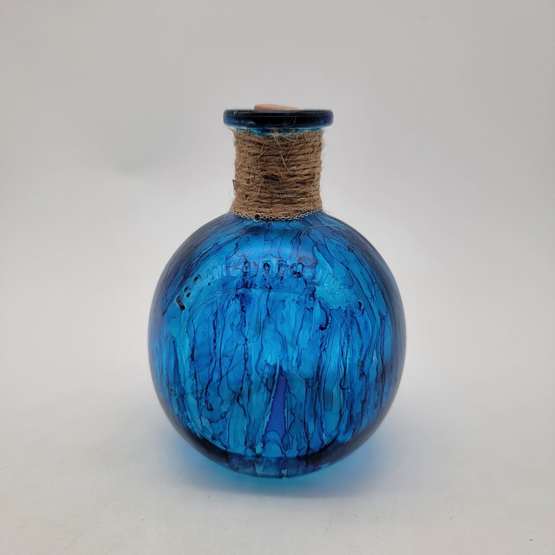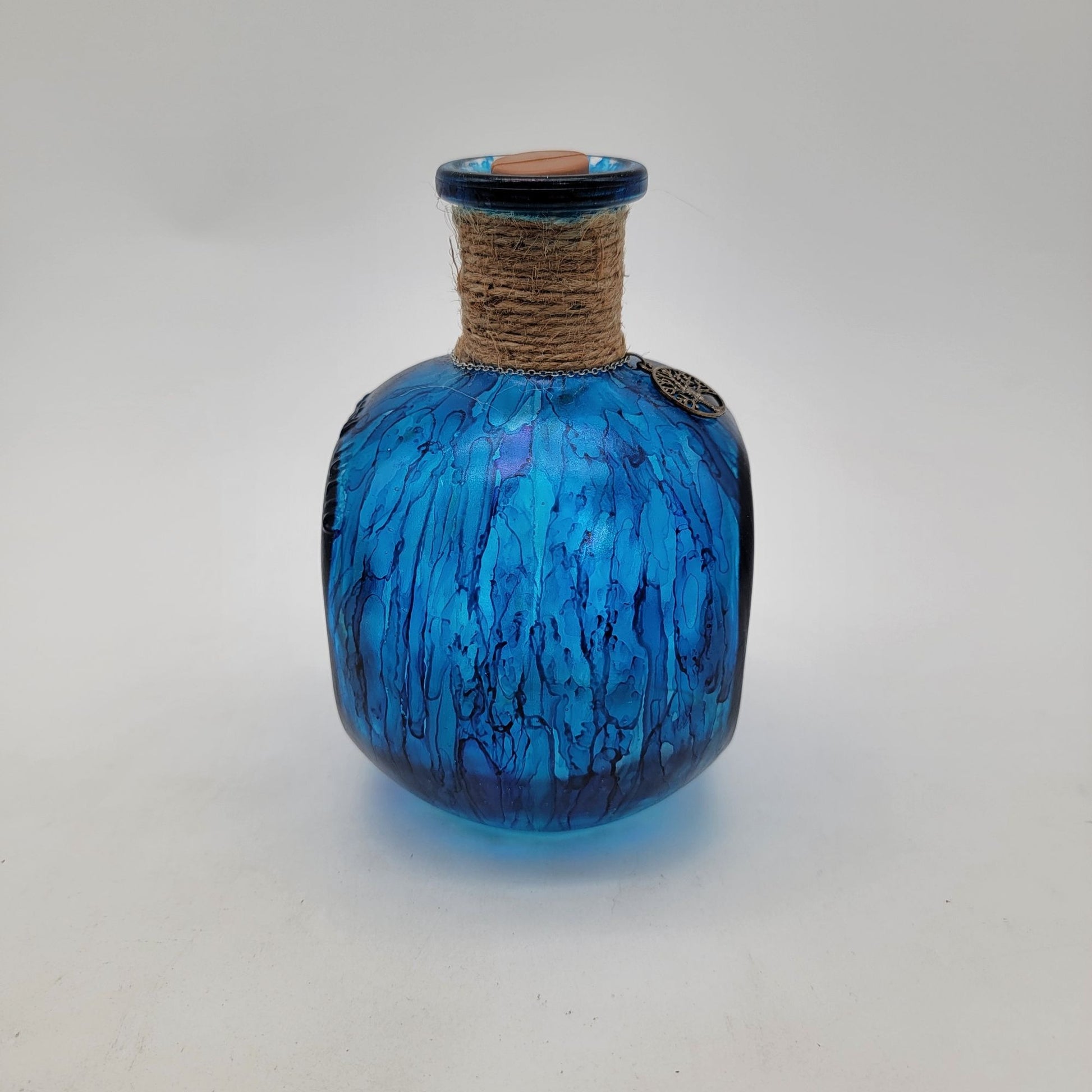 This hand-painted blue glass bottle features a unique marbled design, natural jute accent, and a Tree of Life charm. A visually striking decorative piece.