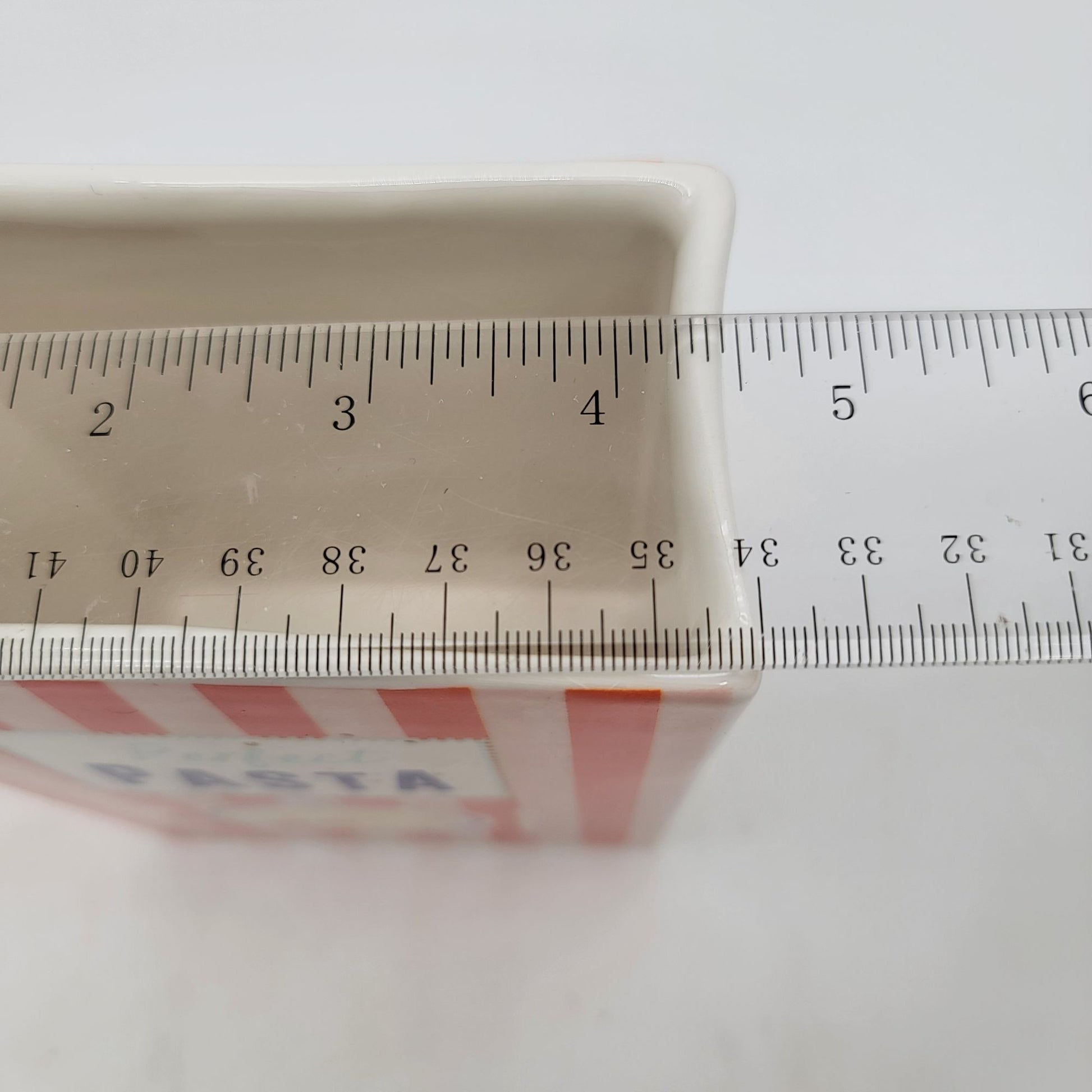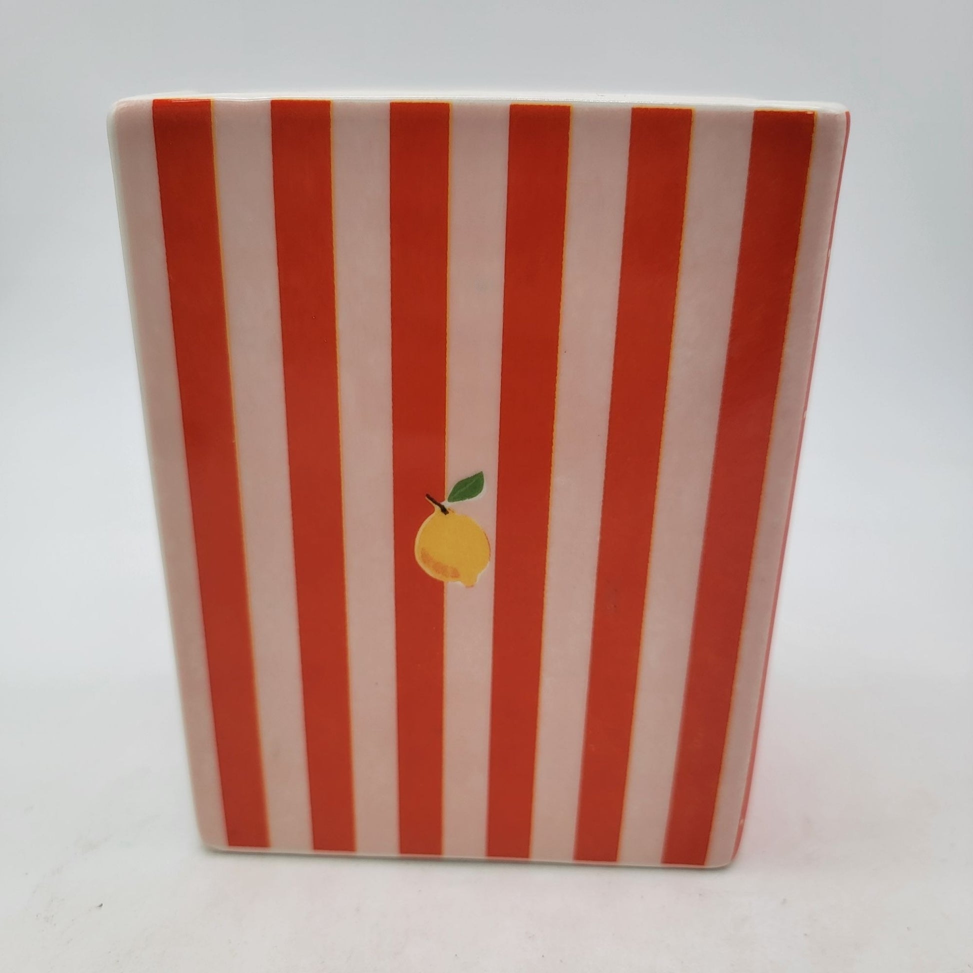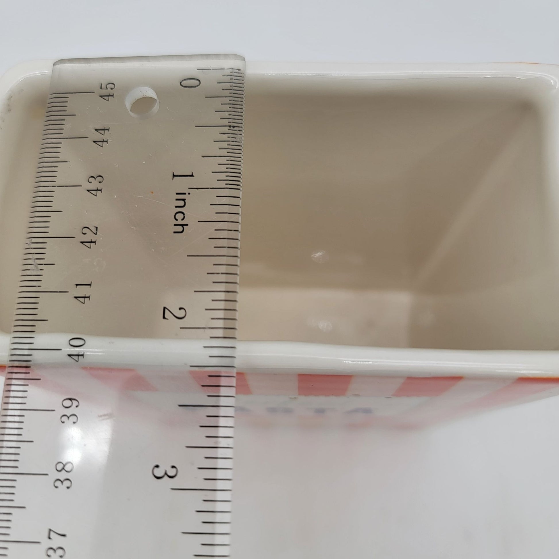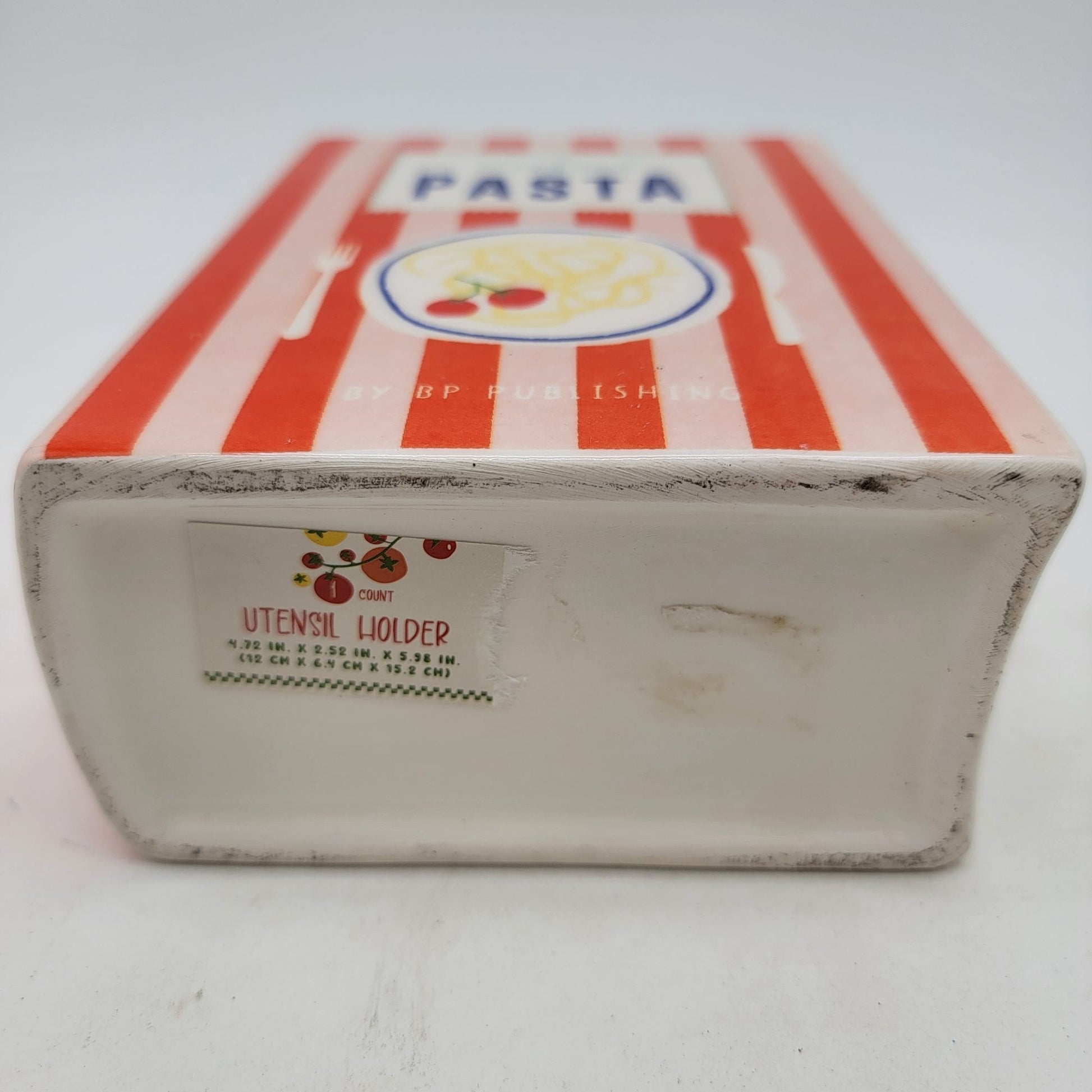 This ceramic utensil holder, designed with a vibrant red and white striped pattern, adds a touch of charm to any kitchen. It features a stylish "Perfect Pasta" graphic, making it both decorative and practical for organizing kitchen tools. Durable and easy to clean, it's an ideal addition to any culinary space.
