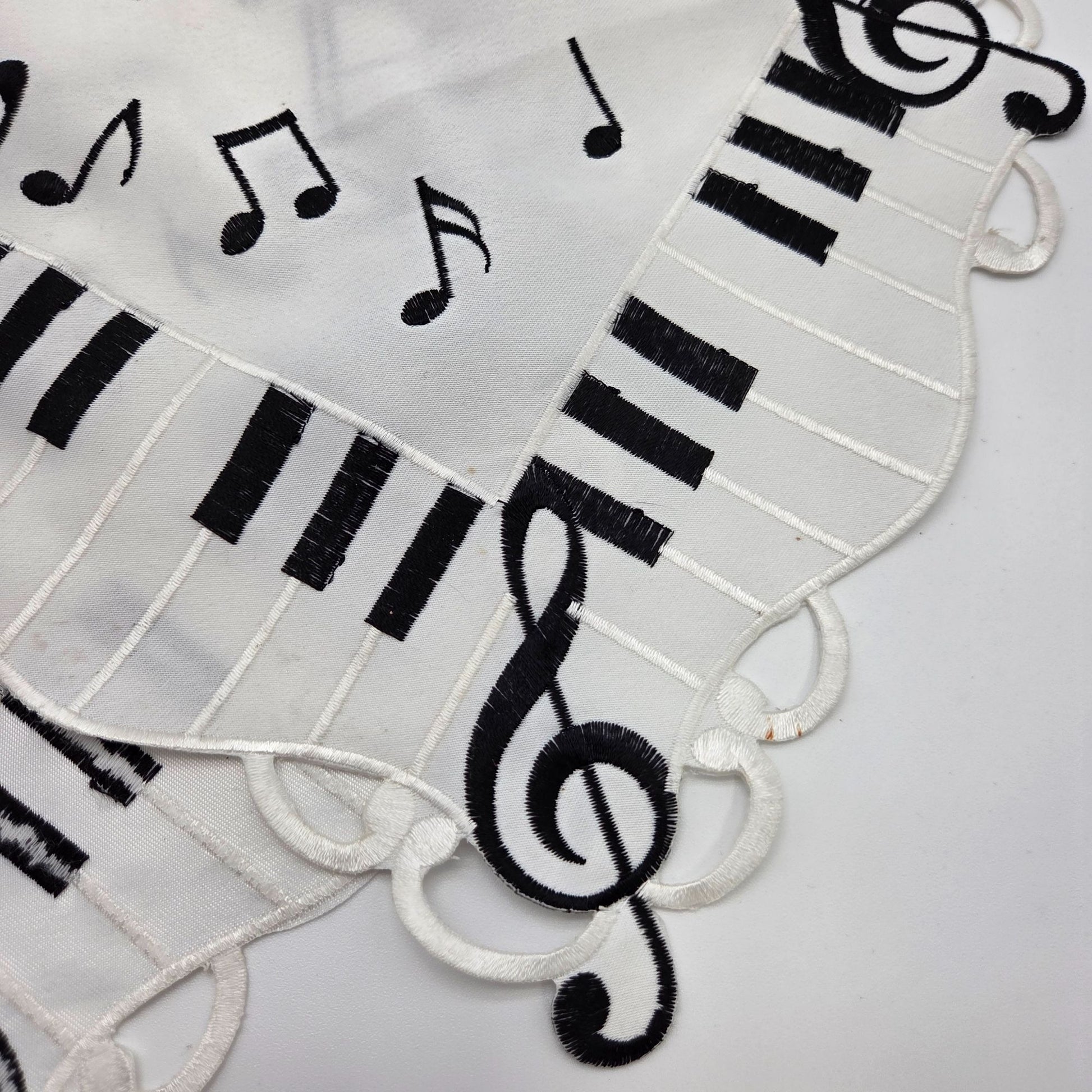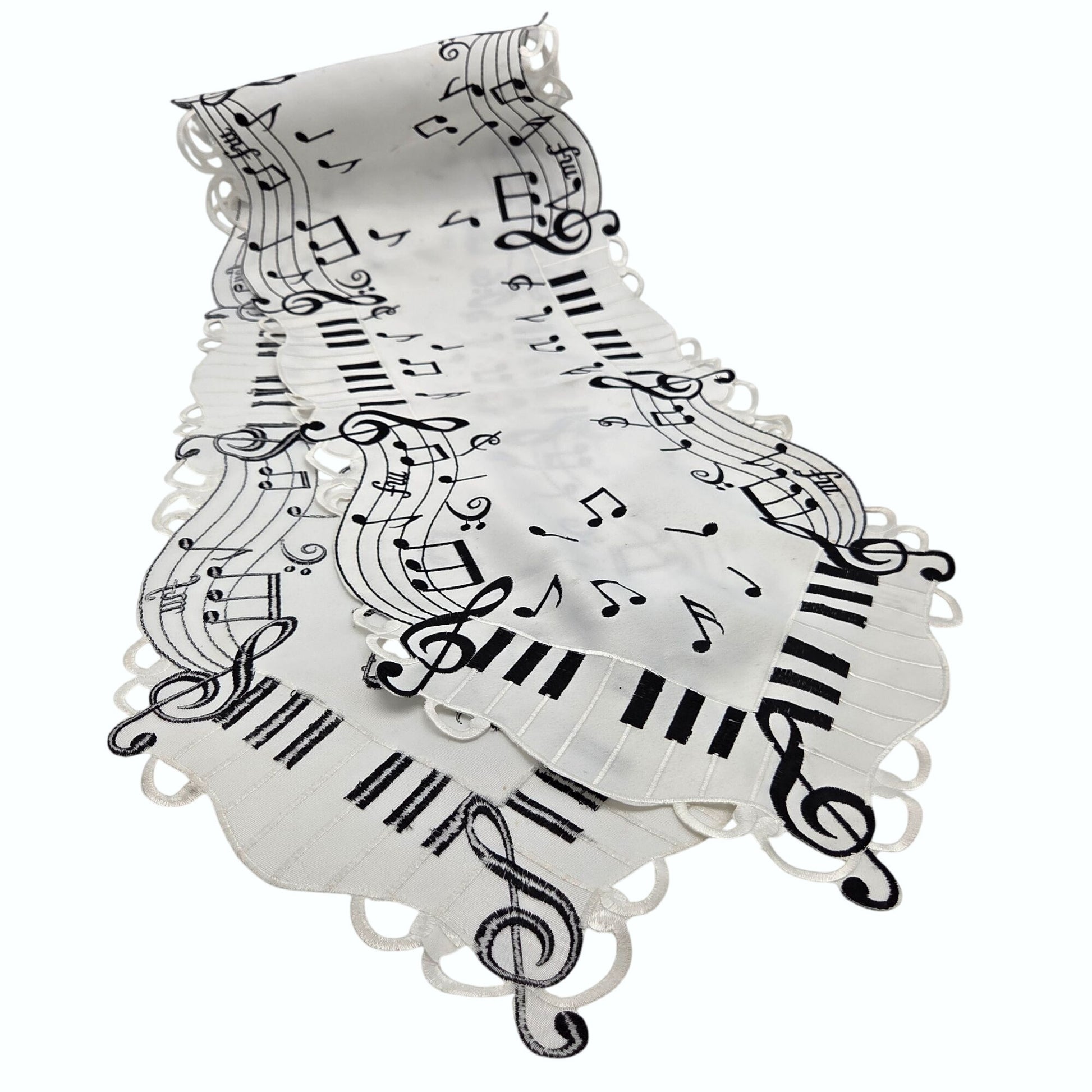 This elegant table runner features a piano and music-themed design in white and black. Its intricate embroidery adds sophistication to your dining space.