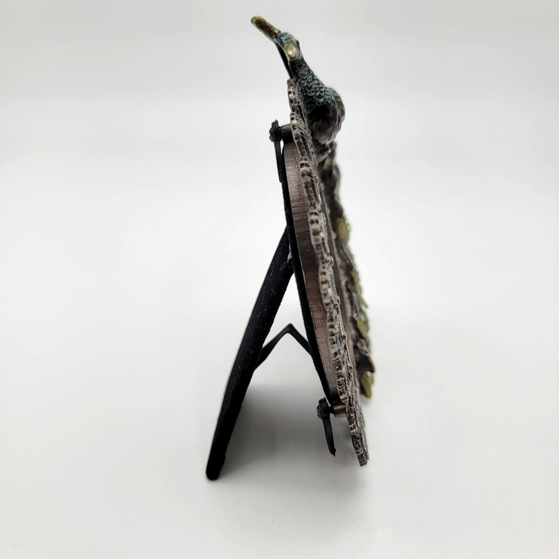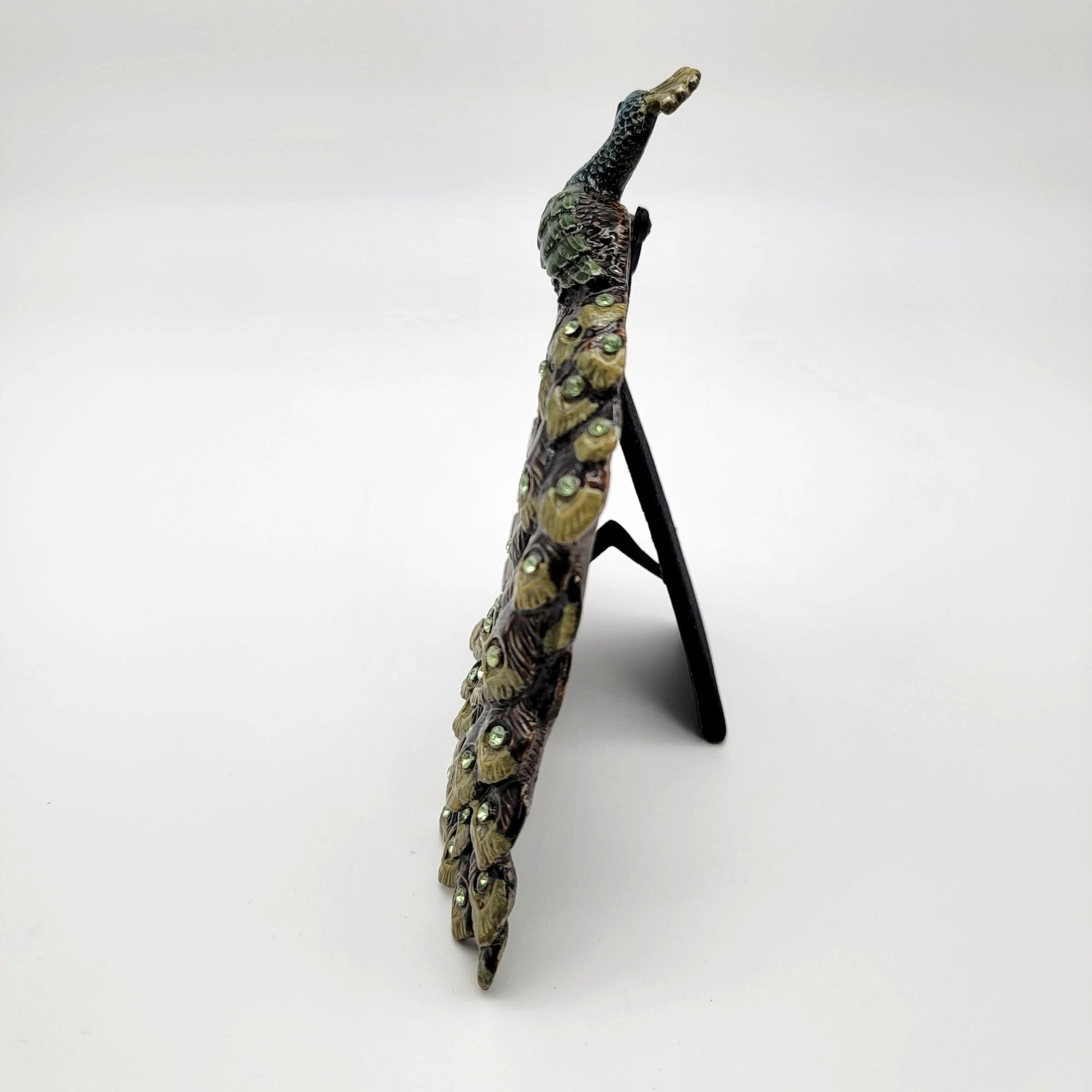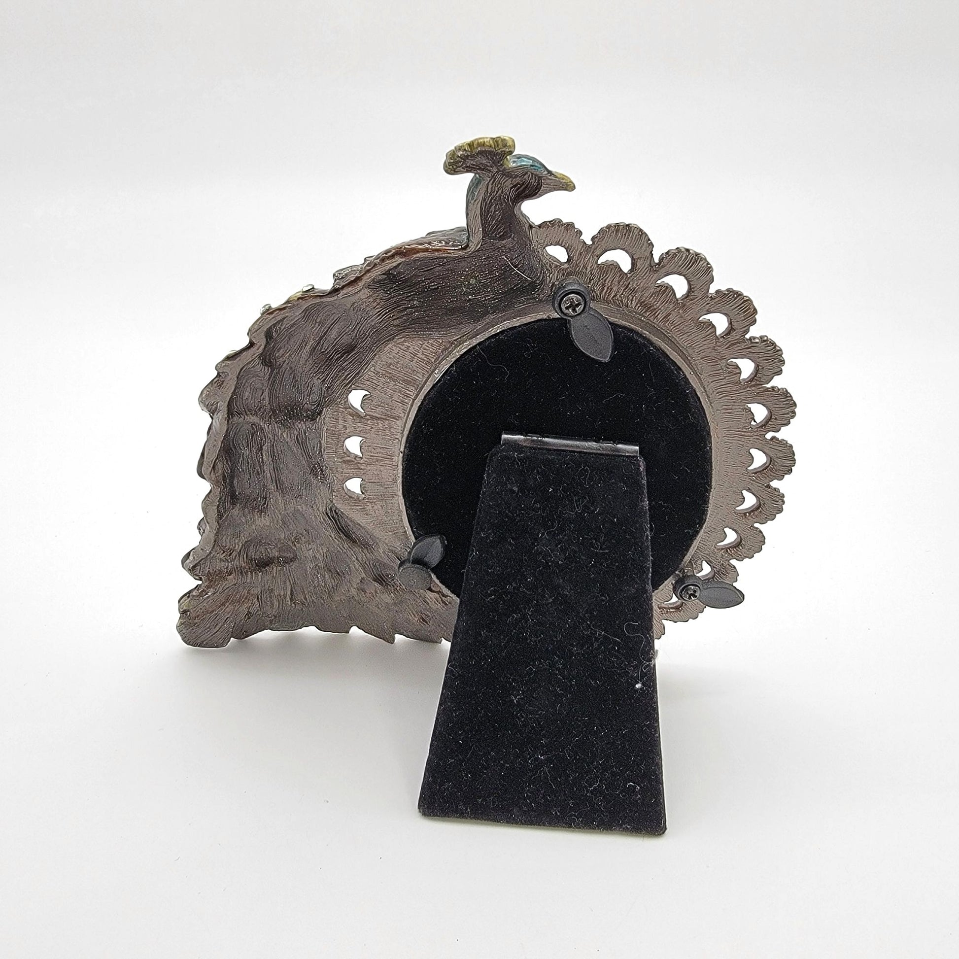 A majestic peacock perches atop this ornate photo frame, its feathers adorned with sparkling green jewels. This frame transforms your cherished photo into a centerpiece of timeless elegance, blending artistry with functionality. The intricate detailing and vibrant hues evoke a sense of regality, making it a conversation starter for any room.