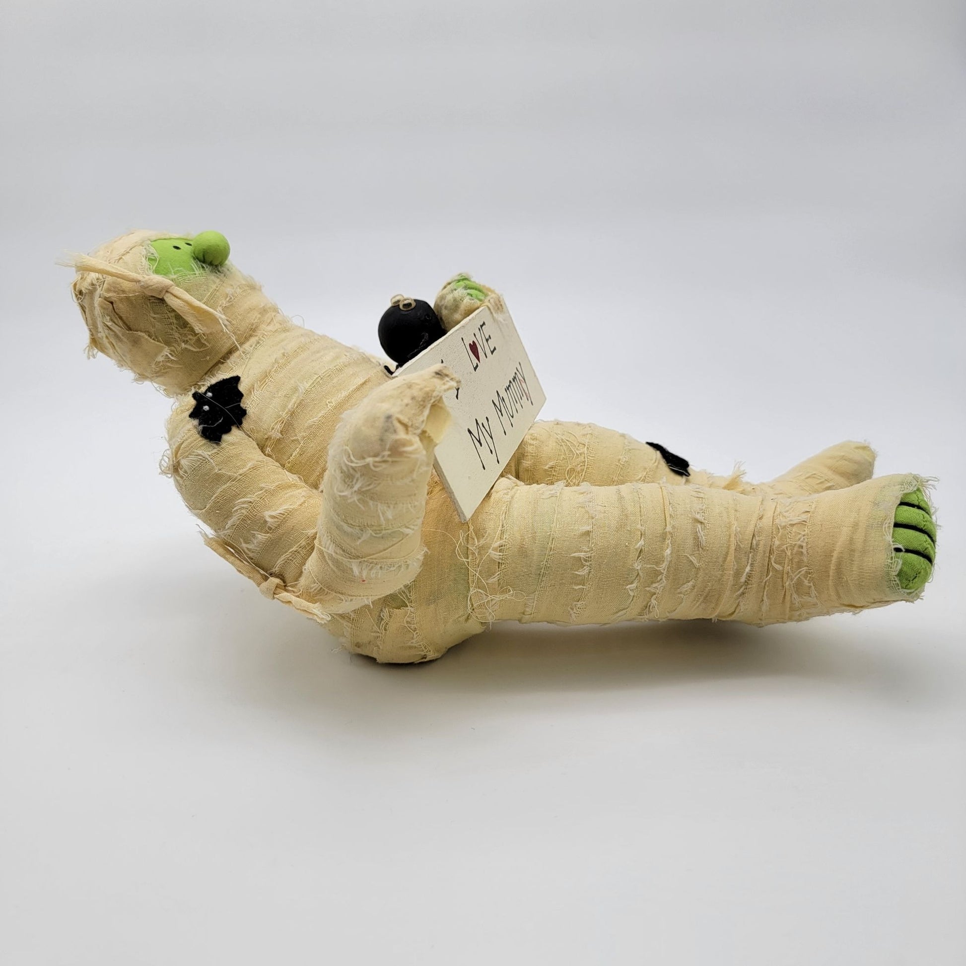 This primitive-style Halloween mummy doll features a charming design with distressed fabric wrapping, holding a whimsical "I Love My Mummy" sign and spider. Ideal for rustic seasonal decor.