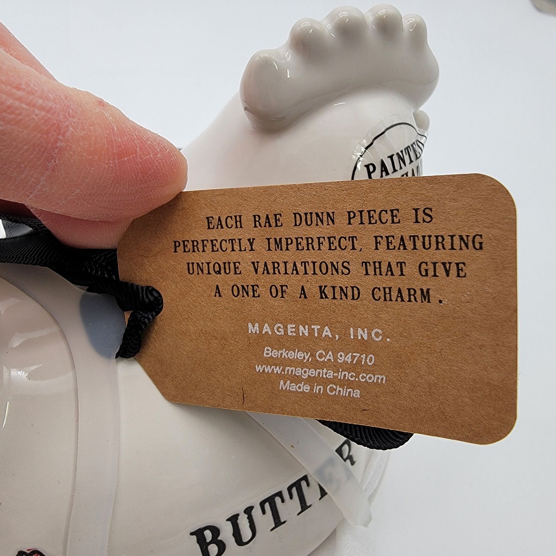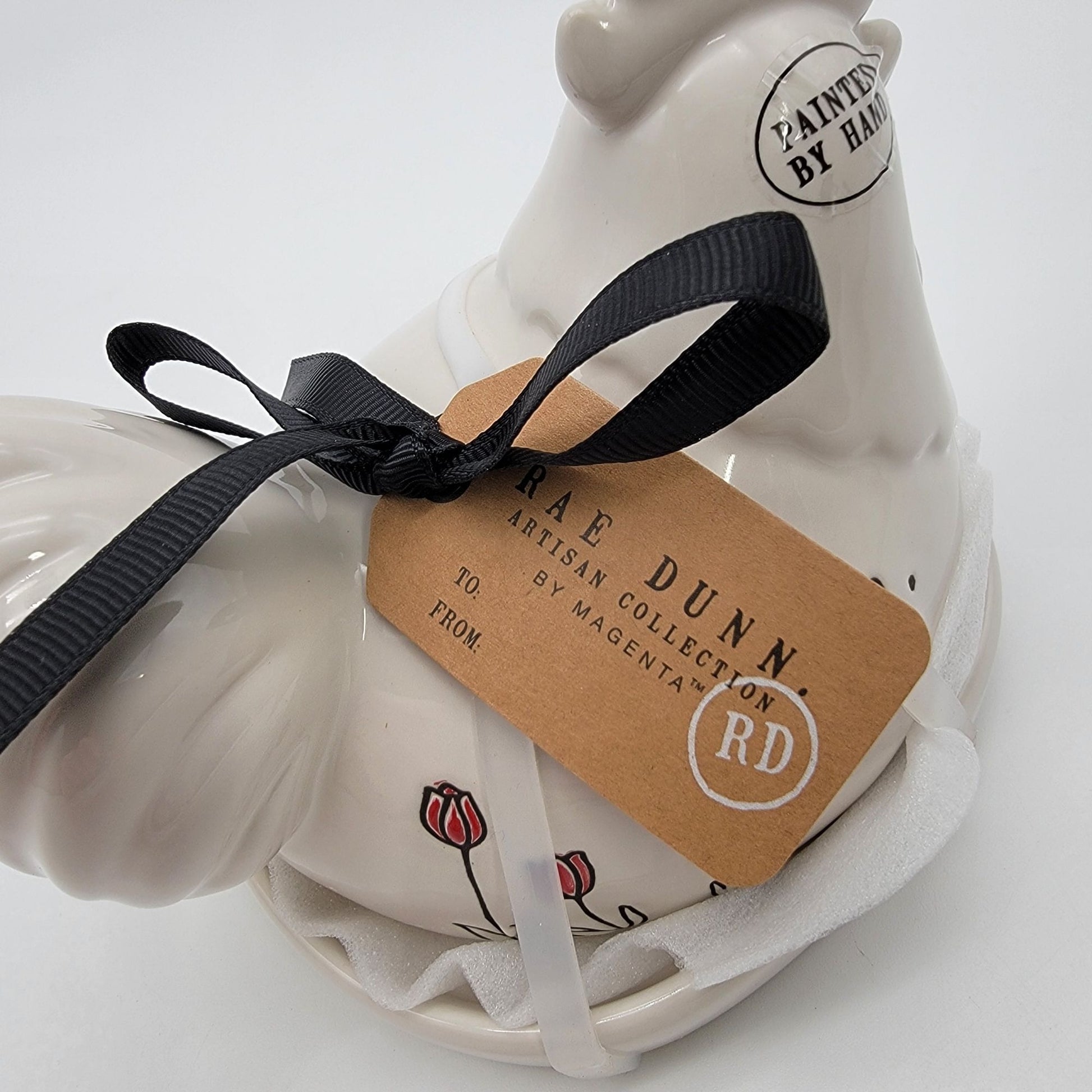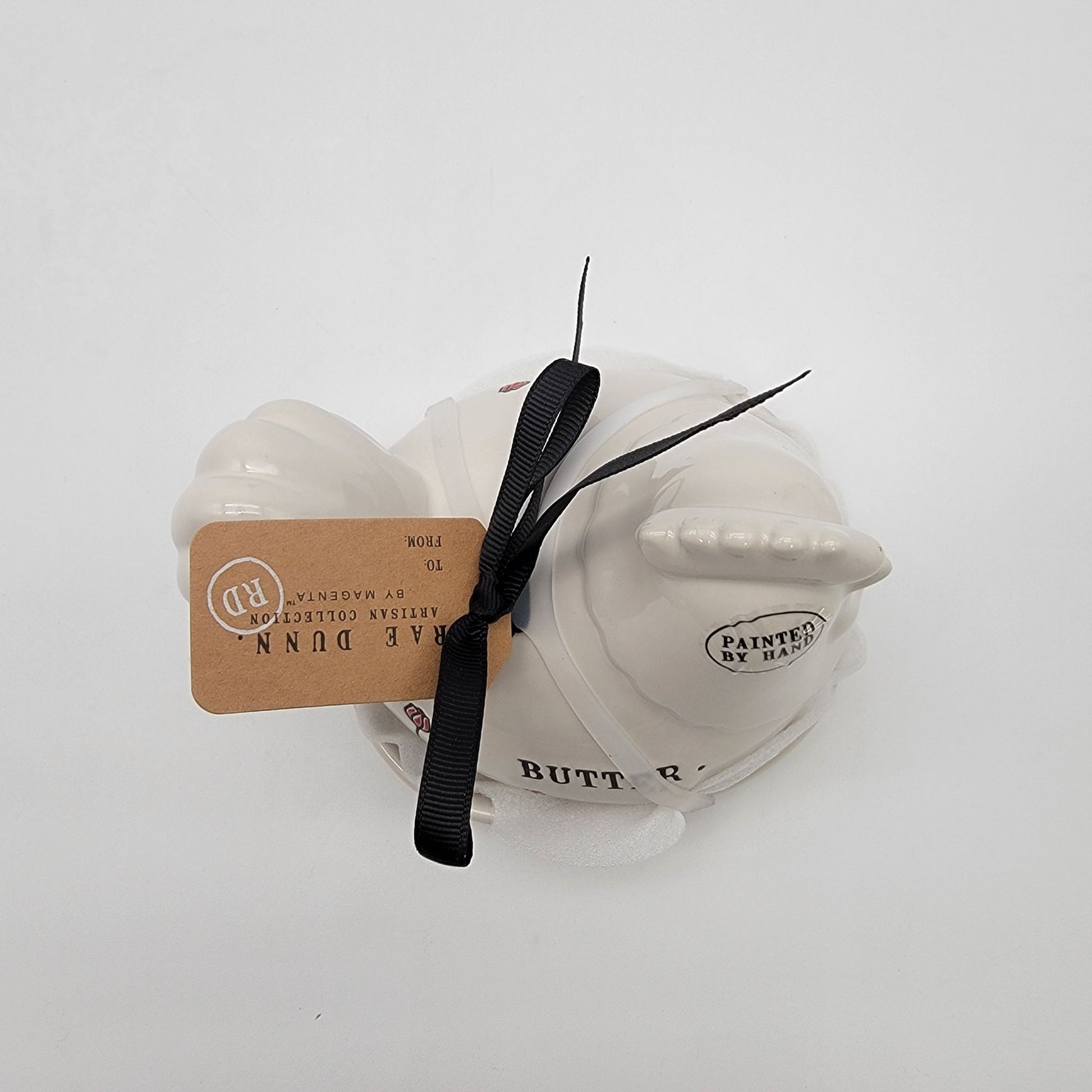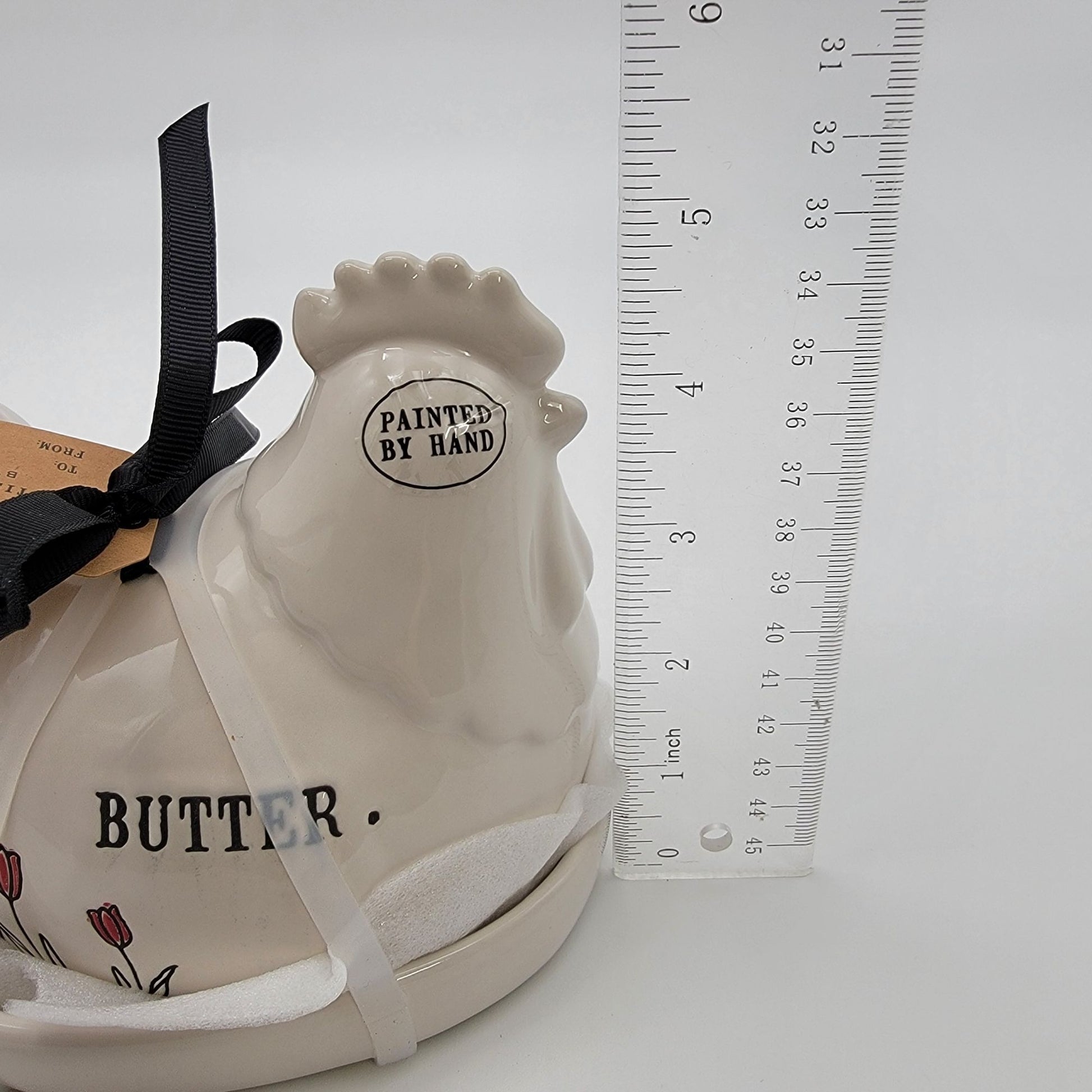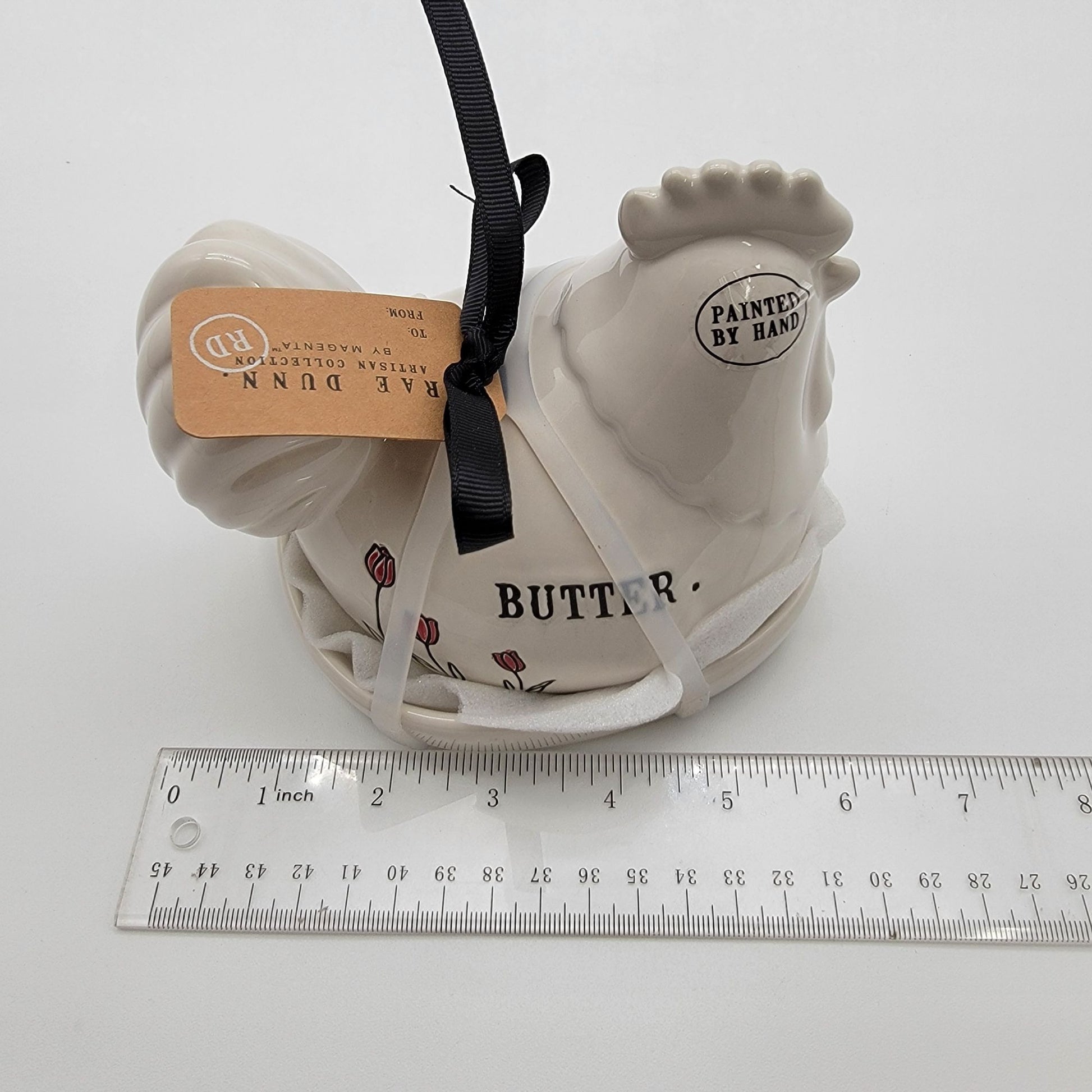Elevate your dining table with this Rae Dunn ceramic butter dish. Hand-painted with charming details, it combines practicality with a touch of farmhouse elegance.