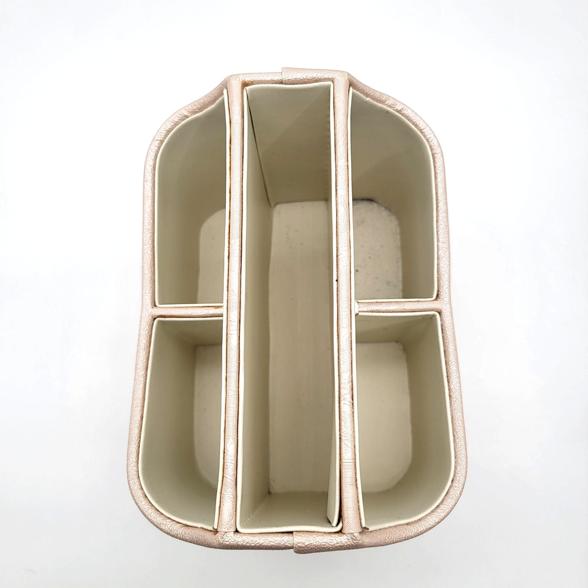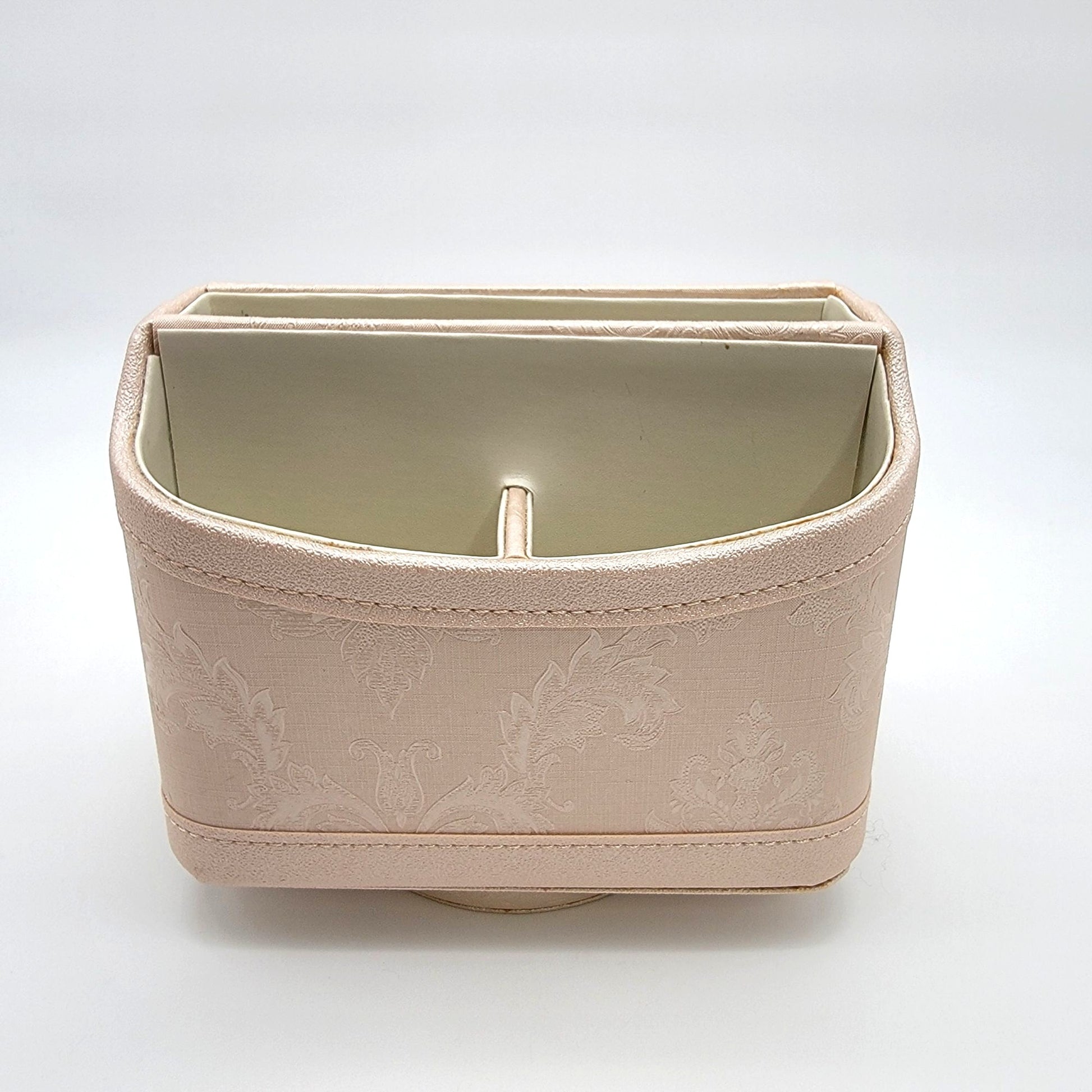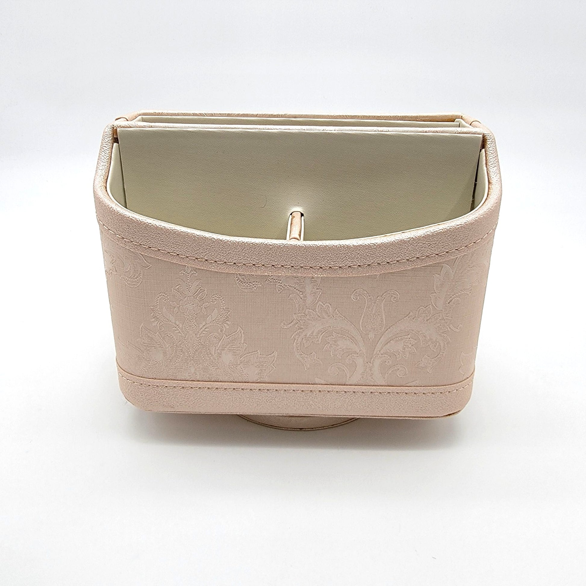 This organizer is crafted with a sophisticated vegan leather finish and a rotating base, making it a functional and stylish addition to any workspace or living area. Its compact size and divided compartments ensure easy access and organization.