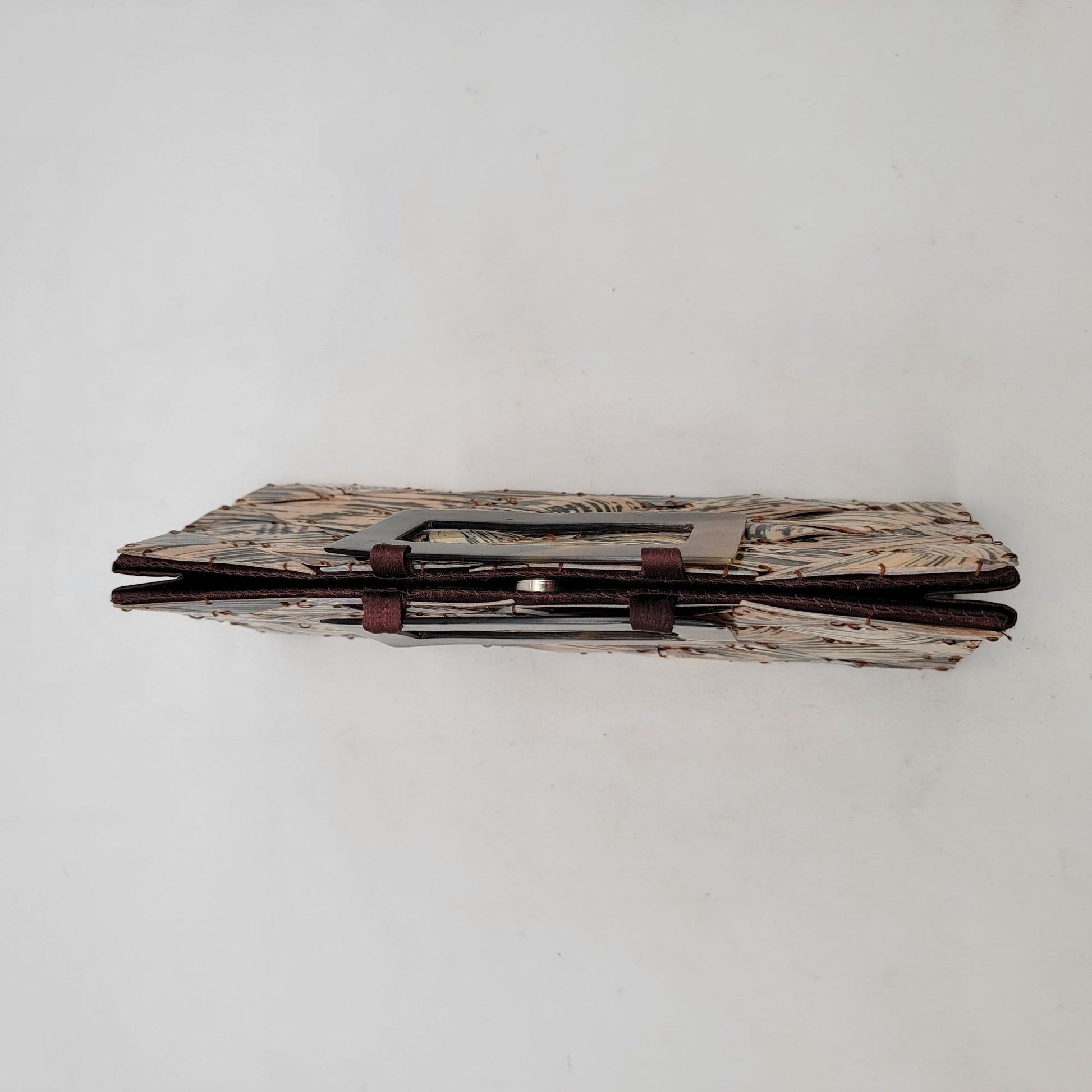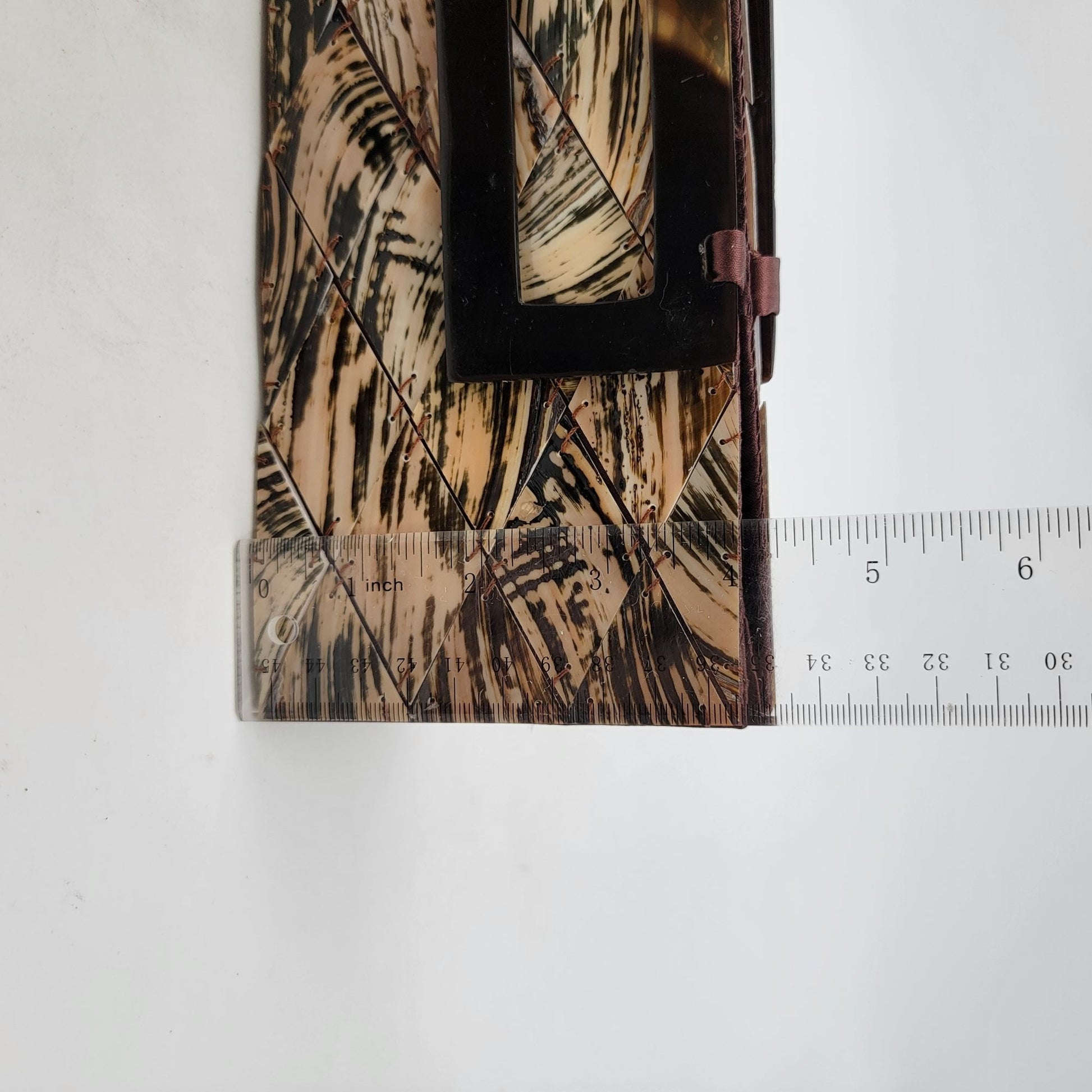 This elegant clutch purse features a shell-tiled design complemented by lucite tortoise shell handles, providing a sophisticated touch. Its compact size makes it ideal for carrying essentials while maintaining a sleek appearance. The unique pattern and quality materials ensure durability and style, making it a versatile addition to any wardrobe.