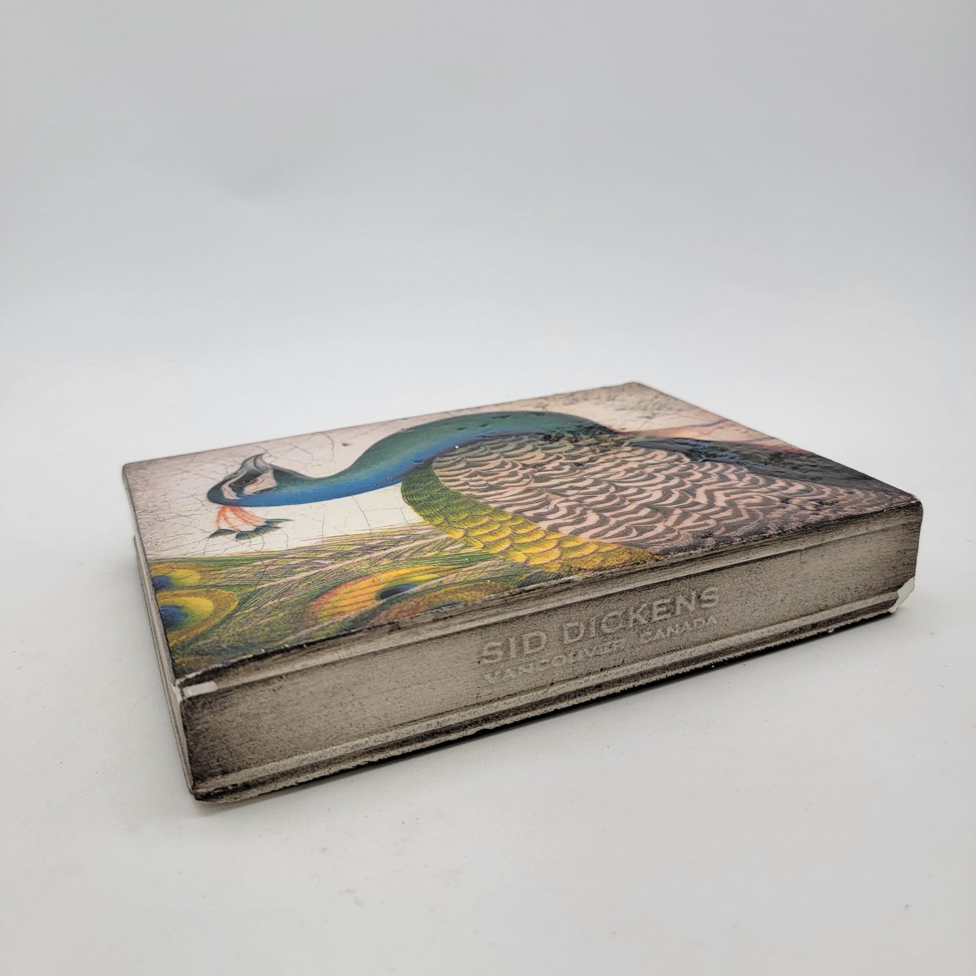 A handcrafted Sid Dickens memory block featuring a vibrant peacock design, symbolizing renewal. Ideal for wall display or as part of a collectible set.