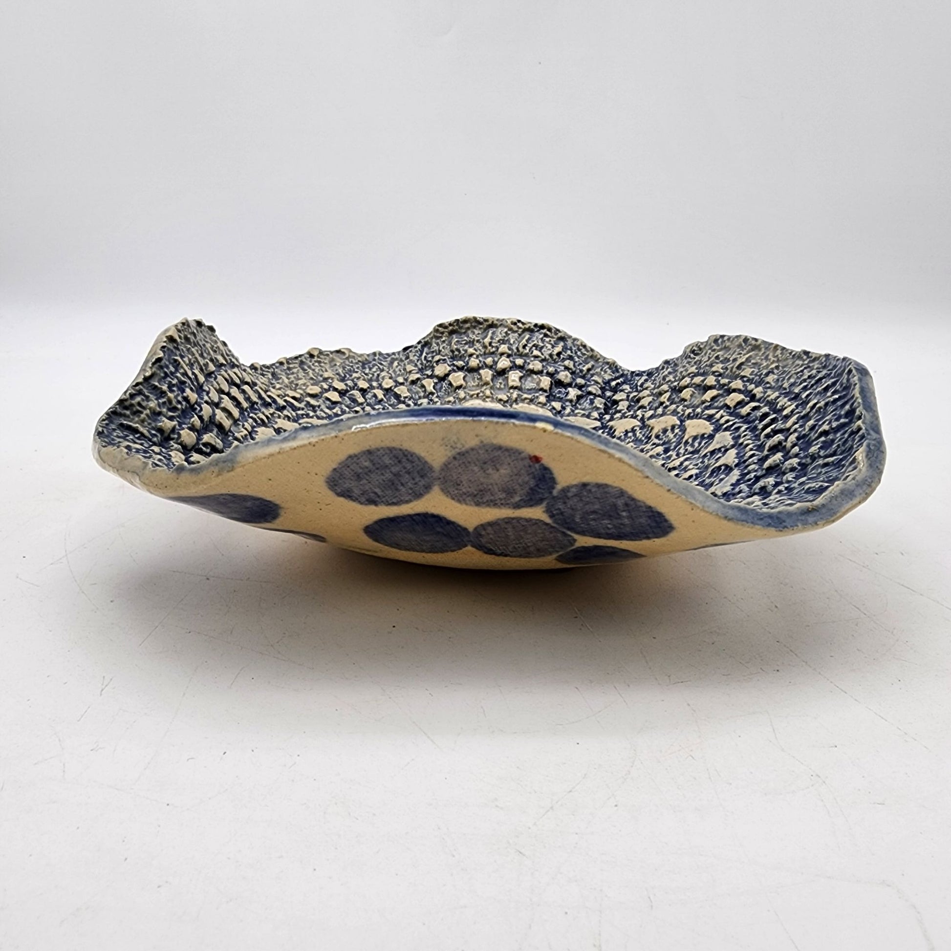This pottery bowl merges artistry and function with its intricate lace pattern and vintage blue tones. Ideal as a centerpiece or for serving.