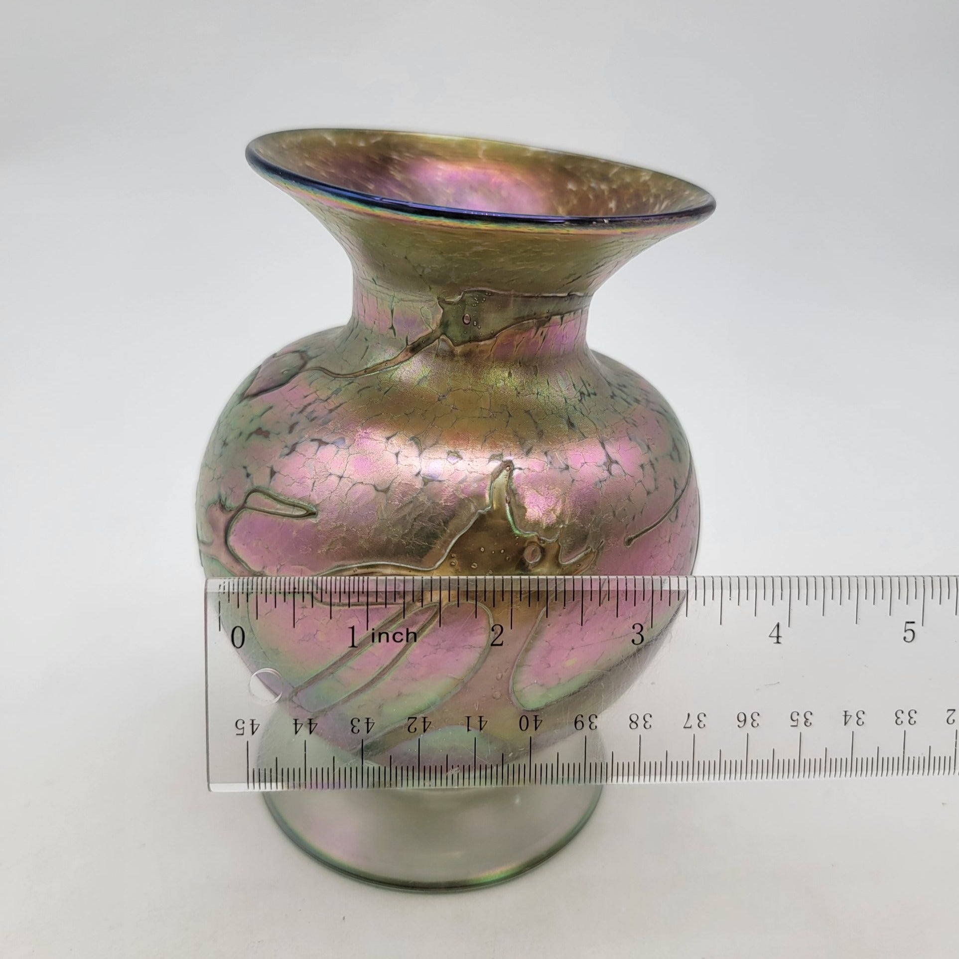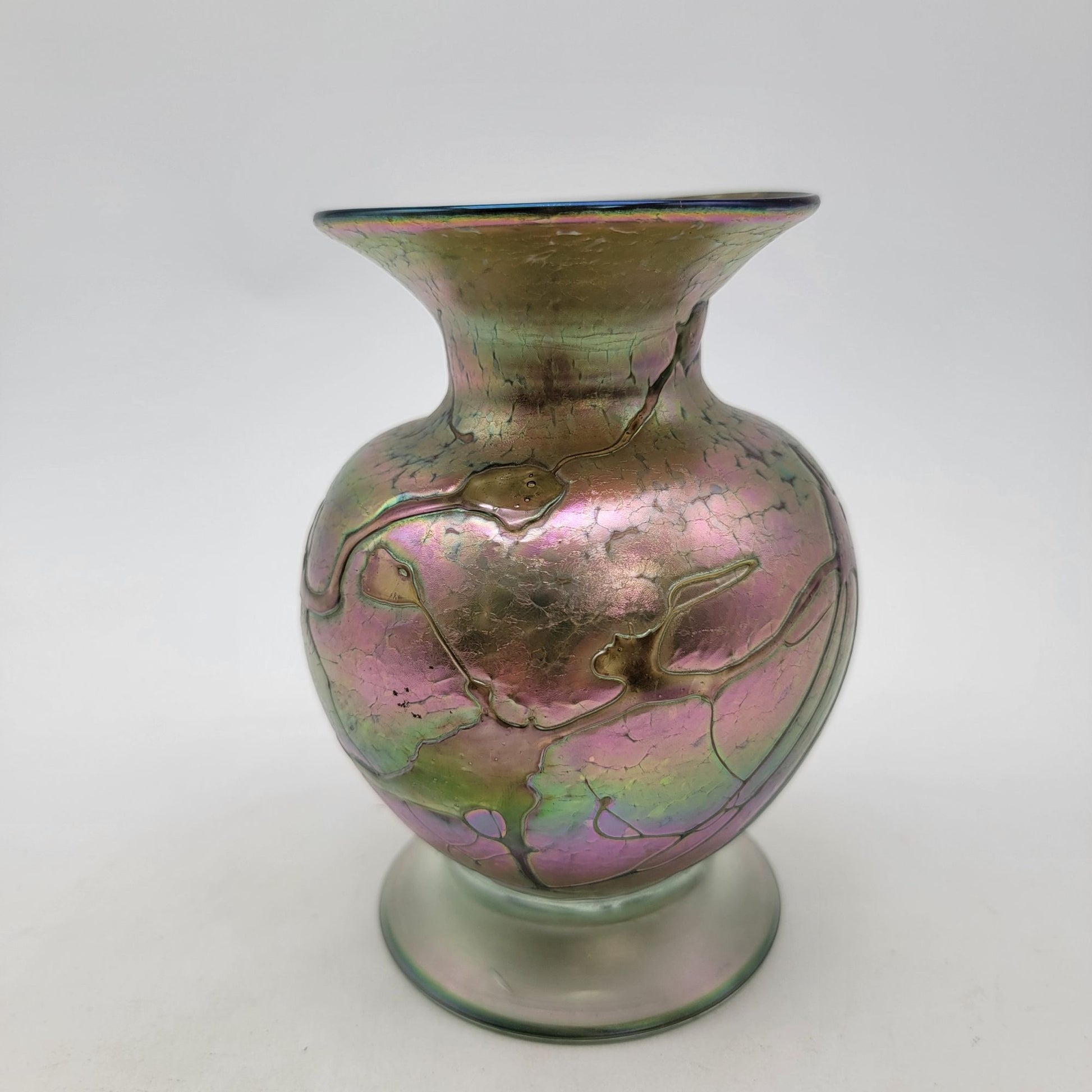 This vintage art glass vase showcases a shimmering iridescent finish with a naturalistic design, reflecting timeless craftsmanship and antique charm. It is signed but hard to make out.