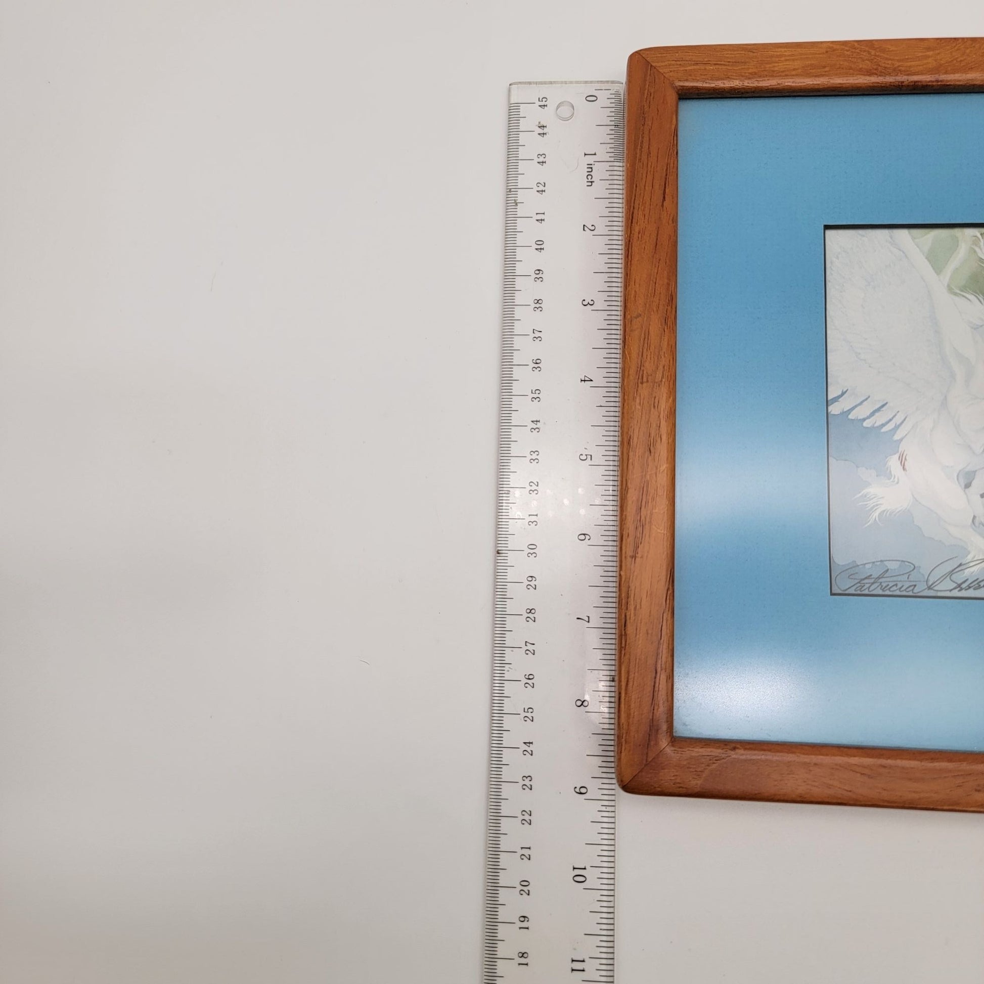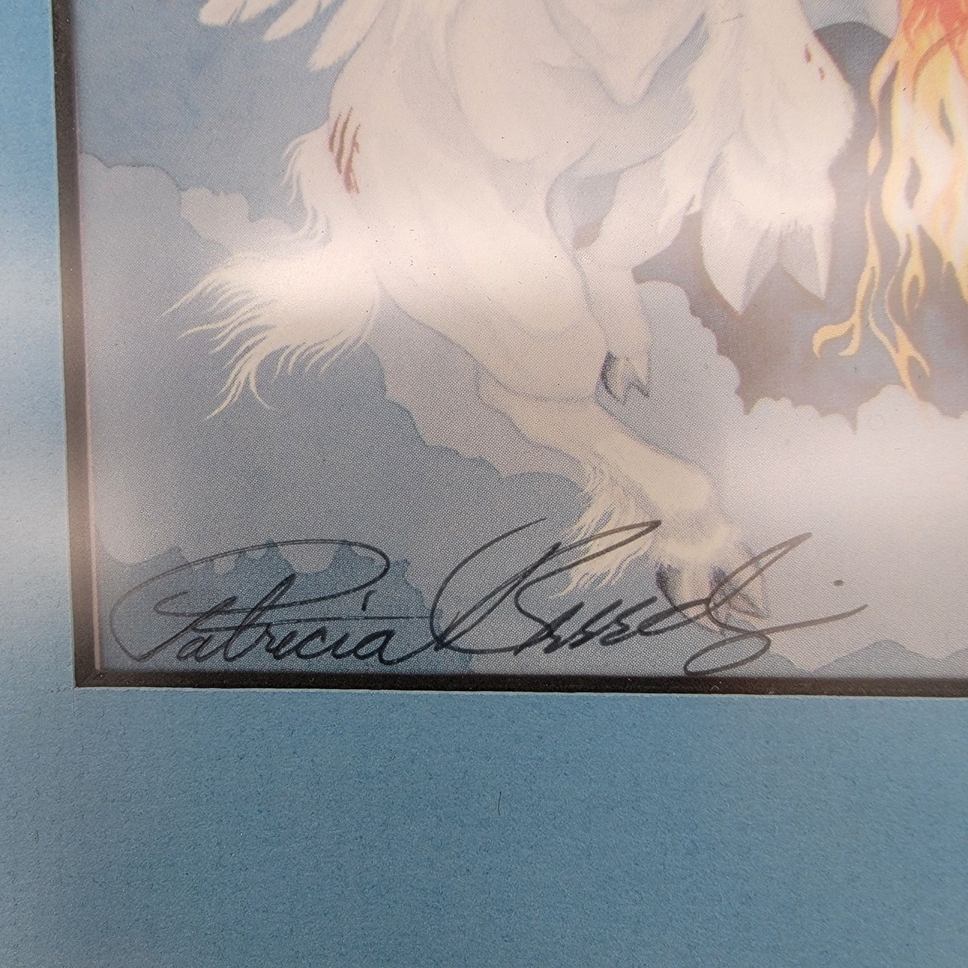 Dive into a mythical skirmish captured by P.D. Breeding with this signed "Into the Death" art print. Framed in warm wood, it showcases a fierce dragon battling a celestial steed amidst swirling clouds. The intricate details and vibrant hues transport you to a world of fantasy and valor.