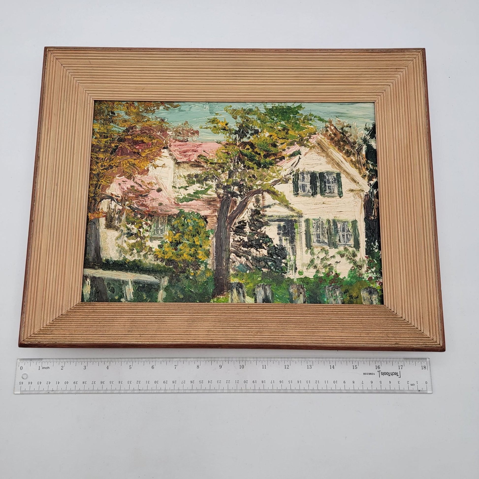 This vintage impasto painting depicts a charming house surrounded by lush greenery, rendered with textured brushstrokes. Encased in a sturdy wooden frame, it exudes timeless artistry and nostalgia.