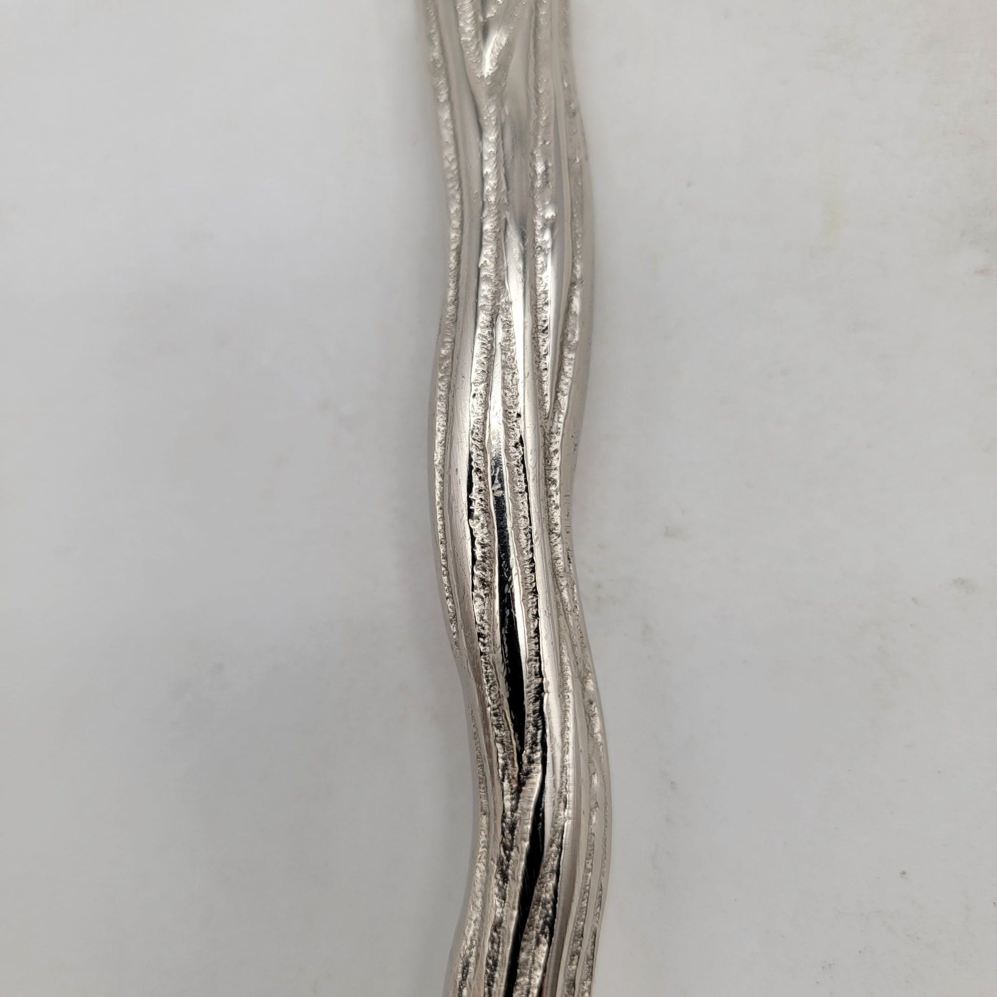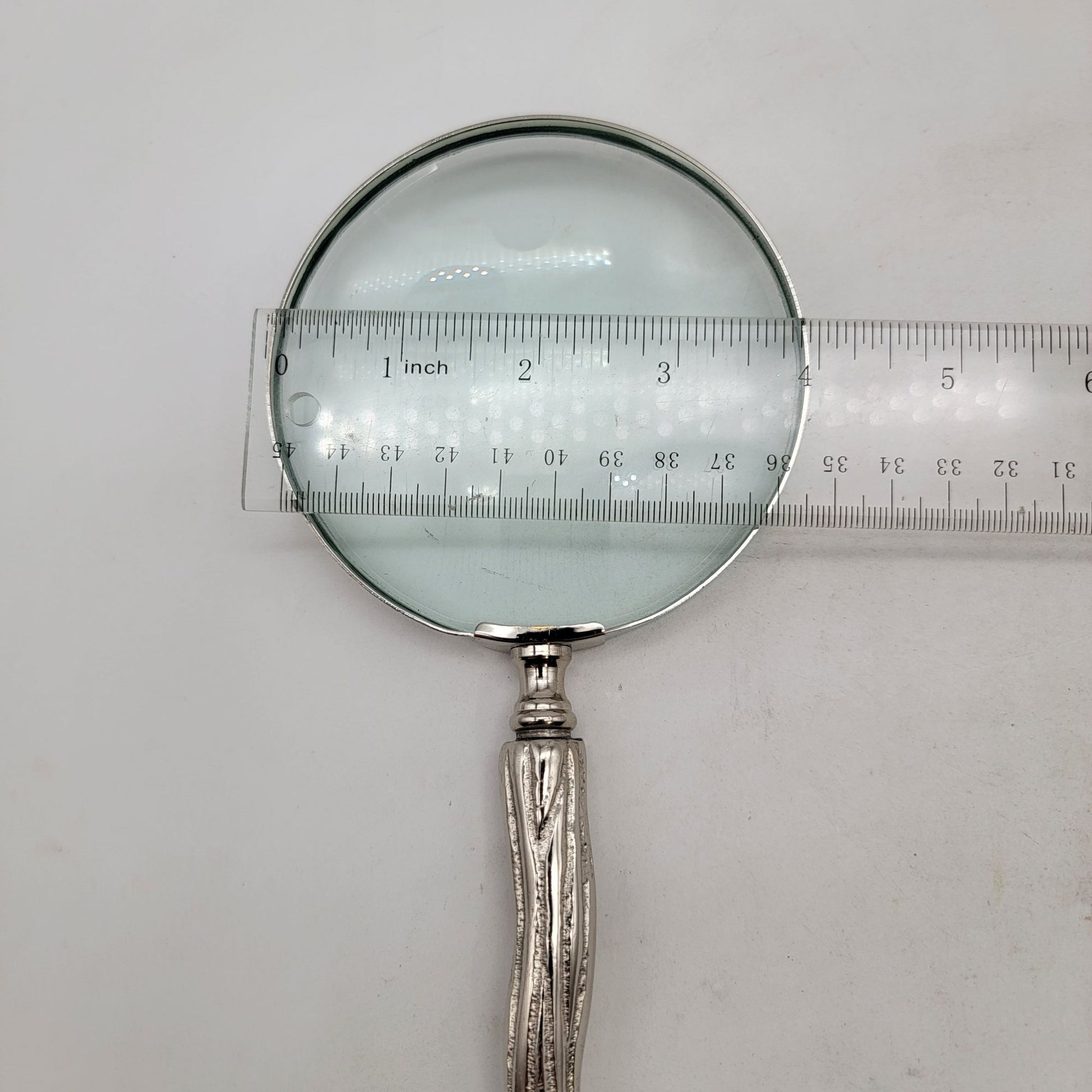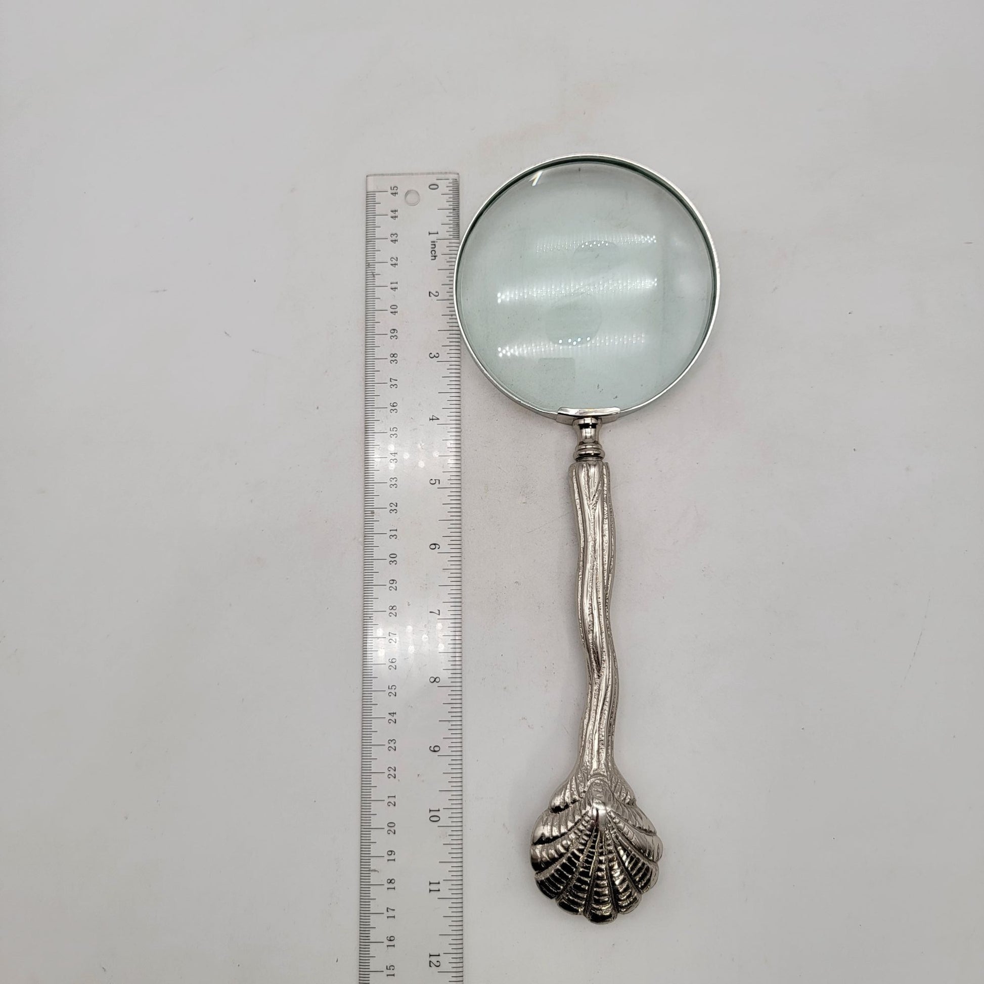 This magnifying glass features a vintage-style silver tone handle with an elegant scallop shell design. Its sturdy construction and clear lens make it a reliable tool for detailed examination. An ideal addition to antique collections or as a stylish desk accessory.