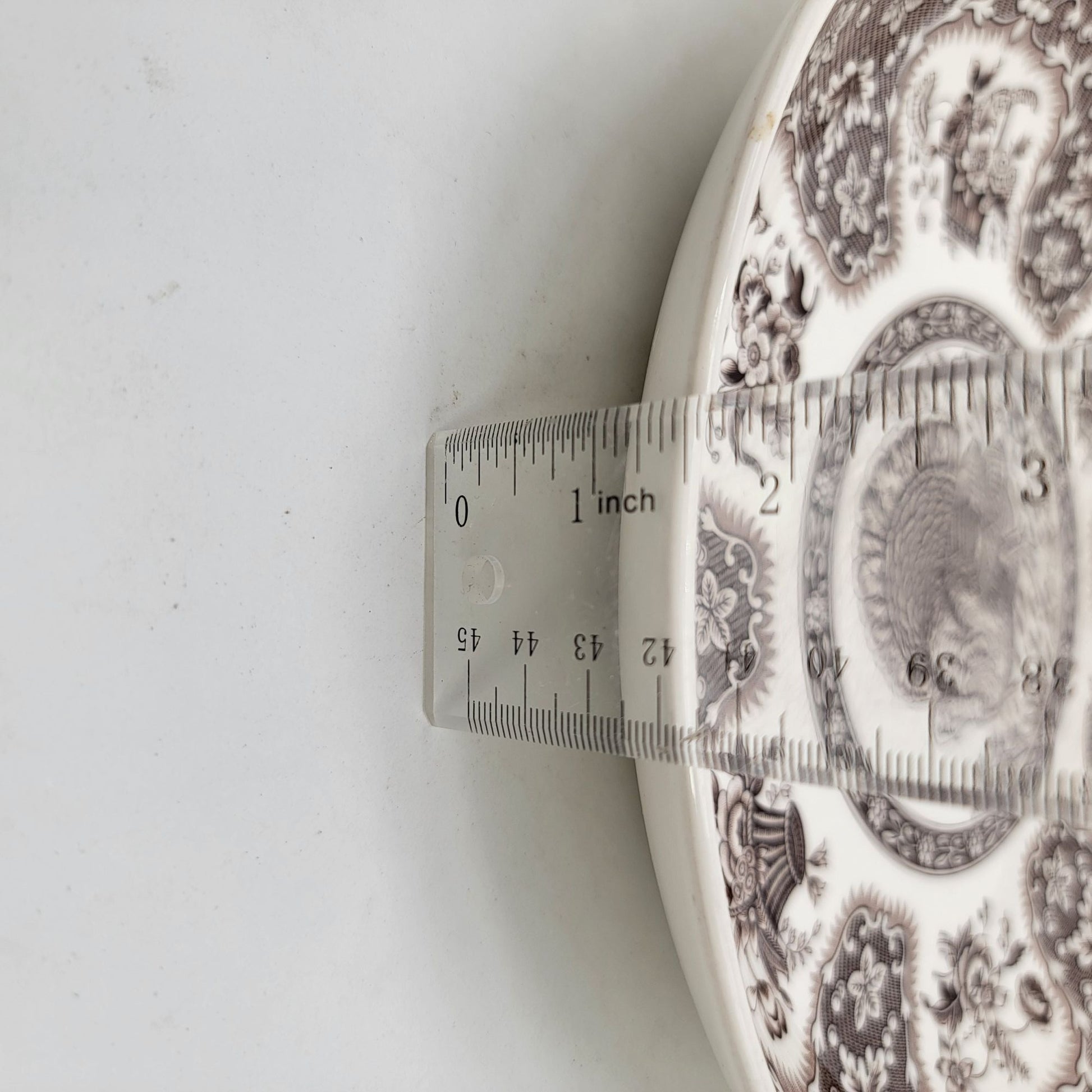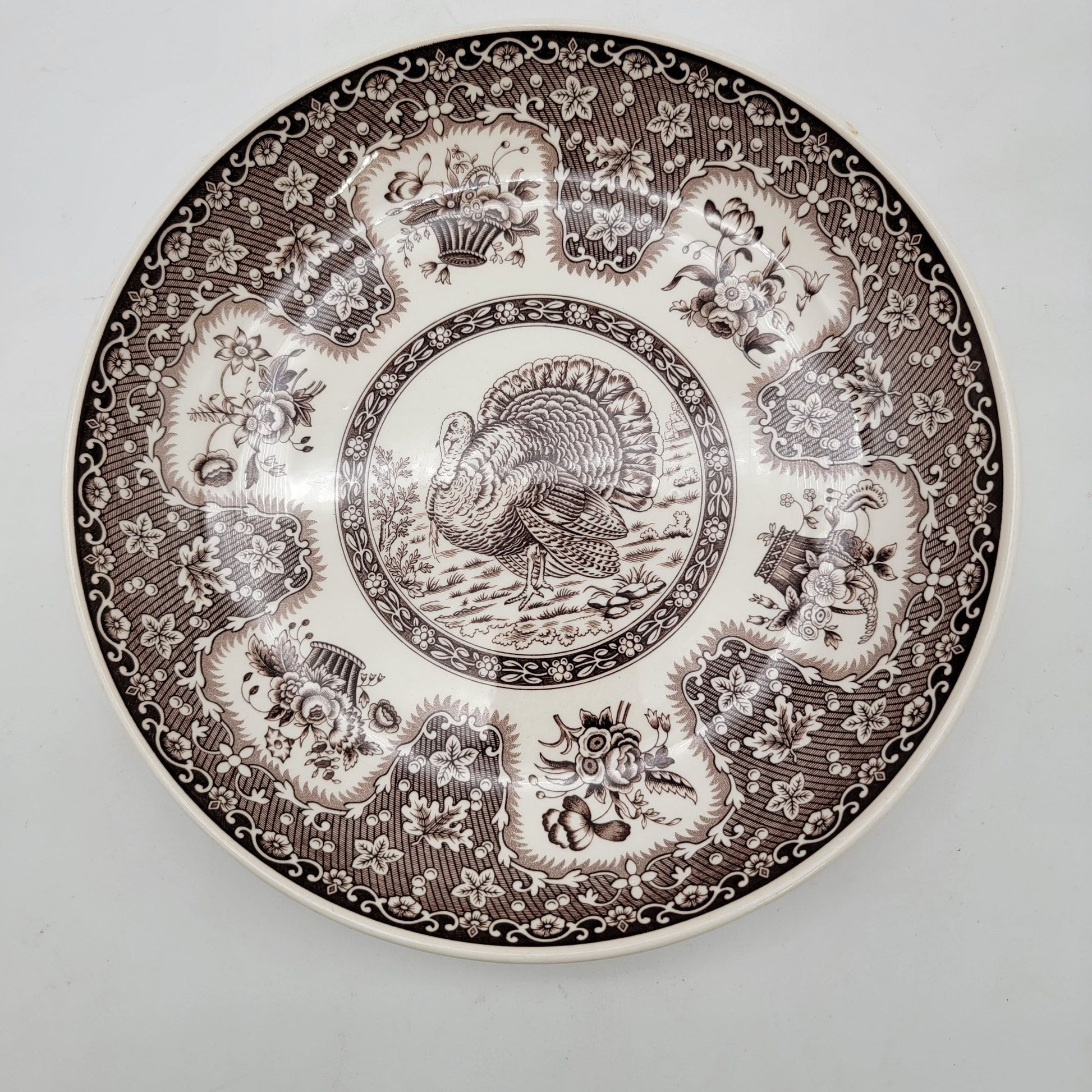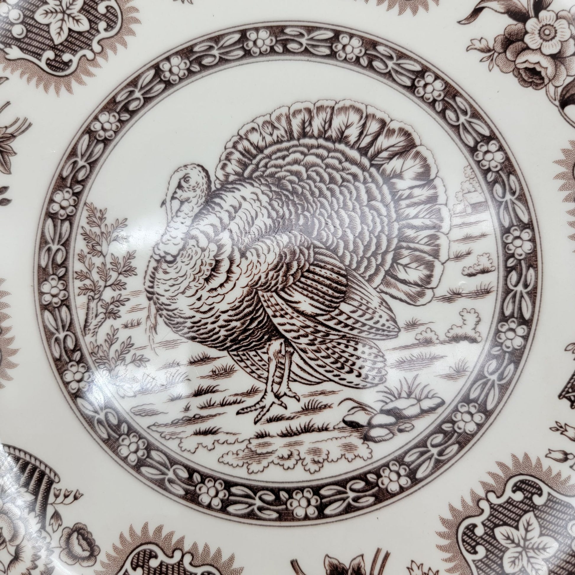 This vintage Spode England plate showcases a classic turkey design in a rich brown hue. Crafted with fine ceramic, it features intricate floral motifs surrounding the central turkey image. A perfect addition for those who appreciate the charm of antique tableware, this plate embodies both elegance and history.